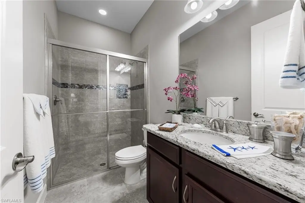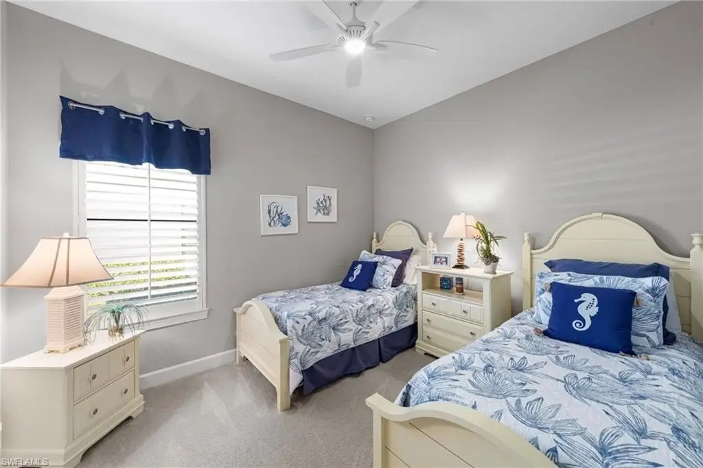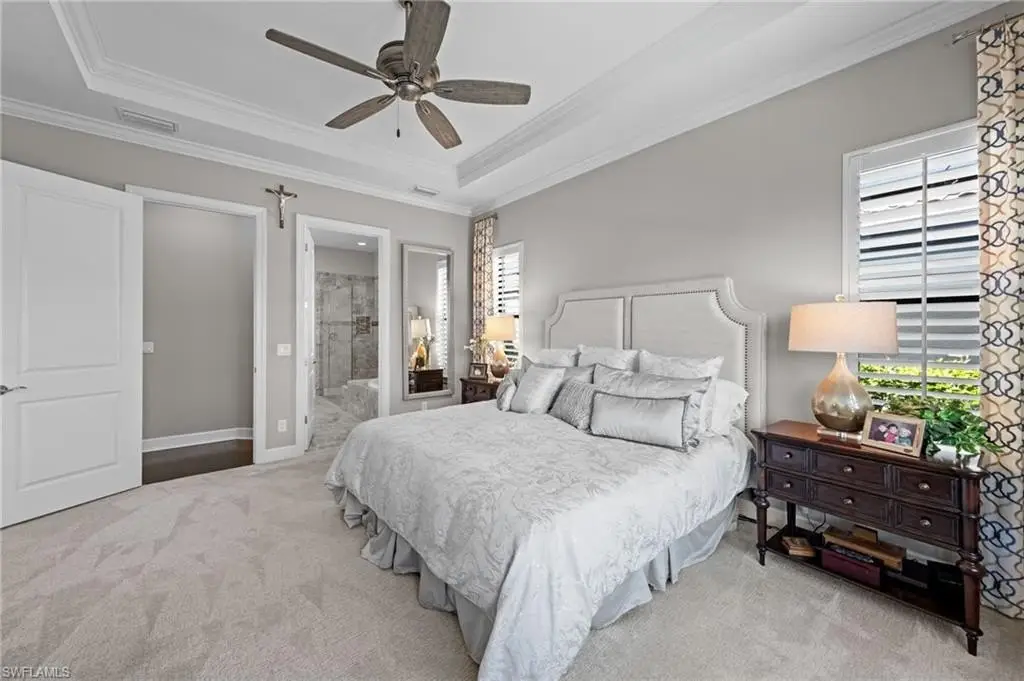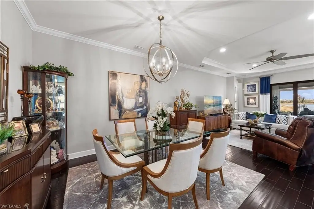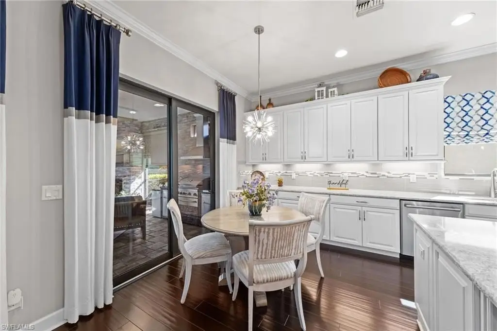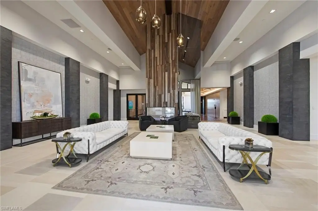LIVE THE GOOD LIFE AT ESPLANADE GOLF AND COUNTRY CLUB! GOLF MEMBERSHIP INCLUDED!!! Experience resort-style living in one of Naples most sought-after Golf and Country Club communities. This stunning Lazio-style home offers SERENE LONG LAKE AND GOLF COURSE VIEWS with exceptional privacy, creating the perfect setting for relaxed luxury. A beautifully landscaped entry welcomes you inside to a bright, open-concept floor plan featuring a spacious great room and dining area seamlessly connected to an extended, gourmet kitchen. Enjoy white cabinetry, quartz countertops, stainless steel appliances, a natural gas cooktop, and a charming breakfast nook—ideal for everyday living or entertaining. Custom window treatments and warm wood flooring throughout the main living area complete the home’s look of comfortable sophistication. The primary suite offers a private retreat with a spa-inspired bathroom featuring dual vanities, a walk-in shower, soaking tub, and a generous walk-in closet. Two guest suites, each with its own private bath, ensure comfort and privacy for overnight visitors, while the den provides flexible space for a home office or sitting room. Step through two sets of sliding glass doors to the outdoor living area with picture window screening, designed to maximize lake and golf views . El fresco entertaining is effortless with with a well equipped outdoor kitchen, and relaxing on cool nights is comforting by the gas fireplace with stone surround. The heated pool beckons you for an afternoon swim. This cozy outdoor living area offers the perfect venue for morning coffee, afternoon swims, or evening gatherings. Additional features include: Hurricane shutters and screens for extra protection of covered lanai area and year-round comfort, IMPACT WINDOWS AND DOORS THROUGHOUT for peace of mind, and additional 2025 improvements including a professionally epoxied garage floor, new pool filter, new microwave, new garbage disposal, and extensive landscaping. At Esplanade Golf & Country Club, every day feels like a vacation. Enjoy world-class amenities including a resort-style pool with cabanas and the adjoining Bahama Bar for casual food and beverage, tennis, pickleball, and bocce. The popular Wellness center offers a state of the art fitness center with exercise classes and the luxurious Koquina Day Spa. The amenity center is a popular place for card games and other social gatherings and the dog park offers an opportunity for our fur babies to socialize. Enjoy the 14 miles of walking and biking trails. The 18-hole private golf course is the crown jewel of the community and 15,000 sq. ft. clubhouse offers indoor and outdoor dining, a full bar, wine tasting room, wine lockers, and a cozy café. In addition to golf, all club amenities, landscaping, and irrigation, are included in dues of $3,412 per quarter! Located in Flood Zone X, NO FLOOD INSURANCE REQUIRED! Best of all, this beautiful home is offered TURNKEY FURNISHED!!