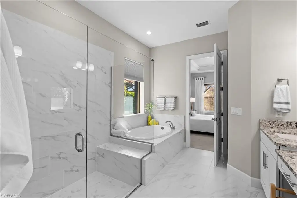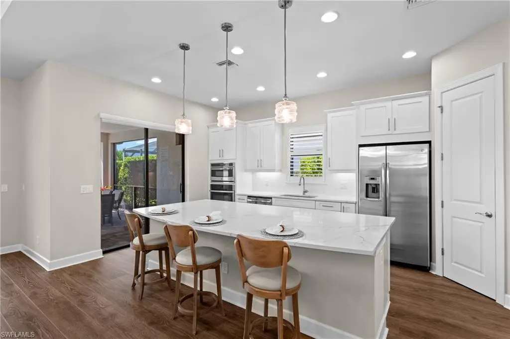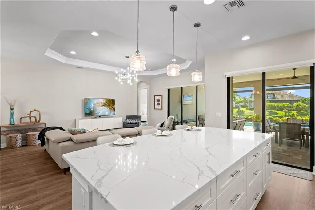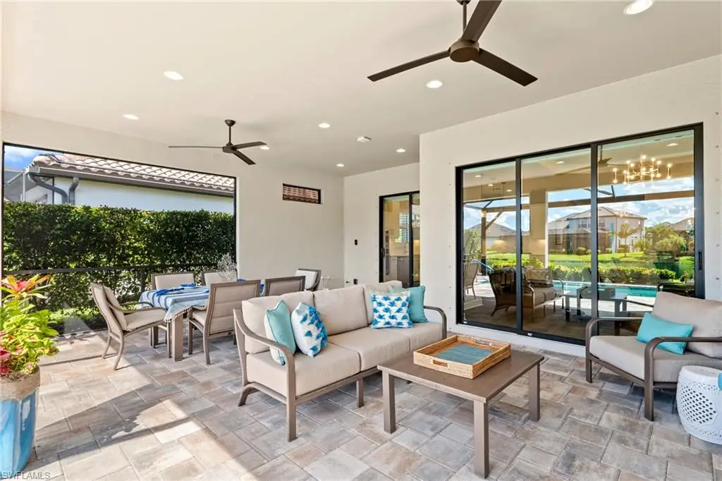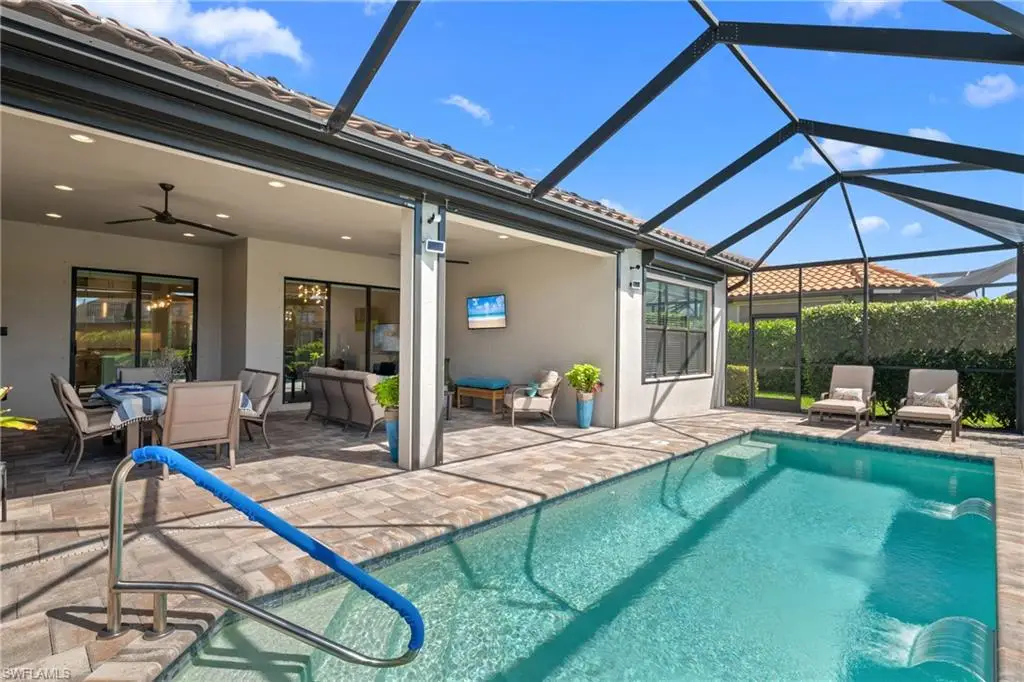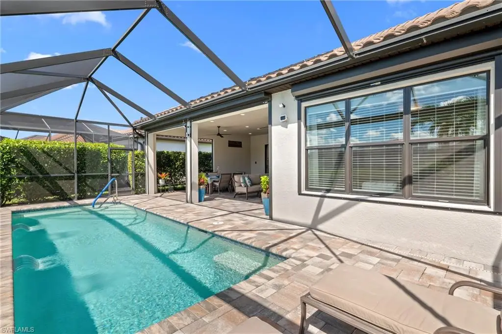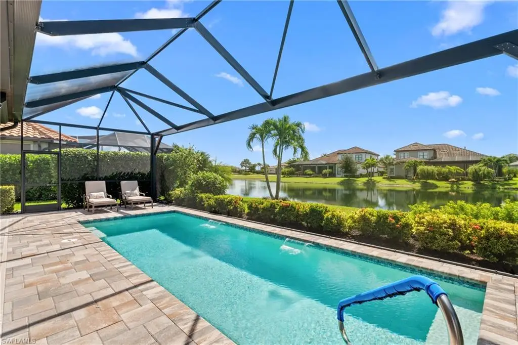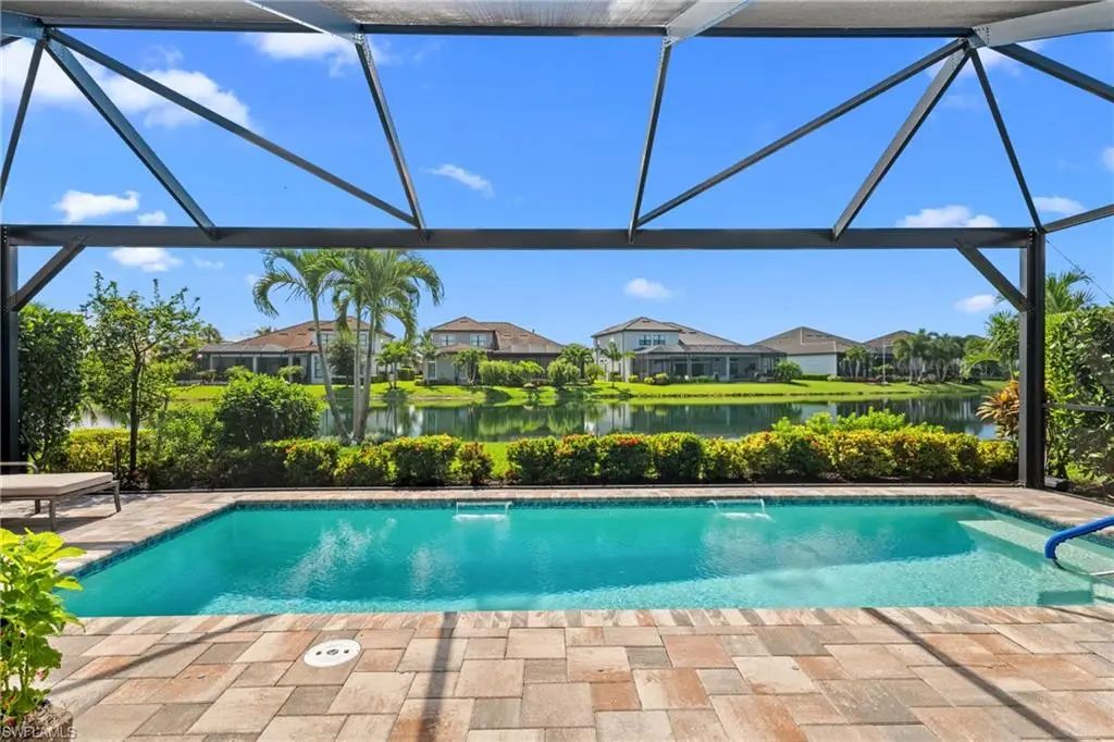 LIVE A VACATION LIFESTYLE IN ESPLANADE! FULL GOLF MEMBERSHIP INCLUDED! Built in 2019, this Lazio model offers a perfect mix of luxury, comfort, and relaxation with its lakefront setting and SOUTHERN rear exposure, which make this home light and bright. The layout, with 3 bedrooms, a den, and 3 full bathrooms has been upgraded with high-end features like the GE appliance package (including GAS cooktop, wall oven, and built-in wall convection microwave), beautiful quartz countertops throughout the kitchen & baths, luxury laminate floors throughout the common areas & den, upgraded sculpted carpet in the bedrooms, and more. The spacious open great room flows out to an extended covered lanai through two sets of sliding glass doors, with dedicated outdoor living and dining areas (pre plumbed for an outdoor kitchen with gas, water, and electric - ideal for entertaining. The GAS and SOLAR heated saltwater pool with two water features and picture window screen cage framing wide and long lake views, making this space both relaxing and ideal for social gatherings. The primary suite offers a spacious bedroom with three windows overlooking pool & lake, luxurious bath with soaking tub and walk-in shower with frameless glass shower enclosure, and large walk-in closet. There are also many added features such as a WHOLE HOUSE GENERATOR, ELECTRIC MOTORIZED ROLL DOWN HURRICANE SCREENS ON THE LANAI, roll down and accordion style hurricane shutters on all windows, three tray ceilings, enhanced landscaping, upgraded Voss bathroom/shower fixtures, and more! The EXTENDED AIR CONDITIONED GARAGE (24X20) with epoxied floor and the large laundry room with cabinetry only add to the home's convenience. Esplanade Golf & Country Club of North Naples offers a true Lifestyle Community with world-class amenities, including a resort pool with cabanas and the popular Bahama Bar, tennis, pickleball, bocce, a 14-mile network of bike/walking trails, and an 18-hole private golf course. The impressive 15,000 Sq Ft clubhouse features a restaurant, bar, wine-tasting room, wine lockers, and a Starbucks-style cafT. Best of all, the property's landscaping, irrigation, golf membership, and all community amenities are covered under a quarterly fee of just $3,412 no additional fees or memberships required! Don't miss your opportunity to own this exceptional home in one of Naples' most sought-after communities. Schedule your tour of this stunning home and Esplanade Golf & Country Club today!