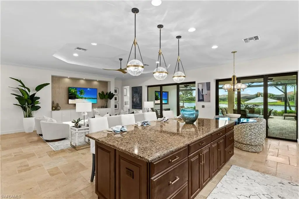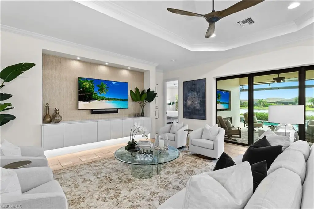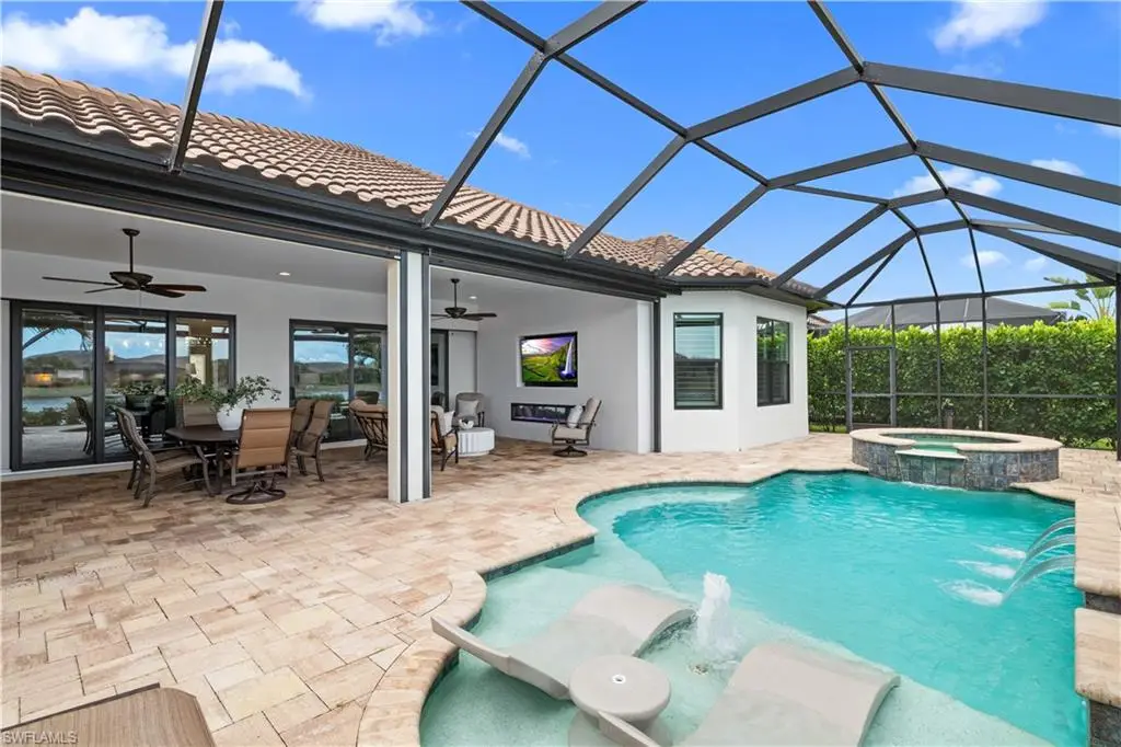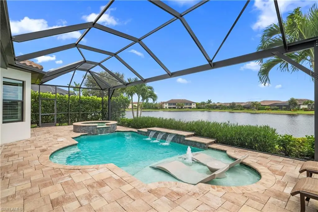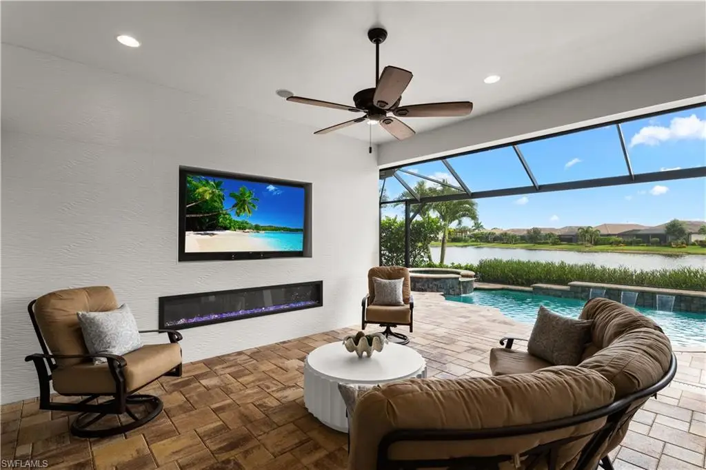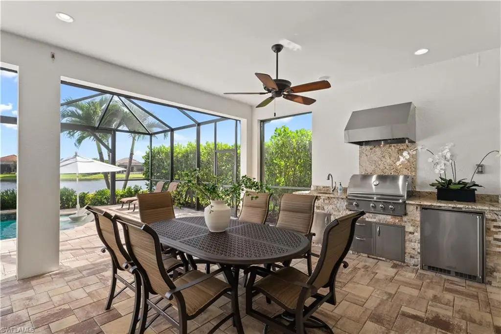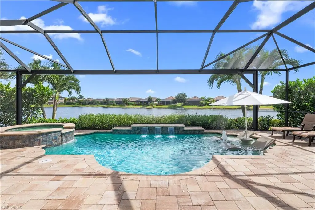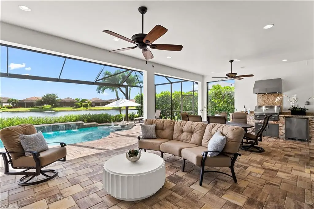 LIVE A VACATION LIFESTYLE IN ESPLANADE! FULL GOLF MEMBERSHIP INCLUDED! Step into this highly upgraded "Palazzio" offering 3 spacious bedrooms, den, 3 full bathrooms, and 3,116 sq ft under air. With oversized rooms throughout, the open great room floorplan creates a seamless flow for entertaining and comfortable living. Two sets of pocketing sliding glass doors invite you to the expanded lanai, where you can enjoy picturesque wide lake views and SOUTHERN EXPOSURE, making this outdoor space an absolute retreat. The private pool area boasts a gas-heated saltwater pool with a raised spa and sunshelf. For those who love outdoor living, the lanai is equipped with an outdoor kitchen, feature wall with an LED fireplace & TV, all enclosed by electric motorized roll-down hurricane screens, ensuring year-round enjoyment. Inside, the home features rich travertine marble tile throughout the entire home. The expanded kitchen has been fully updated with white raised-panel cabinetry with contrasting wood tone island, Cambria quartz countertops, a stylish tile backsplash, and top-of-the-line GE Cafe appliances, including wall oven, convection microwave, wine cooler, and GAS cooktop. Additional luxury finishes include: HURRICANE IMPACT GLASS WINDOWS/DOORS; impact glass double front doors with matching sidelights; tandem style 3 car garage with built-in cabinetry & finished garage floor; great room built-in with custom cabinets, wall detail, and wall mounted TV; expanded primary & front guest bedrooms with bay windows; special order lights/chandeliers; finished closet cabinets throughout; crown molding & plantation shutters throughout; recessed lights in every room; freshly painted interior; spacious Laundry Room with cabinetry; tankless GAS hot water heater; 8' solid core doors/10' ceilings; extensive landscaping with landscaping lighting; and more! Esplanade Golf & Country Club of North Naples offers a true "Lifestyle Community" with world-class amenities, including a resort pool with cabanas and the popular "Bahama Bar" tennis, pickleball, bocce, a 14-mile network of bike/walking trails, and an 18-hole private golf course. The impressive 15,000 Sq Ft clubhouse features a restaurant, bar, wine-tasting room, wine lockers, and a Starbucks-style cafe. Best of all, the property's landscaping, irrigation, golf membership, and all community amenities are covered under a quarterly fee of just $3,434ùno additional fees or memberships required! Don't miss your opportunity to own this exceptional home in one of Naples' most sought-after communities. Schedule your tour of this stunning home and Esplanade Golf & Country Club today!
