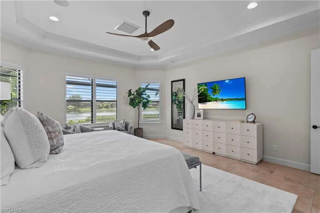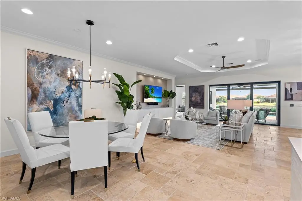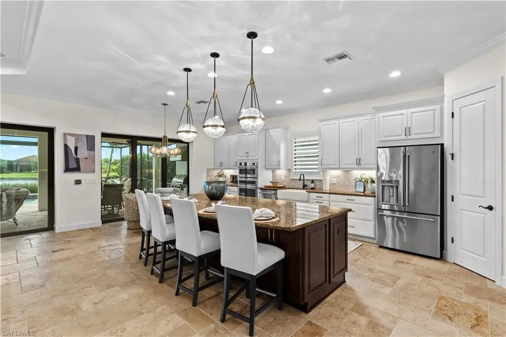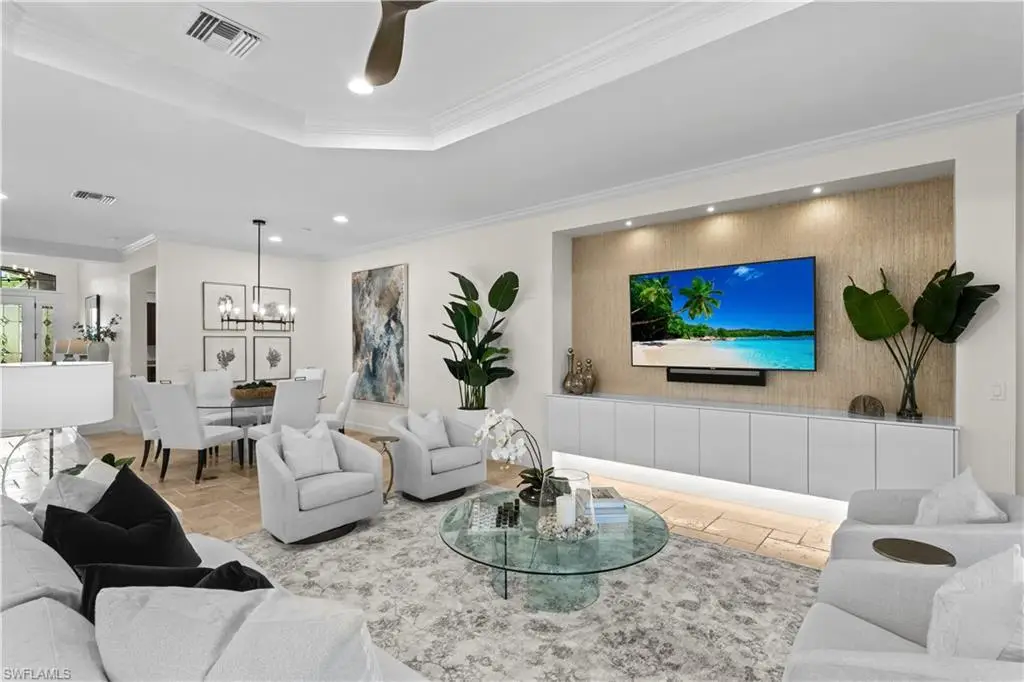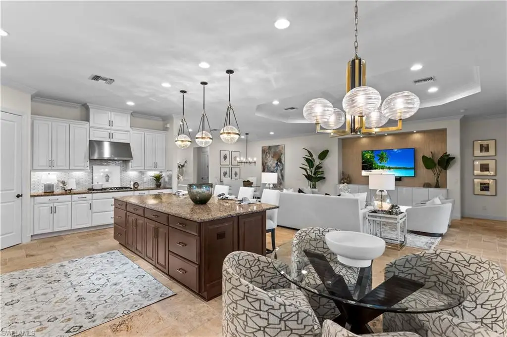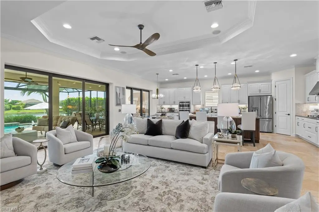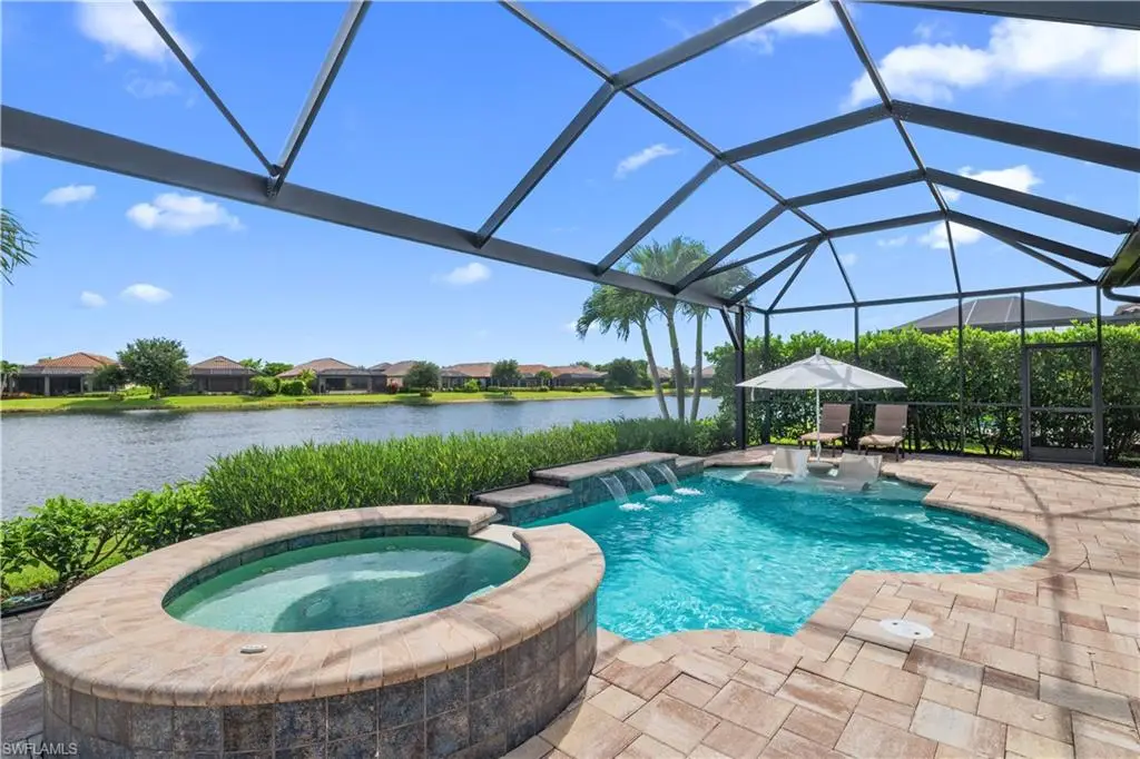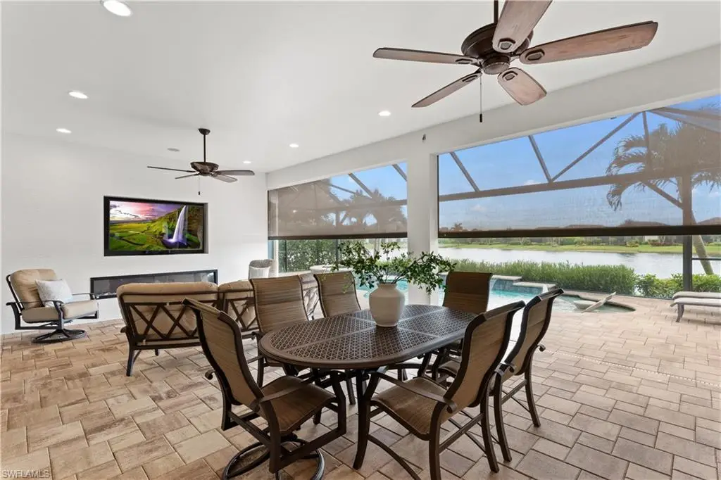 LIVE A VACATION LIFESTYLE IN ESPLANADE! FULL GOLF MEMBERSHIP INCLUDED! Step into this highly upgraded "Palazzio" offering 3 spacious bedrooms, den, 3 full bathrooms, and 3,116 sq ft under air. With oversized rooms throughout, the open great room floorplan creates a seamless flow for entertaining and comfortable living. Two sets of pocketing sliding glass doors invite you to the expanded lanai, where you can enjoy picturesque wide lake views and SOUTHERN EXPOSURE, making this outdoor space an absolute retreat. The private pool area boasts a gas-heated saltwater pool with a raised spa and sunshelf. For those who love outdoor living, the lanai is equipped with an outdoor kitchen, feature wall with an LED fireplace & TV, all enclosed by electric motorized roll-down hurricane screens, ensuring year-round enjoyment. Inside, the home features rich travertine marble tile throughout the entire home. The expanded kitchen has been fully updated with white raised-panel cabinetry with contrasting wood tone island, Cambria quartz countertops, a stylish tile backsplash, and top-of-the-line GE Cafe appliances, including wall oven, convection microwave, wine cooler, and GAS cooktop. Additional luxury finishes include: HURRICANE IMPACT GLASS WINDOWS/DOORS; impact glass double front doors with matching sidelights; tandem style 3 car garage with built-in cabinetry & finished garage floor; great room built-in with custom cabinets, wall detail, and wall mounted TV; expanded primary & front guest bedrooms with bay windows; special order lights/chandeliers; finished closet cabinets throughout; crown molding & plantation shutters throughout; recessed lights in every room; freshly painted interior; spacious Laundry Room with cabinetry; tankless GAS hot water heater; 8' solid core doors/10' ceilings; extensive landscaping with landscaping lighting; and more! Esplanade Golf & Country Club of North Naples offers a true "Lifestyle Community" with world-class amenities, including a resort pool with cabanas and the popular "Bahama Bar" tennis, pickleball, bocce, a 14-mile network of bike/walking trails, and an 18-hole private golf course. The impressive 15,000 Sq Ft clubhouse features a restaurant, bar, wine-tasting room, wine lockers, and a Starbucks-style cafe. Best of all, the property's landscaping, irrigation, golf membership, and all community amenities are covered under a quarterly fee of just $3,434ùno additional fees or memberships required! Don't miss your opportunity to own this exceptional home in one of Naples' most sought-after communities. Schedule your tour of this stunning home and Esplanade Golf & Country Club today!