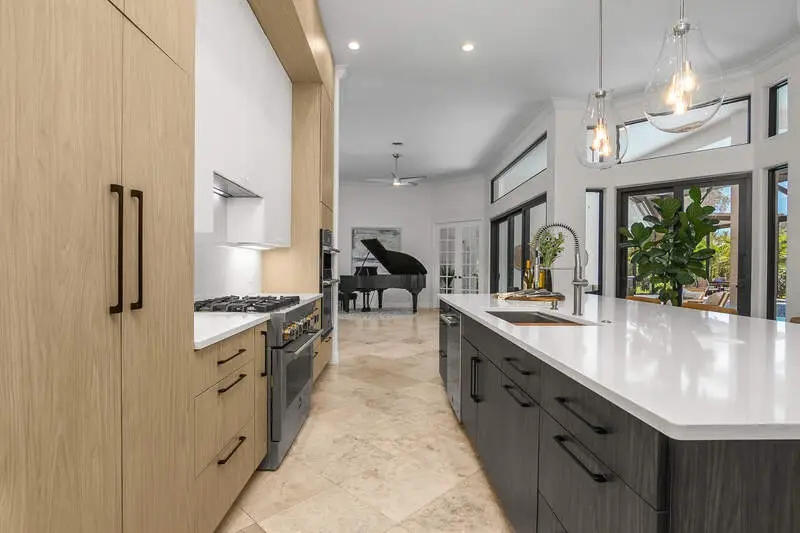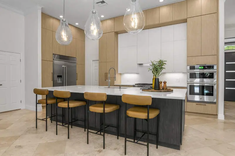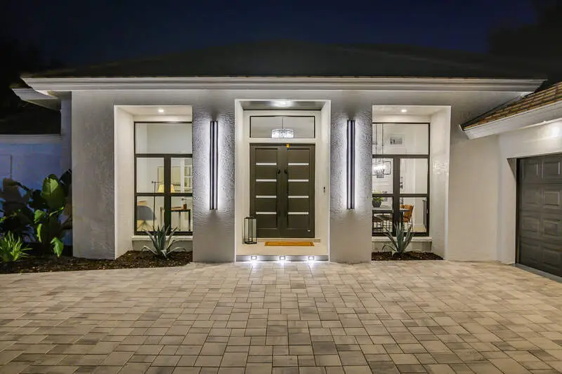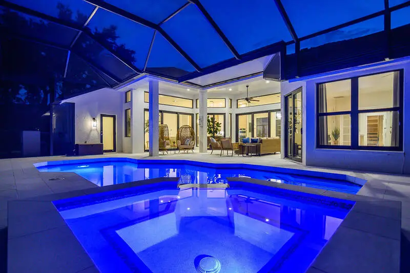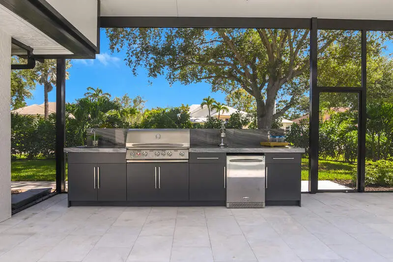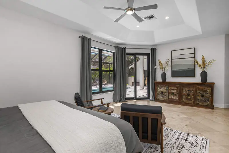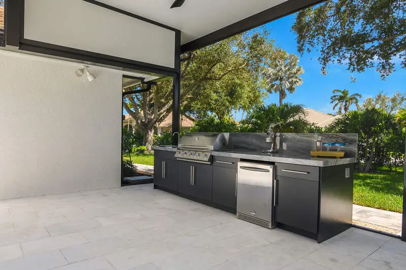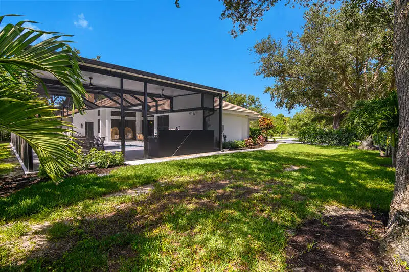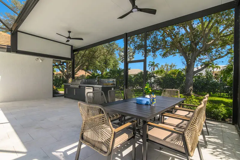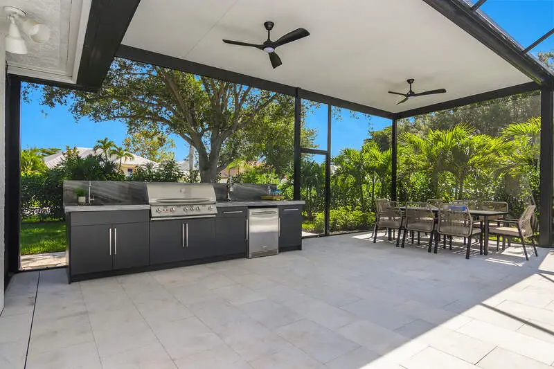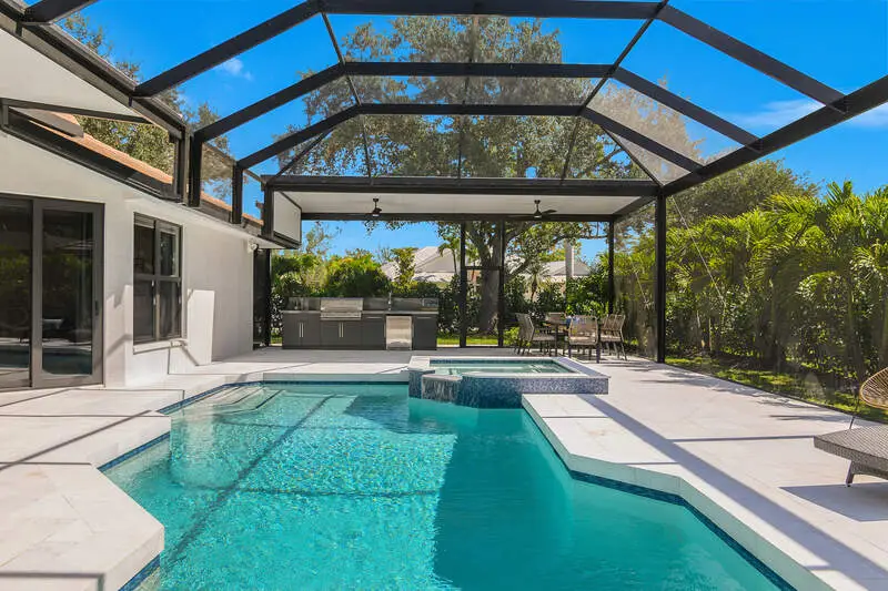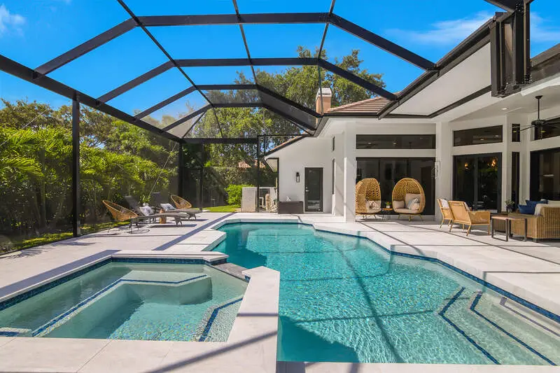 Luxurious, private, and serene, this beautifully renovated home is an oasis nestled in a desirable, quiet location within the heart of the coveted neighborhood of Monterey. Thoughtfully updated & meticulously maintained both inside and out, this home enjoys an abundance of light with soaring 11.5 foot ceilings, top-of-the-line finishes and premium appliances. At the heart of the home, a custom 11 foot island anchors the well-equipped chef's kitchen with sleek floor-to-ceiling custom cabinetry with NEW JennAir RISE appliances, including 48" refrigerator, gas range and double wall oven with convection/microwave. The renovated bathrooms have been gorgeously updated with Taj Mahal quartzite countertops and custom cabinetry. A dedicated office with floor-to-ceiling custom built-in cabinetry offers a stylish and functional work/flex space. Step outside to your own private sanctuary, complete with NEW stunning picture-window screen cage with unique & functional shade/rain protection roof systems, NEW outdoor kitchen, & NEWLY refinished pool/spa, all framed by lush hedges and tropical palms with dramatic landscape lighting. Countless upgrades provide efficiency as well as peace of mind, including NEW impact windows & doors, NEW A/C, NEW instant hot water heater, NEW pool equipment, NEW paver driveway, newer roof and more! With 24-hour gate guard, 3 har tru tennis courts, community pool/clubhouse, sport/pickleball court, neighborhood events & just minutes to beaches, downtown, shopping, & schools - Make this your next move!