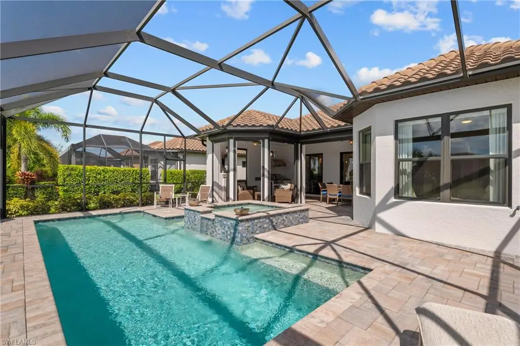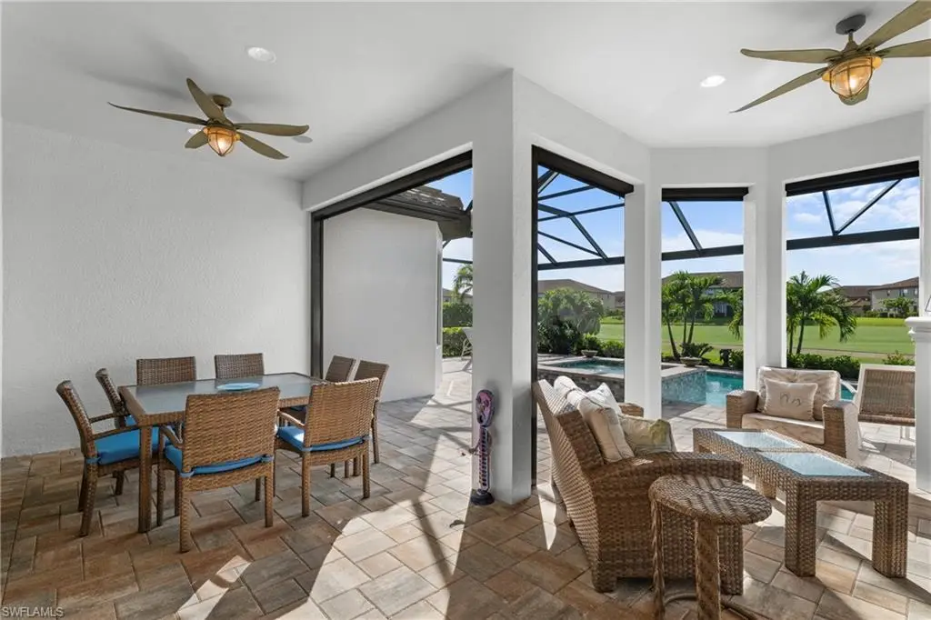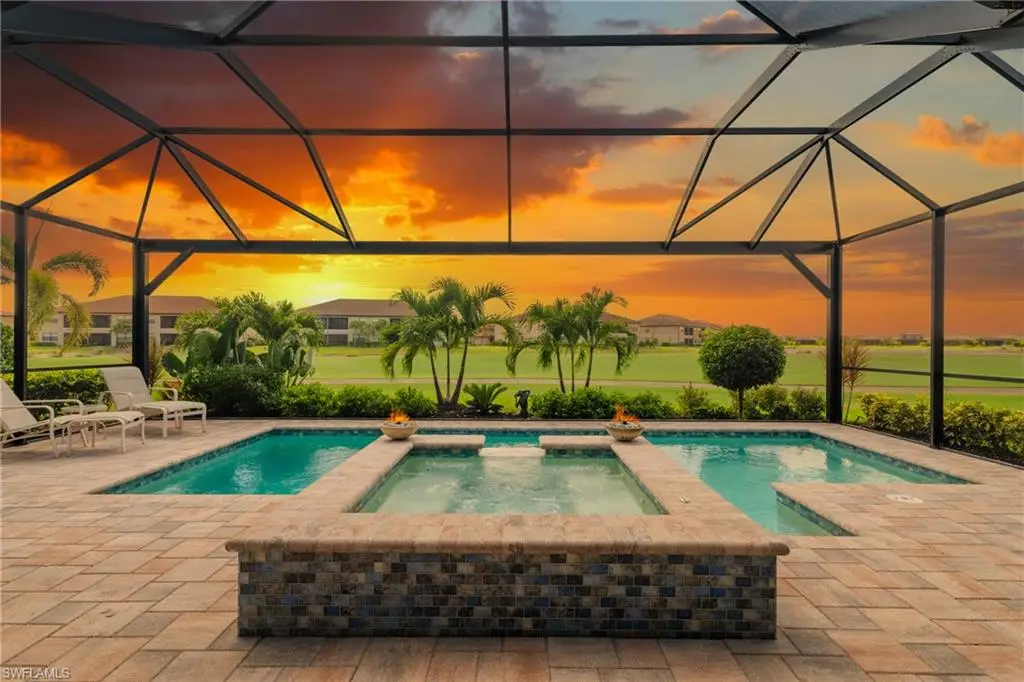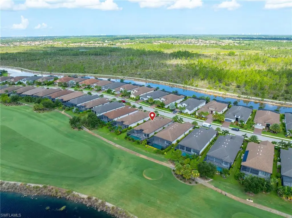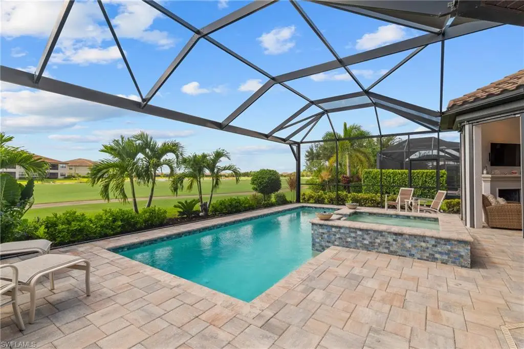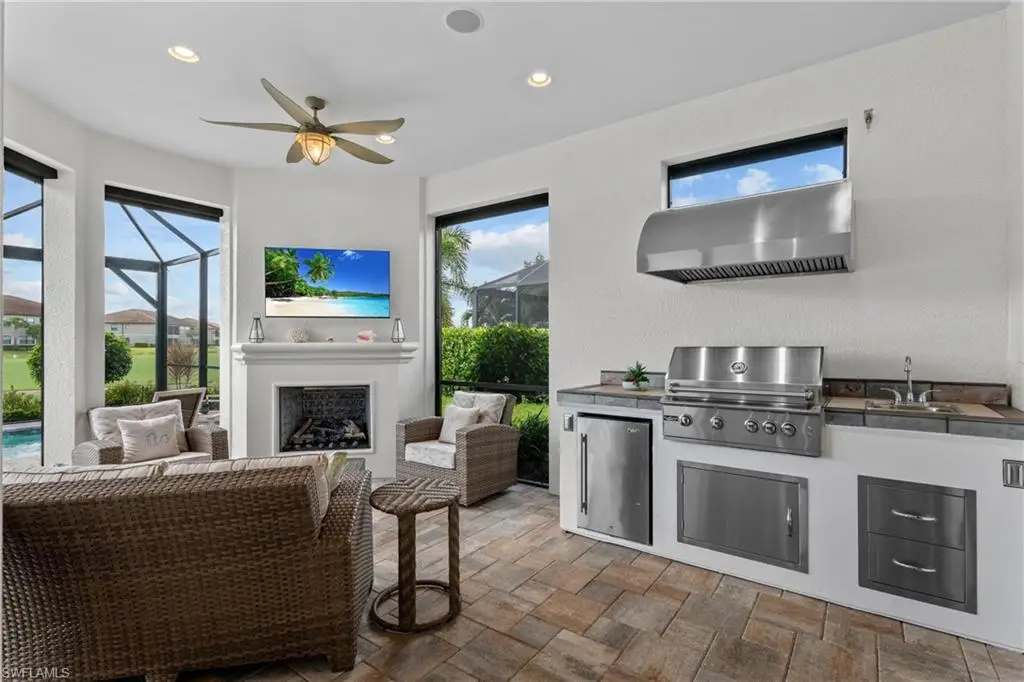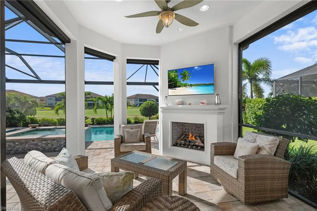 LIVE A VACATION LIFESTYLE IN ESPLANADE! FULL GOLF MEMBERSHIP INCLUDED! Built in 2020, this immaculate expanded "Lazio" offers sunrise views overlooking the 16th fairway & lake and offers a spacious floorplan consisting of three Bedrooms plus Den, three Full Baths, extended two car garage, and nearly 2400 sq ft under air. An open great room style floorplan with two sets of sliding glass doors to the extended covered lanai complete with outdoor kitchen and gas fireplace make this the perfect home for entertaining. Catch some sun around the GAS heated salt water pool (with auto fill) and raised spa enclosed with a picture window screen cage highlighting this home's unobstructed view. A long list of special features include: HURRICANE IMPACT WINDOWS/DOORS; ELECTRIC ROLL DOWN HURRICANE SCREENS on the lanai; expanded kitchen with additional level V cabinetry, Cambria quartz countertops, over/under cabinet lighting, and pantry with custom shelving; GE Cafe appliances including wine cooler, GAS cooktop, wall oven, wall convection microwave, and French door refrigerator; Expanded primary & front guest bedrooms with bay windows; Primary suite walk in closet with custom shelving/drawers including center storage island; Luxurious baths complete with quartz countertops, upgraded tile, Level V cabinetry, upgraded toilets, frameless shower enclosures, and upgraded "Voss" shower fixtures including primary bath rain shower & hand held; hurricane impact front door with matching sidelights; SONOS in-ceilings speakers; special order chandeliers/light fixtures throughout; extended garage with built-in storage cabinets, ceiling racks, & attic access pull down stairs; spacious Laundry Room with cabinetry; crown molding; tankless GAS hot water heater; 8' solid core doors/10' ceilings; extensive landscaping with landscaping lighting; and more! Esplanade Golf & Country Club of North Naples is a true "Lifestyle Community" with something for everyone: resort pool complete with cabanas & poolside "Bahama Bar"; tennis; pickleball; bocce; Koquina Day Spa; fitness center; dog parks; 14 miles of bike/walking trails; 18 hole private golf course; 15,000 Sq Ft clubhouse featuring restaurant, bar, wine tasting room, wine lockers, & Starbucks style cafe! All of Esplanade's amenities, property landscaping/irrigation, and golf membership dues total just $3,412/quarter! No additional fees/memberships required! Add this home and Esplanade Golf & Country Club to your must see list today!