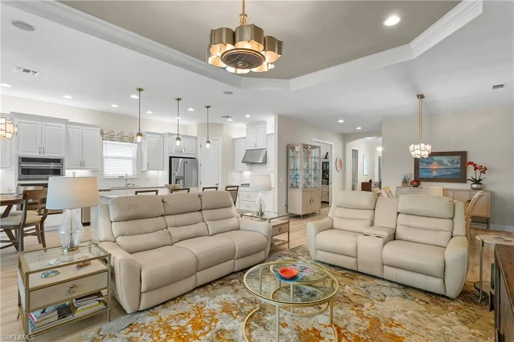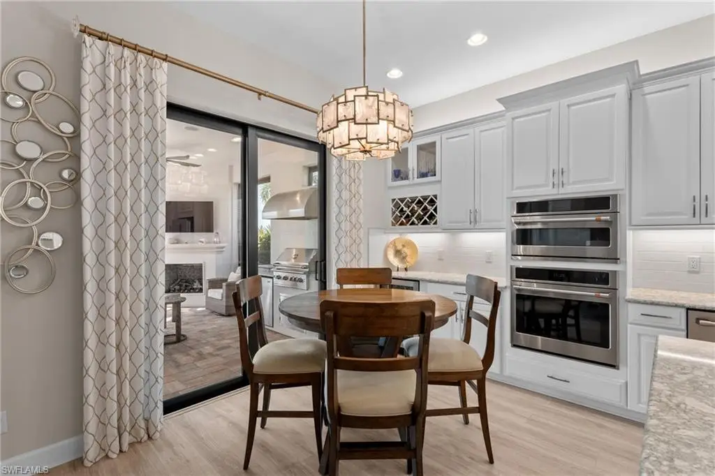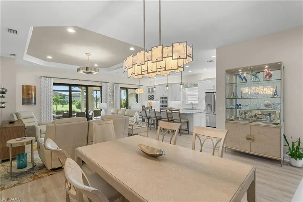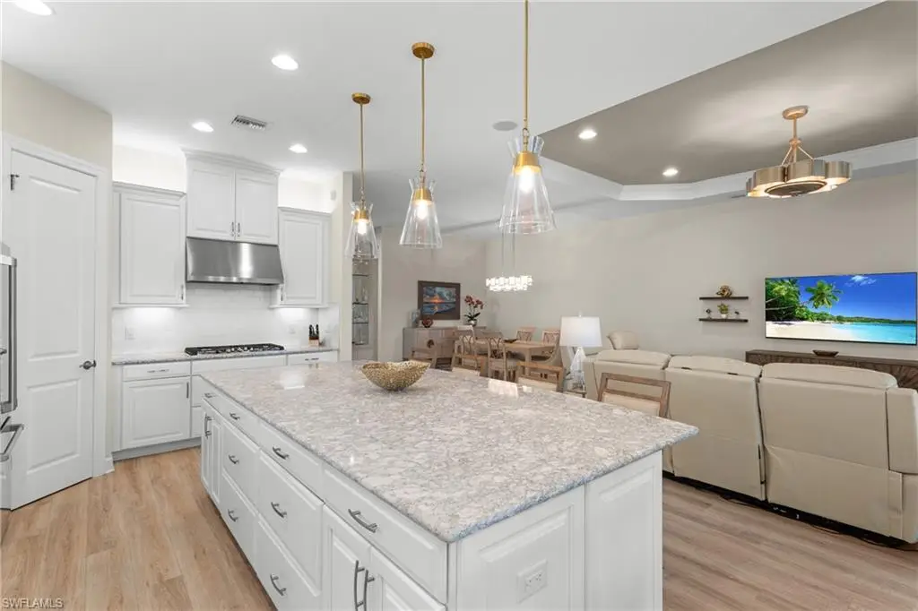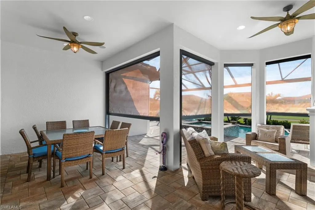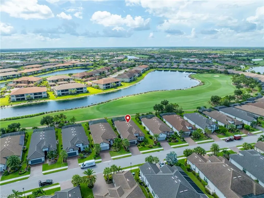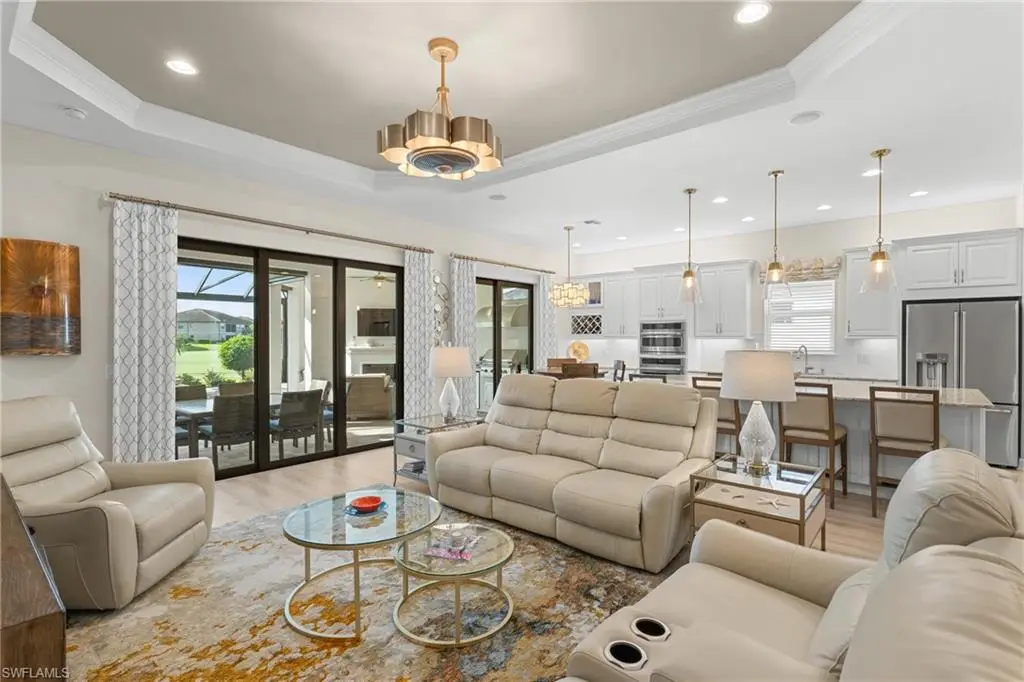 LIVE A VACATION LIFESTYLE IN ESPLANADE! FULL GOLF MEMBERSHIP INCLUDED! Built in 2020, this immaculate expanded "Lazio" offers sunrise views overlooking the 16th fairway & lake and offers a spacious floorplan consisting of three Bedrooms plus Den, three Full Baths, extended two car garage, and nearly 2400 sq ft under air. An open great room style floorplan with two sets of sliding glass doors to the extended covered lanai complete with outdoor kitchen and gas fireplace make this the perfect home for entertaining. Catch some sun around the GAS heated salt water pool (with auto fill) and raised spa enclosed with a picture window screen cage highlighting this home's unobstructed view. A long list of special features include: HURRICANE IMPACT WINDOWS/DOORS; ELECTRIC ROLL DOWN HURRICANE SCREENS on the lanai; expanded kitchen with additional level V cabinetry, Cambria quartz countertops, over/under cabinet lighting, and pantry with custom shelving; GE Cafe appliances including wine cooler, GAS cooktop, wall oven, wall convection microwave, and French door refrigerator; Expanded primary & front guest bedrooms with bay windows; Primary suite walk in closet with custom shelving/drawers including center storage island; Luxurious baths complete with quartz countertops, upgraded tile, Level V cabinetry, upgraded toilets, frameless shower enclosures, and upgraded "Voss" shower fixtures including primary bath rain shower & hand held; hurricane impact front door with matching sidelights; SONOS in-ceilings speakers; special order chandeliers/light fixtures throughout; extended garage with built-in storage cabinets, ceiling racks, & attic access pull down stairs; spacious Laundry Room with cabinetry; crown molding; tankless GAS hot water heater; 8' solid core doors/10' ceilings; extensive landscaping with landscaping lighting; and more! Esplanade Golf & Country Club of North Naples is a true "Lifestyle Community" with something for everyone: resort pool complete with cabanas & poolside "Bahama Bar"; tennis; pickleball; bocce; Koquina Day Spa; fitness center; dog parks; 14 miles of bike/walking trails; 18 hole private golf course; 15,000 Sq Ft clubhouse featuring restaurant, bar, wine tasting room, wine lockers, & Starbucks style cafe! All of Esplanade's amenities, property landscaping/irrigation, and golf membership dues total just $3,412/quarter! No additional fees/memberships required! Add this home and Esplanade Golf & Country Club to your must see list today!