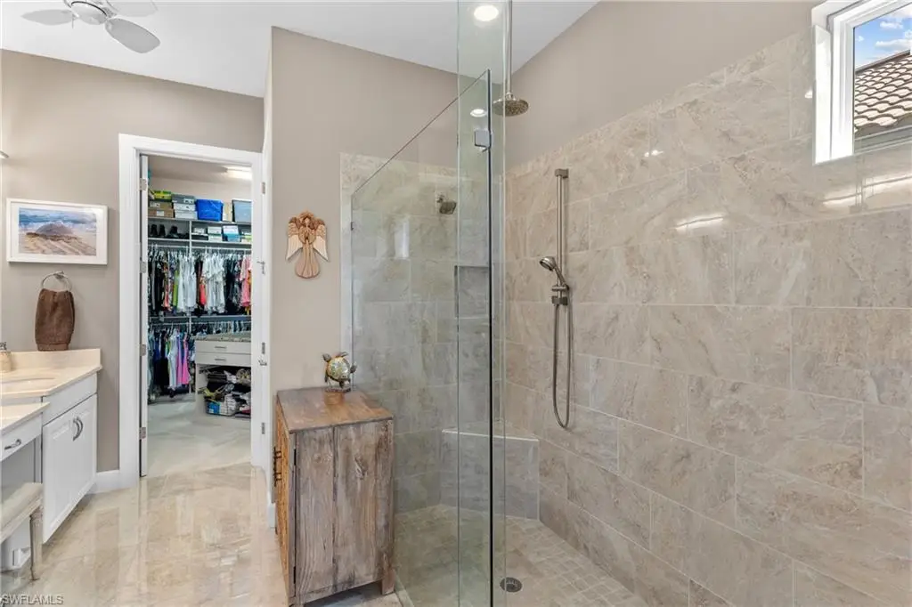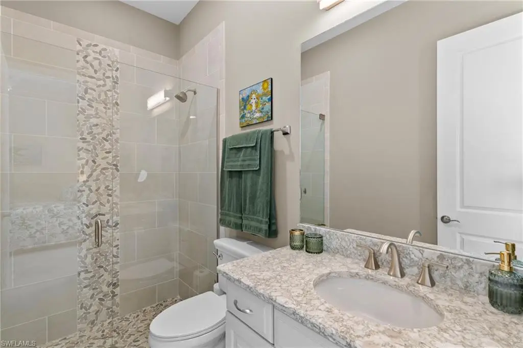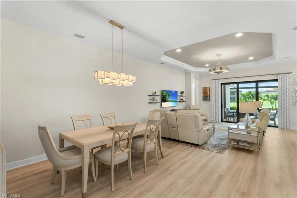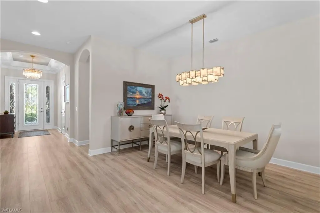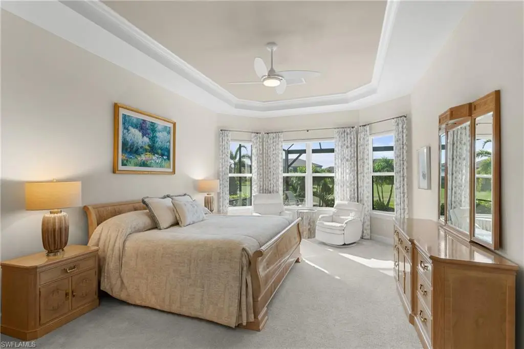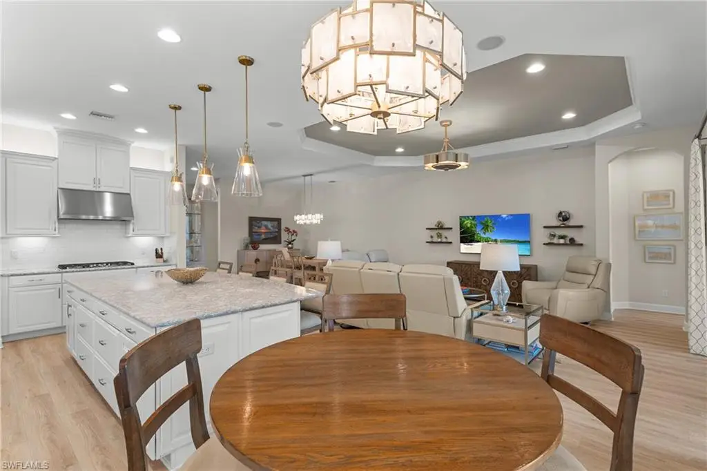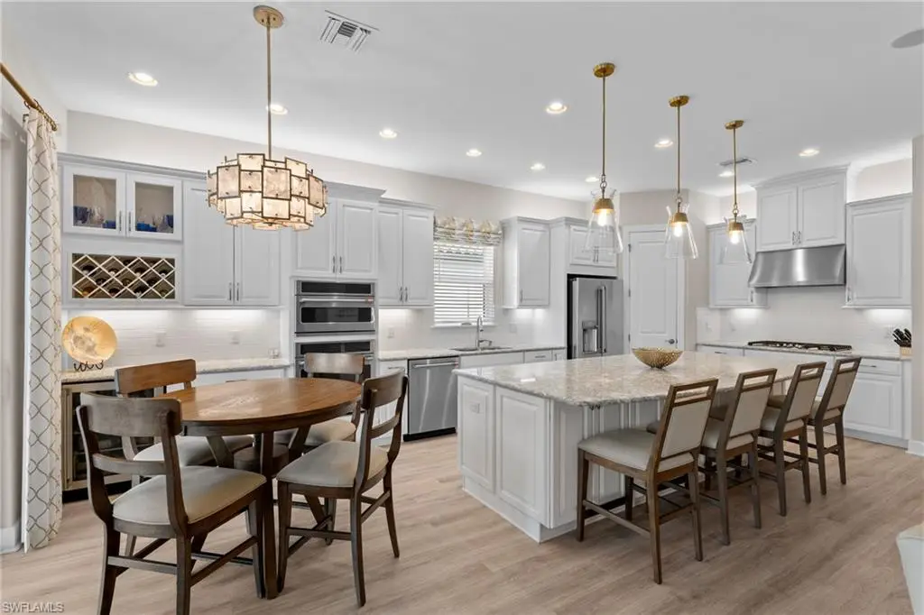 LIVE A VACATION LIFESTYLE IN ESPLANADE! FULL GOLF MEMBERSHIP INCLUDED! Built in 2020, this immaculate expanded "Lazio" offers sunrise views overlooking the 16th fairway & lake and offers a spacious floorplan consisting of three Bedrooms plus Den, three Full Baths, extended two car garage, and nearly 2400 sq ft under air. An open great room style floorplan with two sets of sliding glass doors to the extended covered lanai complete with outdoor kitchen and gas fireplace make this the perfect home for entertaining. Catch some sun around the GAS heated salt water pool (with auto fill) and raised spa enclosed with a picture window screen cage highlighting this home's unobstructed view. A long list of special features include: HURRICANE IMPACT WINDOWS/DOORS; ELECTRIC ROLL DOWN HURRICANE SCREENS on the lanai; expanded kitchen with additional level V cabinetry, Cambria quartz countertops, over/under cabinet lighting, and pantry with custom shelving; GE Cafe appliances including wine cooler, GAS cooktop, wall oven, wall convection microwave, and French door refrigerator; Expanded primary & front guest bedrooms with bay windows; Primary suite walk in closet with custom shelving/drawers including center storage island; Luxurious baths complete with quartz countertops, upgraded tile, Level V cabinetry, upgraded toilets, frameless shower enclosures, and upgraded "Voss" shower fixtures including primary bath rain shower & hand held; hurricane impact front door with matching sidelights; SONOS in-ceilings speakers; special order chandeliers/light fixtures throughout; extended garage with built-in storage cabinets, ceiling racks, & attic access pull down stairs; spacious Laundry Room with cabinetry; crown molding; tankless GAS hot water heater; 8' solid core doors/10' ceilings; extensive landscaping with landscaping lighting; and more! Esplanade Golf & Country Club of North Naples is a true "Lifestyle Community" with something for everyone: resort pool complete with cabanas & poolside "Bahama Bar"; tennis; pickleball; bocce; Koquina Day Spa; fitness center; dog parks; 14 miles of bike/walking trails; 18 hole private golf course; 15,000 Sq Ft clubhouse featuring restaurant, bar, wine tasting room, wine lockers, & Starbucks style cafe! All of Esplanade's amenities, property landscaping/irrigation, and golf membership dues total just $3,412/quarter! No additional fees/memberships required! Add this home and Esplanade Golf & Country Club to your must see list today!