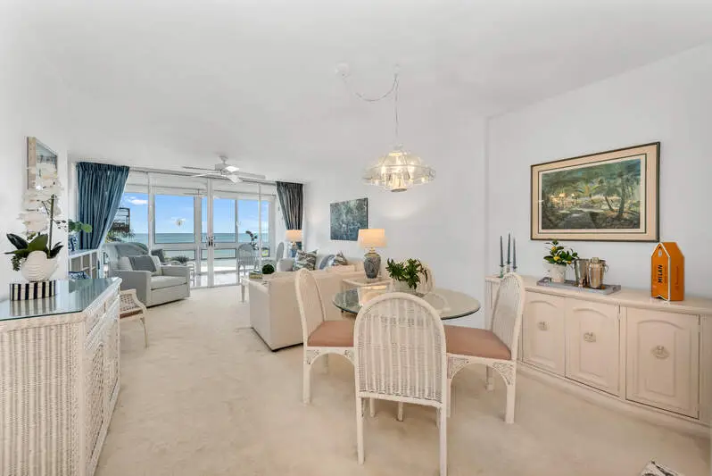 Indulge in the ultimate beachfront lifestyle in this ideally situated 2 bedroom, 2 bath unit, perfectly positioned on the Gulf of Mexico in the coveted Moorings Beach enclave. With direct, panoramic views of sugar white sands and turquoise waters, this residence is a coastal gem offering direct beachfront access to one of the most open stretches of beach along Gulf Shore Blvd. Wall-to-wall, floor-to-ceiling sliders in the living room that open to a wide sunroom, offering seamless indoor-outdoor living and unobstructed Gulf views. The living and dining spaces feature a neutral, elegant palette, accentuated by coastal finishes and abundant natural light. The kitchen is white, bright and fully functional with ample storage and an easy flow making it ideal for preparing your beach walk morning coffee or a full meal! Primary suite is a serene retreat: offering direct Gulf views and a comfortably appointed en-suite bath. Lovely guest bedroom is generous in size, with large windows and close access to the second bath (which also serves as a powder bath for guests).Throughout the unit, tasteful coastal decor-such as light tile floors, creamy carpeting, and neutral paint enhance and emphasize this ideal beachfront setting. Royal Palm Club is a welcoming community offering private access to the beach which means your days begin with gentle surf and end with spectacular sunsets. Gulf-front pool and sundeck allow you to unwind steps from your door, with uninterrupted views of the Gulf. Covered and assigned parking plus individual storage and an immaculate common laundry ensure your convenience and security. Professionally managed, well maintained building with a responsive board and an onsite property manager reflects pride of ownership. RPC also offers an unbeatable Location: from your doorstep, you're minutes away from: Venetian Village's boutique shops and waterfront restaurants, 5th Avenue South & Third Street South with upscale dining, galleries, and nightlife, World-class golf courses, pristine parks, and cultural venues. Easily accessible to both Naples Airport and Southwest Florida International Airport (RSW)