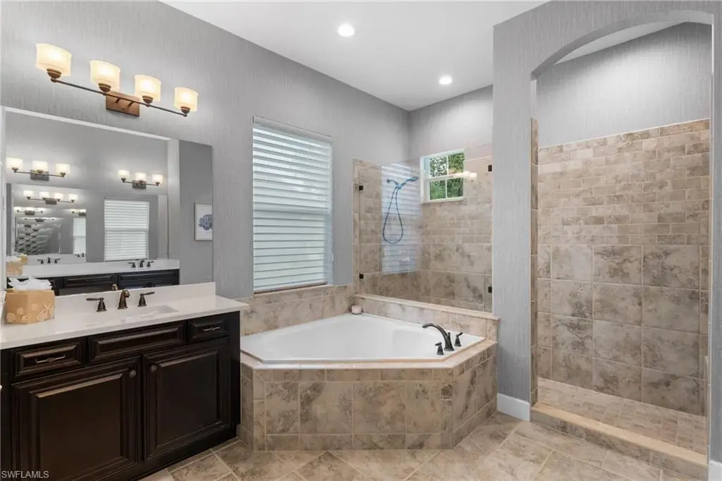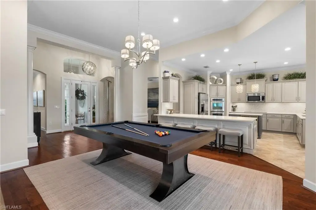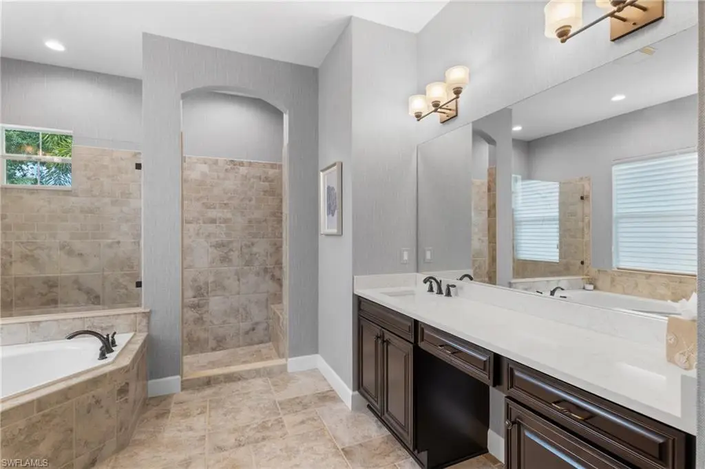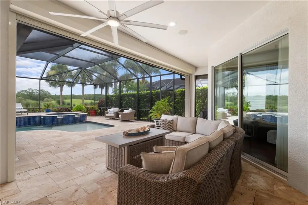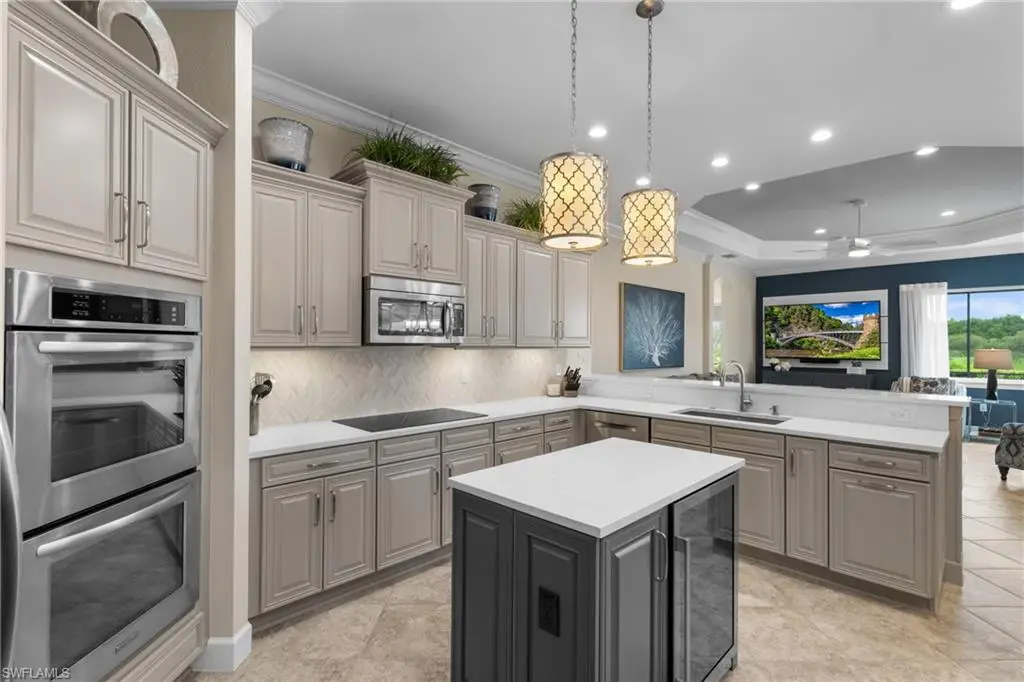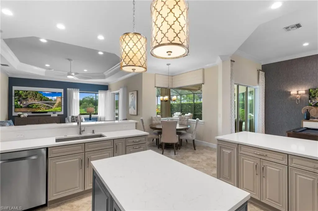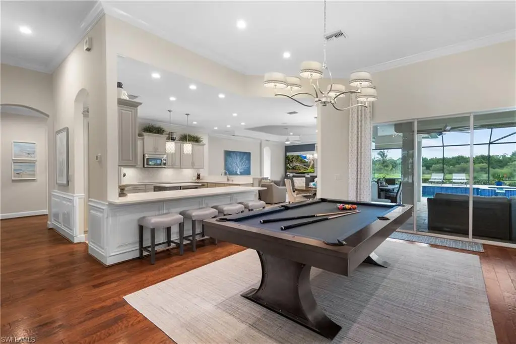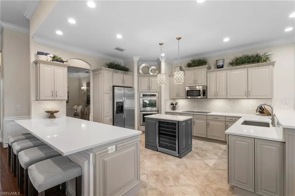 Live the Ultimate Vacation Lifestyle in The Quarry! This beautifully remodeled 4 Bedroom plus Den, 4 full bath, 3 car garage home is perfectly situated overlooking the 14th fairway with picturesque golf course, lake, and preserve views with no roof tops in sight! Custom features and professional design gives this home a model-like feel and is a true one of a kind. From the moment you walk in the door, you are greeted with a wide open Great Room style floorplan with two sliding glass doors to the lanai and spacious pool area. The spacious kitchen is the heart of the home with center island, two breakfast bars with seating for 8, updated quartz countertops, custom tile backsplash, double wall ovens, wine cooler, and two additional beverage coolers, making this the perfect kitchen for entertaining. The luxurious Primary Suite features a sliding glass door to the lanai, spacious closets with cabinetry, and bath boasting dual sinks, walk in shower, soaking tub, and custom wallpaper detail. Enjoy days around the heated pool/spa and al fresco dining on the lanai complete with travertine marble deck, raised sun deck, spa, and wet deck. Other fine appointments of this home include: wood floors throughout living room, dining room, den, and primary bedroom; custom window treatments throughout; custom wallpaper accents; special order chandeliers, lights, and fans; crown molding throughout; motorized roll down hurricane shutters on the lanai and front foyer; freshly painted interior; two brand new HVACs; air conditioned three car garage; and more! Furniture & decor package available! The Quarry is an exceptional lakefront community offering unparalleled amenities and a lifestyle like no other. Enjoy boating, golf, tennis, pickleball, bocce ball, a Tiki Bar, poolside food and drink service, a fully equipped gym, and a variety of social activities. The recently renovated and expanded "Lake Lodge & Beach Club" provides the perfect setting for relaxation, while over 500 acres of navigable lakes (with boat slips available for lease) offer endless opportunities for water enthusiasts. The private 18-hole golf club features optional golf and social memberships, providing an elite experience for golf lovers (full golf memberships available/no waitlist). Schedule your private showing today!