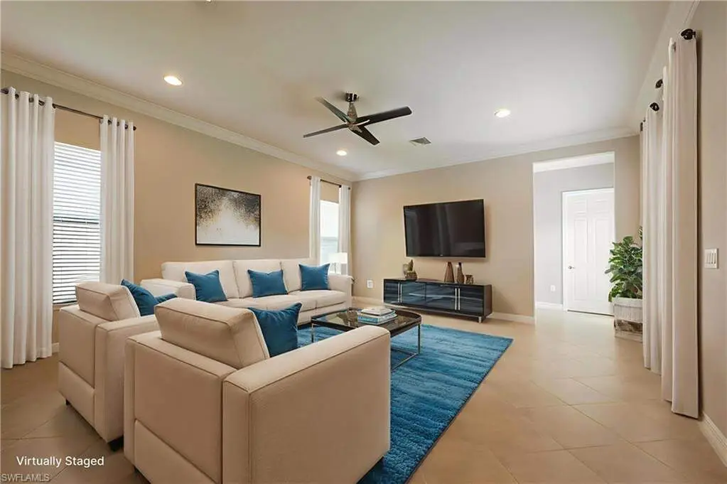 Tranquil Luxury in Riverstone, Naples, where nature meets neighborhood charm. Tucked away in the sought-after Riverstone community of North Naples, this exquisite Drake model, 4-bedroom + den, 4-bath home offers 3,376 square feet of thoughtfully designed living space. From the moment you arrive, the elegant facade and three-car garage-featuring a single bay and double bay-set the tone for a residence that balances sophistication with everyday comfort. Step inside to soaring ceilings, sunlit rooms, and a versatile den perfect for a home office, library, or creative retreat. The open-concept layout invites connection, while the private bedroom suites offer peaceful sanctuary for everyone. Beyond the living room, glass doors open to a tranquil preserve where wild birds and native wildlife create a living canvas of Florida's natural beauty. There is ample room for a pool, should you desire. Whether sipping morning coffee or hosting sunset gatherings, this view is yours to savor-every day. Located in Flood Zone X. Storm protection with impact windows and manual shutters. Resort-Style Living, Just Steps Away. Located within walking distance to Riverstone's vibrant clubhouse, this home offers unparalleled access to world-class amenities tennis, pickleball, and basketball courts, lap pool and resort pool, full-service spa and state-of-the-art fitness center, indoor studio for yoga, dance, and wellness classes, elegant clubhouse for social events and private celebrations. Prime North Naples location, just minutes from upscale dining, boutique shopping, and more, this home is perfectly positioned for both convenience and community.