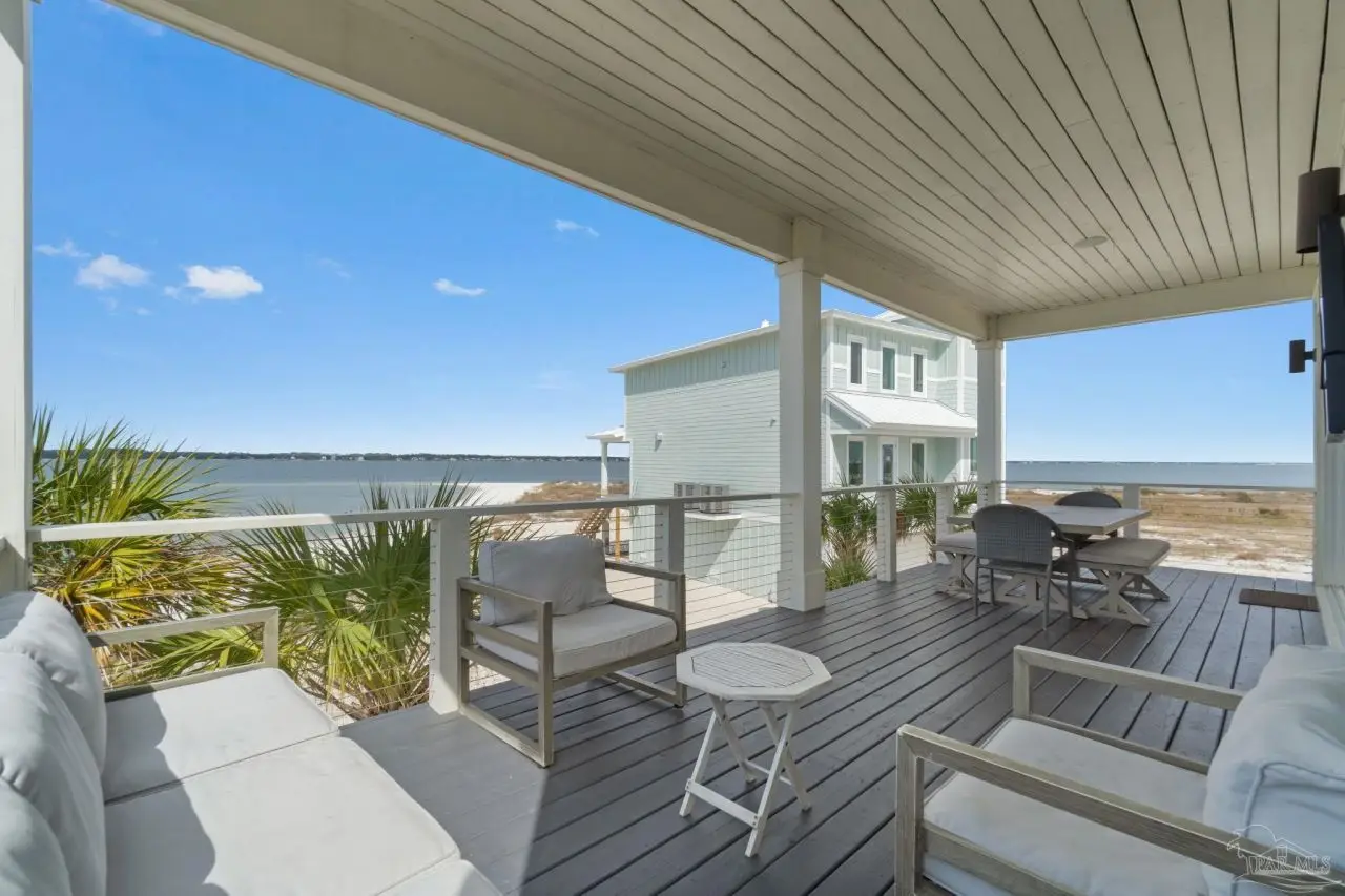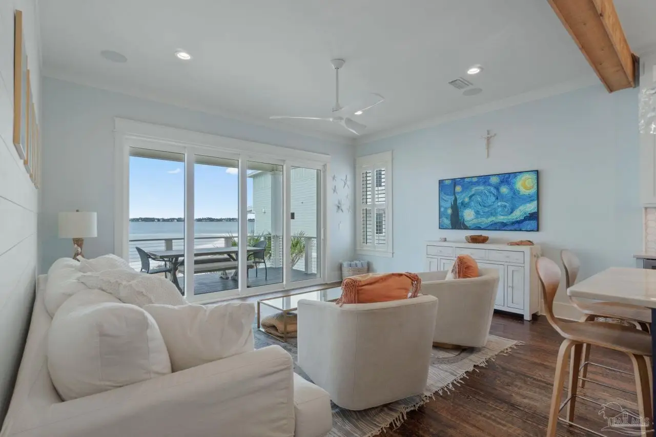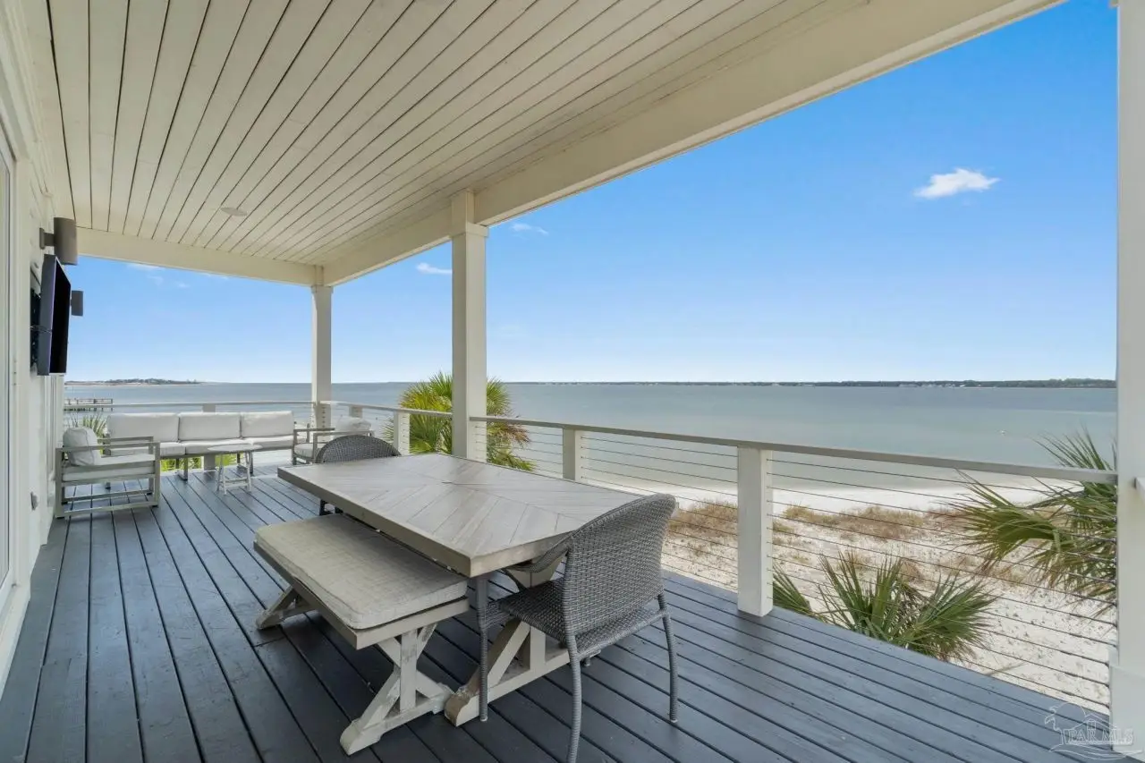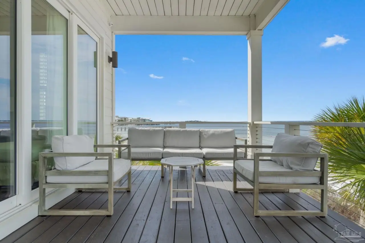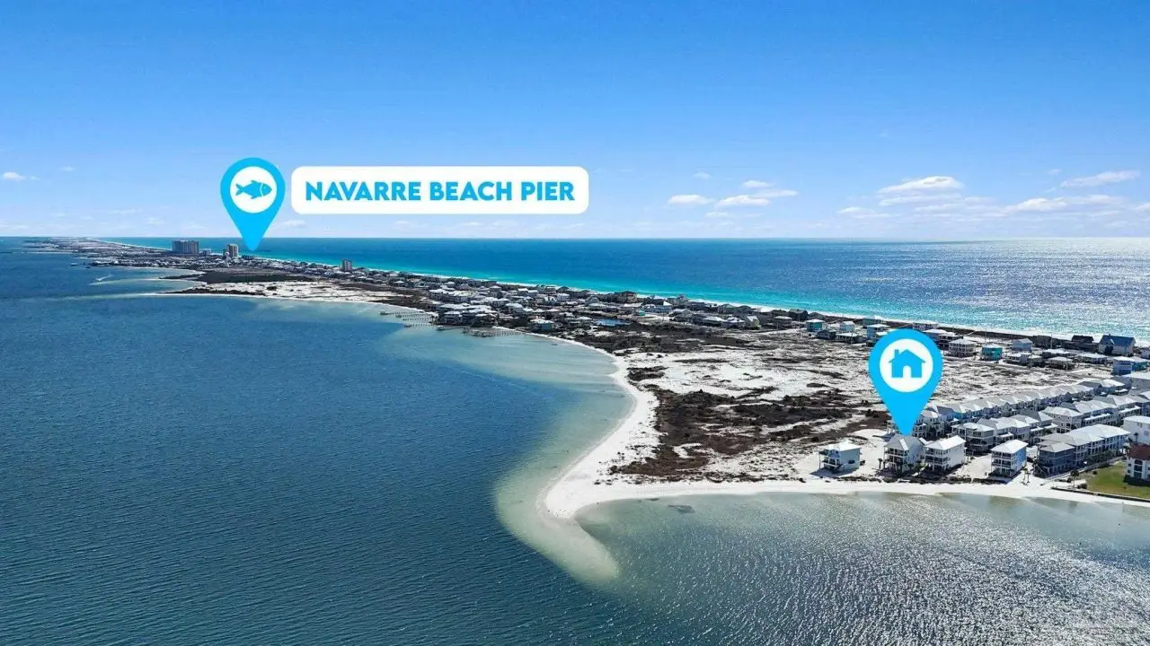 Experience the beauty of Sound-front living in this exceptional Navarre Beach retreat. Perfectly positioned within the private gated community of By the Sea, this custom-built home captures the best of coastal life with over 110 feet of direct waterfront, serene views across the Santa Rosa Sound, and effortless access to the Gulf-just a short stroll or golf cart ride away. Inside, soaring ceilings and wide-plank distressed pine floors create a warm, open feel that complements the coastal surroundings. The home features five bedrooms, each with its own ensuite bath, plus an additional half bath. Two spacious primary suites-one on the main floor and another upstairs-offer peaceful water views, soaking tubs, seamless glass showers, and double vanities. Large windows and glass doors flood the living spaces with natural light and open to covered balconies overlooking the Sound, creating a seamless flow between indoor and outdoor living. The kitchen and main living area are designed for gathering, featuring quartz and marble countertops, soft-close cabinetry, whitewashed cedar accents, and shiplap details. Enjoy the convenience of whole-home audio and video with WiFi control, custom window treatments, and refined lighting throughout. On the top floor, a flexible bonus room with a trundle bed adds extra sleeping space for guests, while a half bath in the garage provides added convenience for beach days. Sold fully furnished with high-end decor (with limited exclusions), the home is ready to enjoy from day one. Outside, flagstone pathways lead to your private stretch of Sound-front beach-perfect for kayaking, paddleboarding, or simply unwinding as the sun sets over the water. The By the Sea community also offers a pool and hot tub for owners and guests. Thoughtfully designed and impeccably maintained, 1464 Seaside Circle is more than a home-it's a rare opportunity to experience the laid-back luxury and natural beauty that define life on Navarre Beach.