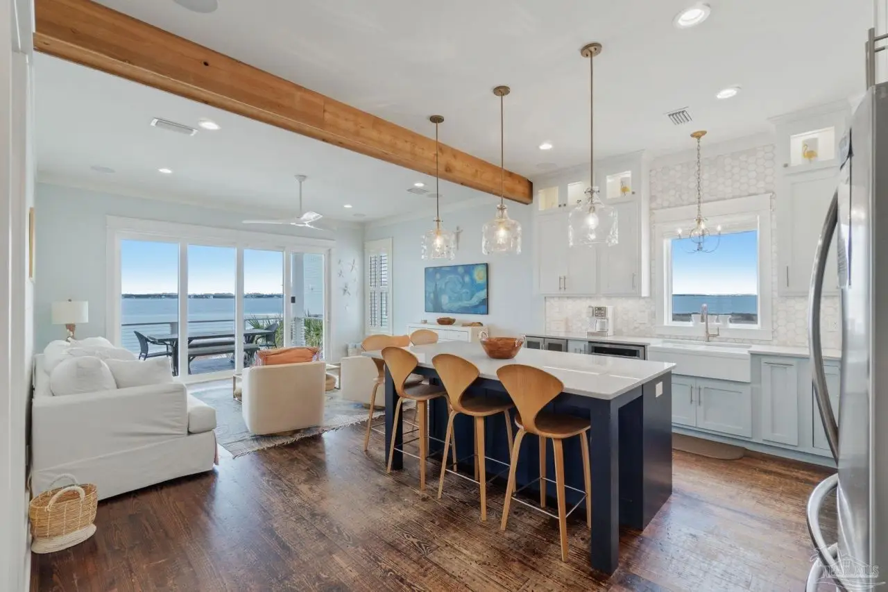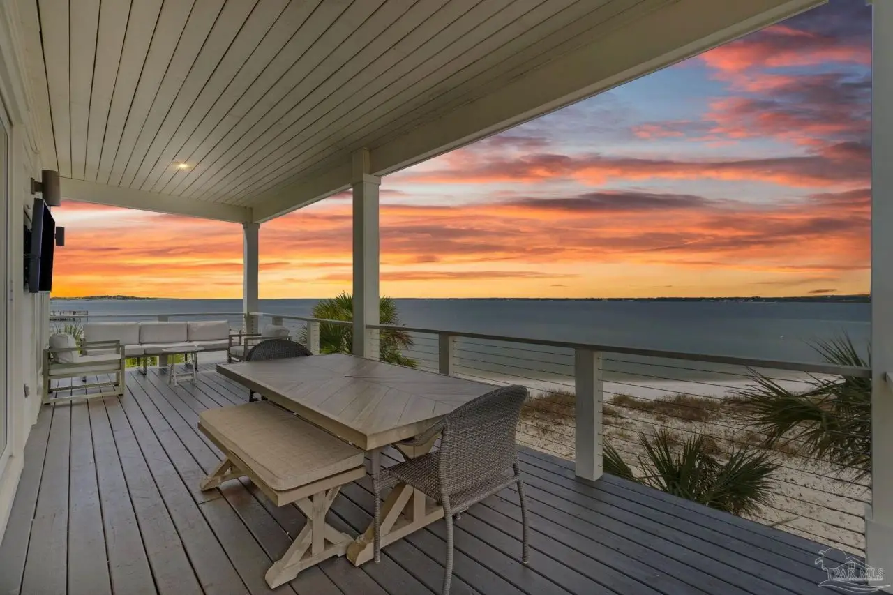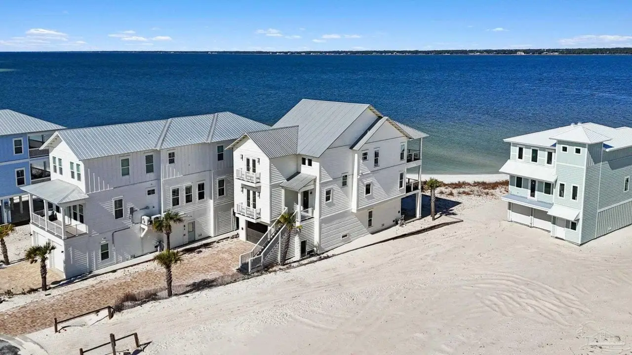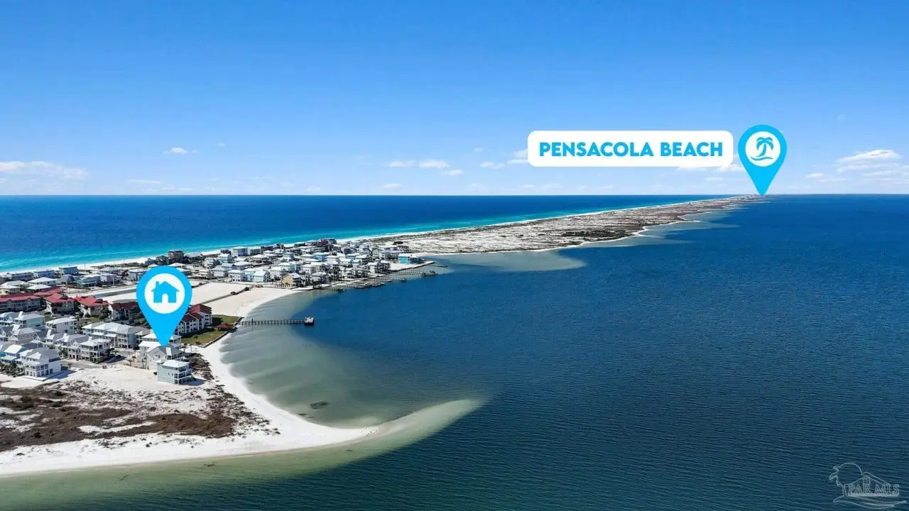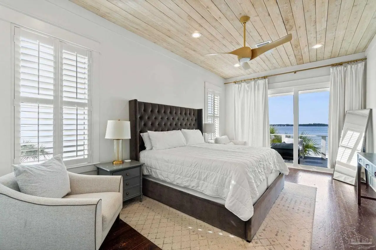 Experience the beauty of Sound-front living in this exceptional Navarre Beach retreat. Perfectly positioned within the private gated community of By the Sea, this custom-built home captures the best of coastal life with over 110 feet of direct waterfront, serene views across the Santa Rosa Sound, and effortless access to the Gulf-just a short stroll or golf cart ride away. Inside, soaring ceilings and wide-plank distressed pine floors create a warm, open feel that complements the coastal surroundings. The home features five bedrooms, each with its own ensuite bath, plus an additional half bath. Two spacious primary suites-one on the main floor and another upstairs-offer peaceful water views, soaking tubs, seamless glass showers, and double vanities. Large windows and glass doors flood the living spaces with natural light and open to covered balconies overlooking the Sound, creating a seamless flow between indoor and outdoor living. The kitchen and main living area are designed for gathering, featuring quartz and marble countertops, soft-close cabinetry, whitewashed cedar accents, and shiplap details. Enjoy the convenience of whole-home audio and video with WiFi control, custom window treatments, and refined lighting throughout. On the top floor, a flexible bonus room with a trundle bed adds extra sleeping space for guests, while a half bath in the garage provides added convenience for beach days. Sold fully furnished with high-end decor (with limited exclusions), the home is ready to enjoy from day one. Outside, flagstone pathways lead to your private stretch of Sound-front beach-perfect for kayaking, paddleboarding, or simply unwinding as the sun sets over the water. The By the Sea community also offers a pool and hot tub for owners and guests. Thoughtfully designed and impeccably maintained, 1464 Seaside Circle is more than a home-it's a rare opportunity to experience the laid-back luxury and natural beauty that define life on Navarre Beach.