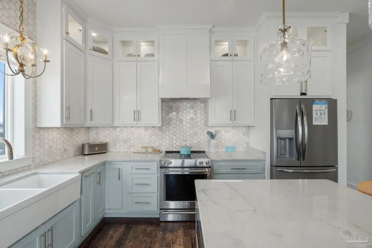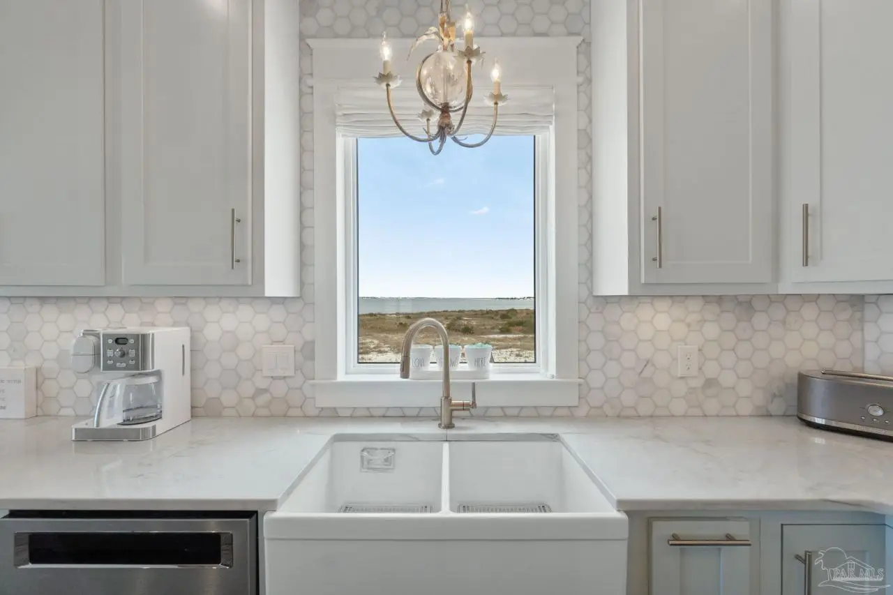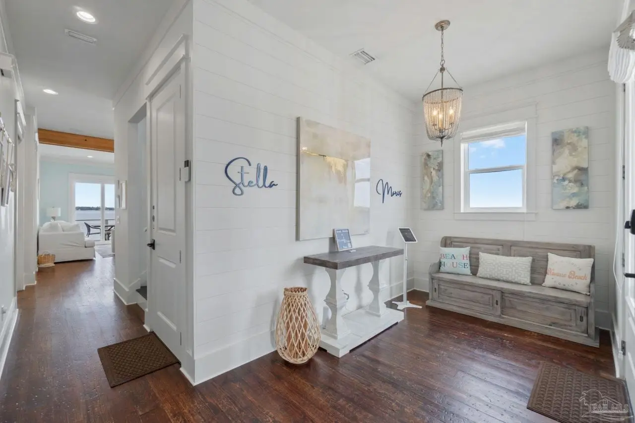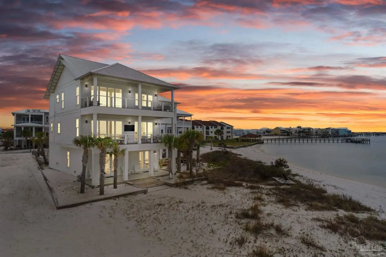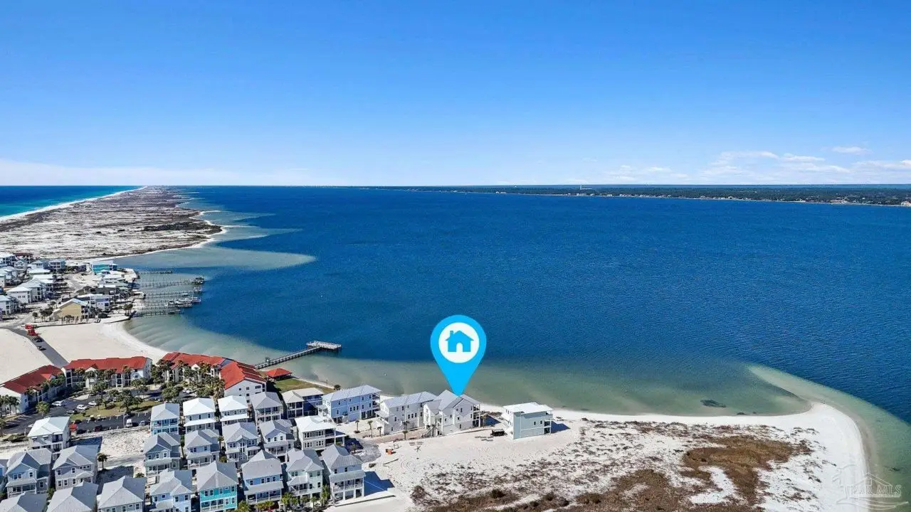 Experience the beauty of Sound-front living in this exceptional Navarre Beach retreat. Perfectly positioned within the private gated community of By the Sea, this custom-built home captures the best of coastal life with over 110 feet of direct waterfront, serene views across the Santa Rosa Sound, and effortless access to the Gulf-just a short stroll or golf cart ride away. Inside, soaring ceilings and wide-plank distressed pine floors create a warm, open feel that complements the coastal surroundings. The home features five bedrooms, each with its own ensuite bath, plus an additional half bath. Two spacious primary suites-one on the main floor and another upstairs-offer peaceful water views, soaking tubs, seamless glass showers, and double vanities. Large windows and glass doors flood the living spaces with natural light and open to covered balconies overlooking the Sound, creating a seamless flow between indoor and outdoor living. The kitchen and main living area are designed for gathering, featuring quartz and marble countertops, soft-close cabinetry, whitewashed cedar accents, and shiplap details. Enjoy the convenience of whole-home audio and video with WiFi control, custom window treatments, and refined lighting throughout. On the top floor, a flexible bonus room with a trundle bed adds extra sleeping space for guests, while a half bath in the garage provides added convenience for beach days. Sold fully furnished with high-end decor (with limited exclusions), the home is ready to enjoy from day one. Outside, flagstone pathways lead to your private stretch of Sound-front beach-perfect for kayaking, paddleboarding, or simply unwinding as the sun sets over the water. The By the Sea community also offers a pool and hot tub for owners and guests. Thoughtfully designed and impeccably maintained, 1464 Seaside Circle is more than a home-it's a rare opportunity to experience the laid-back luxury and natural beauty that define life on Navarre Beach.