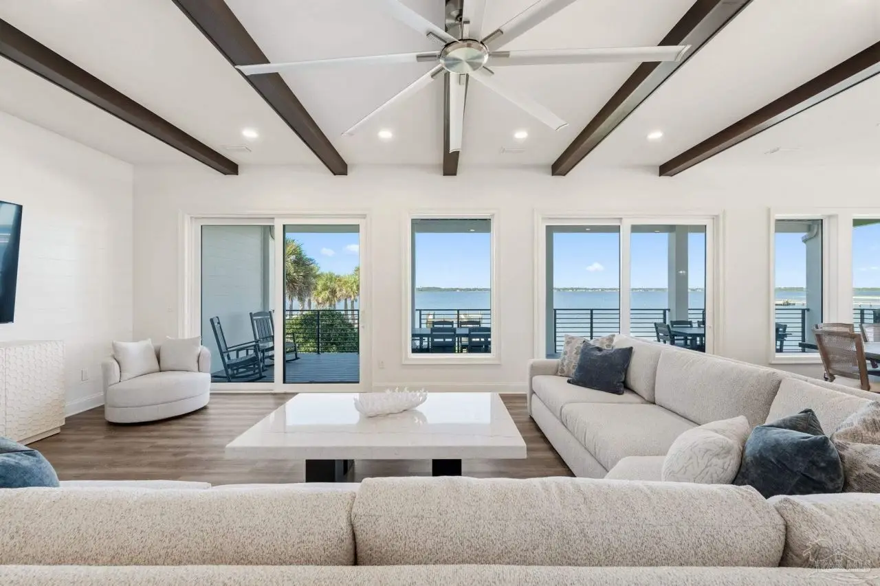 Brand new construction on a deep water lot with a dock on the Sound at beautiful Navarre Beach! This Bock Construction home was just completed and is ready for you. This home is being sold fully furnished and could be an amazing waterfront home with a place to keep your boat in your own backyard or as an amazing turnkey vacation rental. Excellent water depth at the dock. Enjoy multiple 50 feet waterfront decks to watch the birds and the dolphins while being steps away from a relaxing great room with room for everybody. Plenty of storage underneath for all your toys and beach gear along with an elevator so everyone has easy access to this beautiful home. The outside is as beautiful as the gorgeous interior and features the dock, a sodded yard, and a white sandy beach out back!