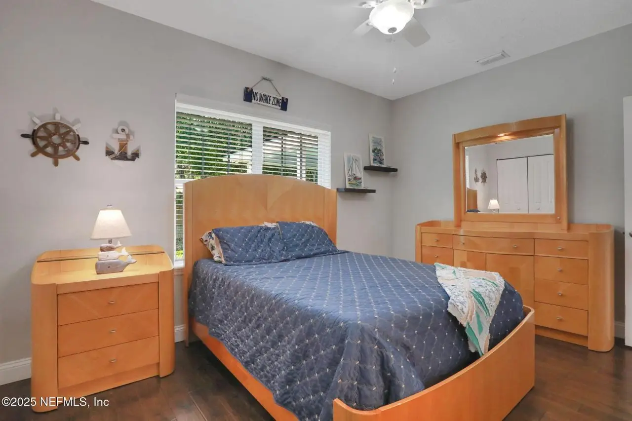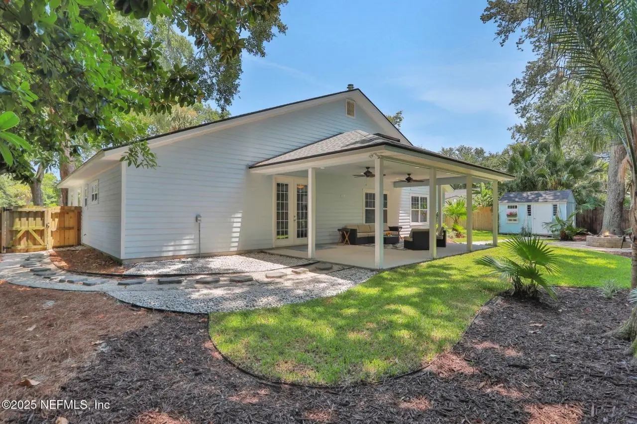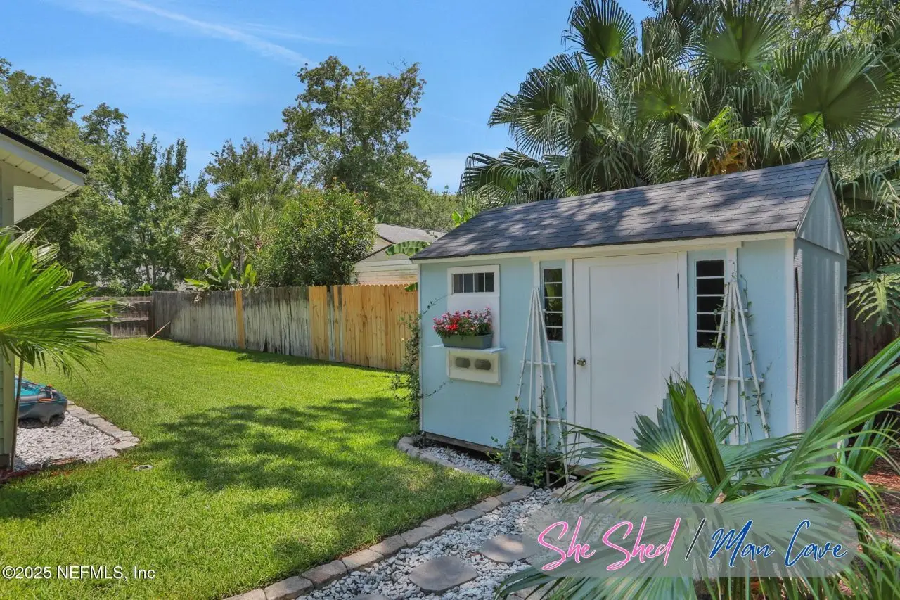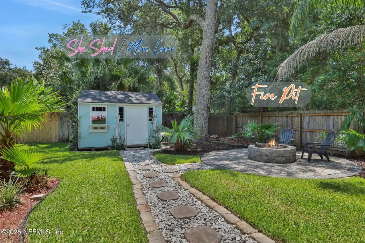 Here is your amazing opportunity to own the newest home on a prime corner lot in desirable Camelia Terrace. Situated along the Hopkins Creek and just one mile to the ocean, this community was established in the 1980's and has just 64 homesites. The neighborhood of oversized homesites is shaded by age-old oaks and has only two access roads creating the perfect balance of privacy and community. Newer than all the others, this home was built in 2018 and has 3 bedrooms and 2 baths. It sits on 1/3 of an acre and spans 2,081 square feet including an 8'x12' backyard studio. There is an abundance of parking with an extended driveway that leads to a courtyard entry, oversized 26' deep garage. This stunning beach cottage showcases quality craftsmanship throughout. The durable Hardie Board siding gives the exterior lasting appeal, while inside you'll find gorgeous 5-inch handscraped wood plank flooring flowing seamlessly through the entire home. Eight-foot tall interior doors and soaring vaulted ceilings create an open, airy atmosphere that feels both grand and comfortable. The heart of this home is the impressive kitchen, featuring a large center island. Soft-close white shaker cabinetry with 42-inch uppers provides ample storage space. All is complemented by the gorgeous marble counters. The stainless appliances include an LG Smart French Door fridge with that handy InstaView Door-in-Door feature. A well-shelved pantry closet keeps everything tidy and within reach. Adjacent to the kitchen is the dining room that opens through French Doors for dining alfresco on the lovely courtyard. The perfect transition from garage to kitchen is the thoughtfully designed laundry center. This generous space features built-in cabinetry, butcher block folding counters and a handy utility closet. The room is so spacious it could easily double as an office or craft room. The oversized family room serves as the home's cozy gathering spot, complete with a wood-burning fireplace with beautiful marble surround and hearth. Cathedral ceilings soar overhead, while French doors lead to the spectacular 26' x 16' covered lanai. This outdoor space overlooks the tropically landscaped, fenced backyard where pavers create a charming path to the firepit area. Speaking of outdoor spaces, continue down the path to a real conversation starter. From the outside, it looks like an adorable and charming she-shed, but step inside to discover a fully conditioned man-cave. It's the perfect retreat for hobbies, relaxation, or those moments when you just need some time alone. The thoughtful split-bedroom floor plan places the sunlit spacious primary bedroom on one side of the home. The ensuite bath feels like a personal spa with its 24-inch marble tile flooring, dual sinks, and an oversized vanity topped with marble counters. The huge shower features a seamless glass surround, pebble flooring, and classic subway tile walls. A private water closet adds convenience, while the uniquely designed walk-in closet offers a central dressing area leading to two separate closets for each partner...or shoes. On the other side of the home are the two guest bedrooms and both are equally well-appointed. One connects to a nicely sized guest bathroom and includes two side-by-side closets. The third bedroom features a generously sized walk-in closet. The 22' x 100' side yard with street access offers incredible versatility. Park your boat, set up a workshop or start planning that pool you've always wanted. The spa