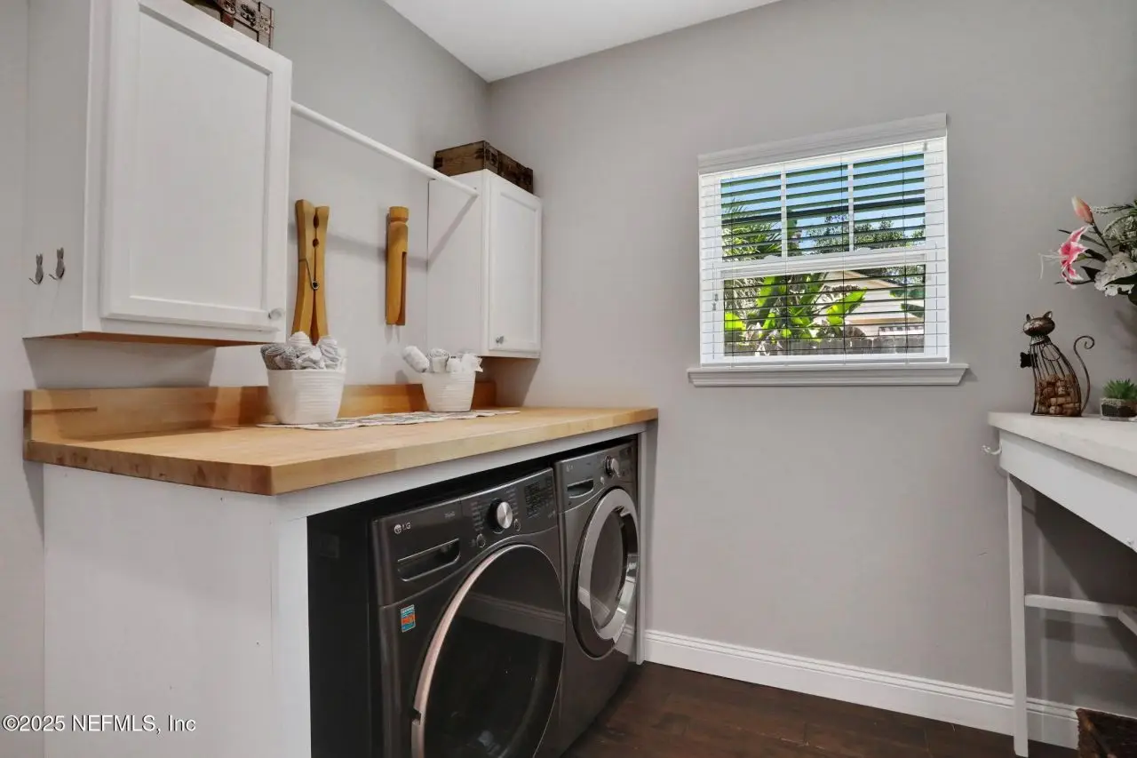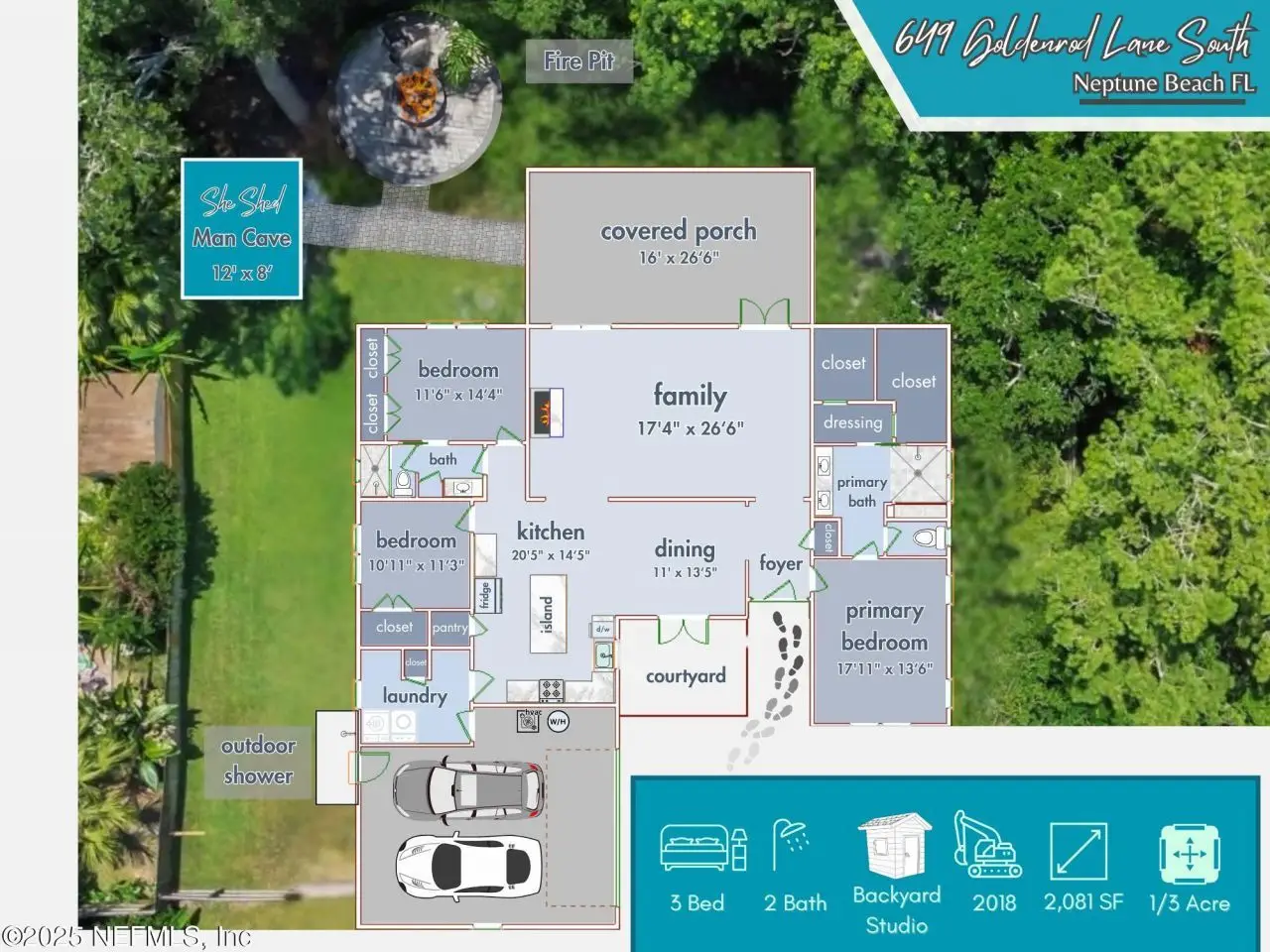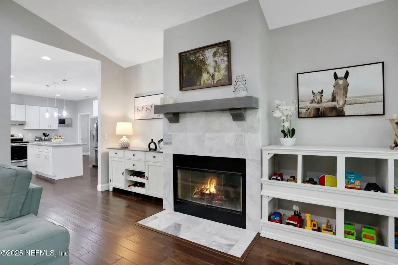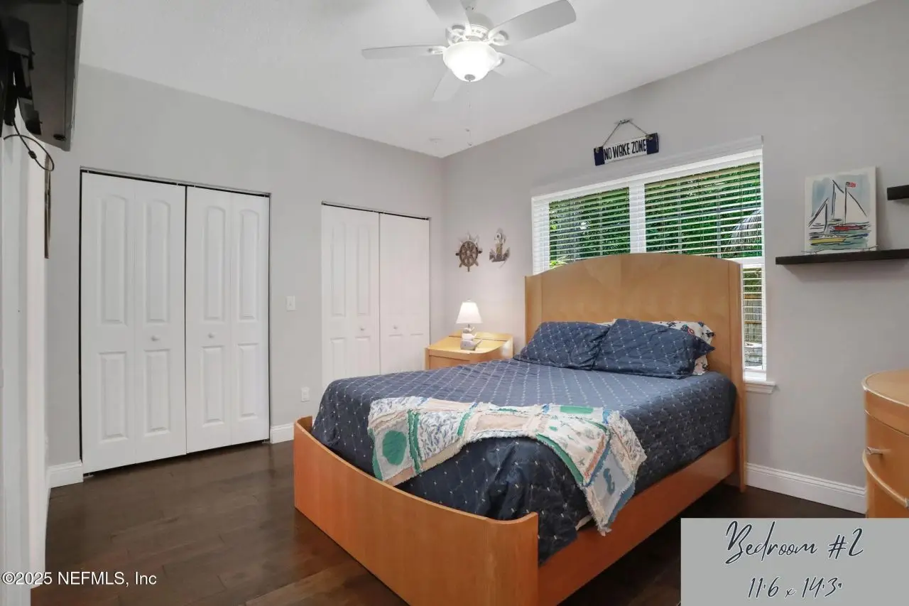 Here is your amazing opportunity to own the newest home on a prime corner lot in desirable Camelia Terrace. Situated along the Hopkins Creek and just one mile to the ocean, this community was established in the 1980's and has just 64 homesites. The neighborhood of oversized homesites is shaded by age-old oaks and has only two access roads creating the perfect balance of privacy and community. Newer than all the others, this home was built in 2018 and has 3 bedrooms and 2 baths. It sits on 1/3 of an acre and spans 2,081 square feet including an 8'x12' backyard studio. There is an abundance of parking with an extended driveway that leads to a courtyard entry, oversized 26' deep garage. This stunning beach cottage showcases quality craftsmanship throughout. The durable Hardie Board siding gives the exterior lasting appeal, while inside you'll find gorgeous 5-inch handscraped wood plank flooring flowing seamlessly through the entire home. Eight-foot tall interior doors and soaring vaulted ceilings create an open, airy atmosphere that feels both grand and comfortable. The heart of this home is the impressive kitchen, featuring a large center island. Soft-close white shaker cabinetry with 42-inch uppers provides ample storage space. All is complemented by the gorgeous marble counters. The stainless appliances include an LG Smart French Door fridge with that handy InstaView Door-in-Door feature. A well-shelved pantry closet keeps everything tidy and within reach. Adjacent to the kitchen is the dining room that opens through French Doors for dining alfresco on the lovely courtyard. The perfect transition from garage to kitchen is the thoughtfully designed laundry center. This generous space features built-in cabinetry, butcher block folding counters and a handy utility closet. The room is so spacious it could easily double as an office or craft room. The oversized family room serves as the home's cozy gathering spot, complete with a wood-burning fireplace with beautiful marble surround and hearth. Cathedral ceilings soar overhead, while French doors lead to the spectacular 26' x 16' covered lanai. This outdoor space overlooks the tropically landscaped, fenced backyard where pavers create a charming path to the firepit area. Speaking of outdoor spaces, continue down the path to a real conversation starter. From the outside, it looks like an adorable and charming she-shed, but step inside to discover a fully conditioned man-cave. It's the perfect retreat for hobbies, relaxation, or those moments when you just need some time alone. The thoughtful split-bedroom floor plan places the sunlit spacious primary bedroom on one side of the home. The ensuite bath feels like a personal spa with its 24-inch marble tile flooring, dual sinks, and an oversized vanity topped with marble counters. The huge shower features a seamless glass surround, pebble flooring, and classic subway tile walls. A private water closet adds convenience, while the uniquely designed walk-in closet offers a central dressing area leading to two separate closets for each partner...or shoes. On the other side of the home are the two guest bedrooms and both are equally well-appointed. One connects to a nicely sized guest bathroom and includes two side-by-side closets. The third bedroom features a generously sized walk-in closet. The 22' x 100' side yard with street access offers incredible versatility. Park your boat, set up a workshop or start planning that pool you've always wanted. The spa