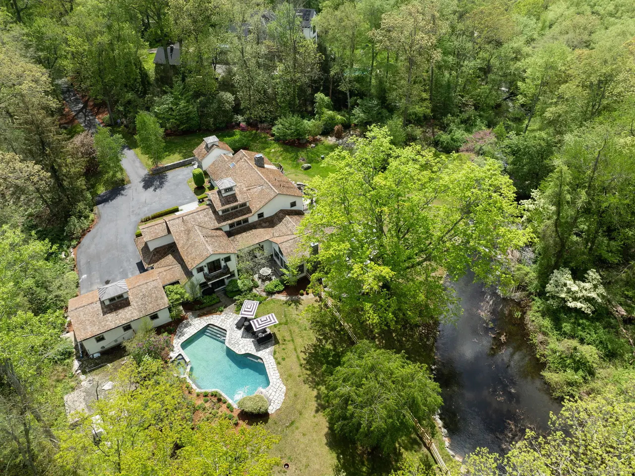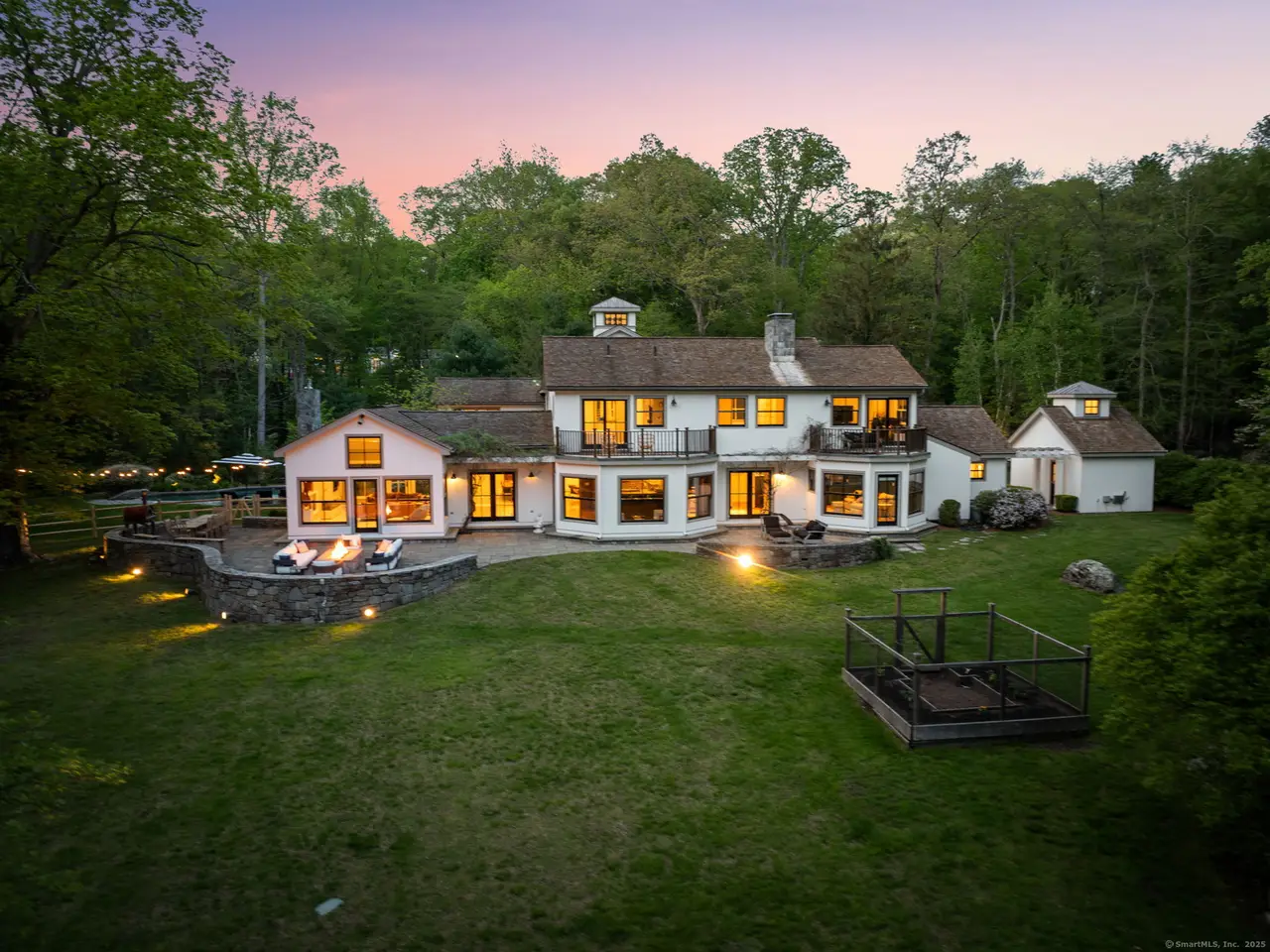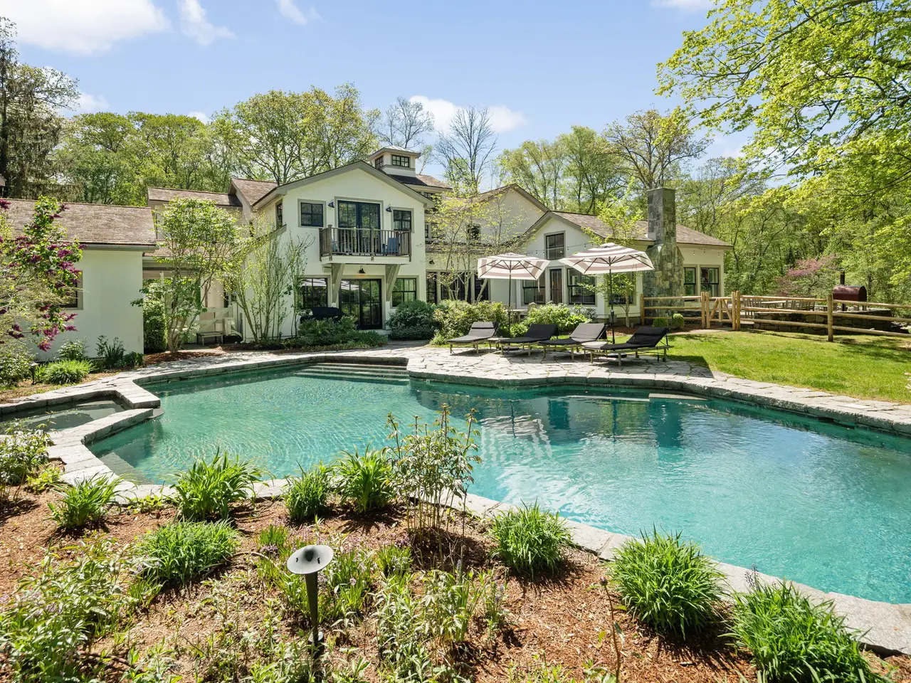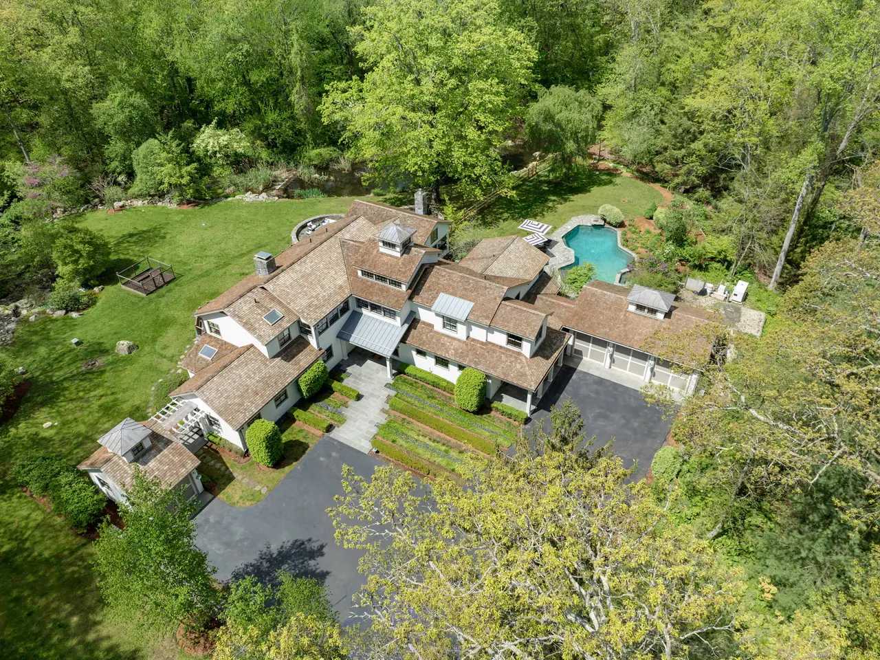 California meets New Canaan in this William Wurster inspired transitional-style masterpiece set on 2.54 private acres on New Canaan's desirable west side that's so convenient to town. This extensively renovated home has over 100 custom windows and 16 doors bringing the outside in from every room. Amazing sun-drenched living space with wonderful views from EVERYWHERE. French doors lead to expansive bluestone terraces, a beautiful gas fire pit for entertaining, meticulously manicured flower gardens, pool, spa and river. Five bedrooms, four-car garages, au pair suite and an exceptionally designed layout make this home a sensational haven with the warmth of a colonial but so fresh!