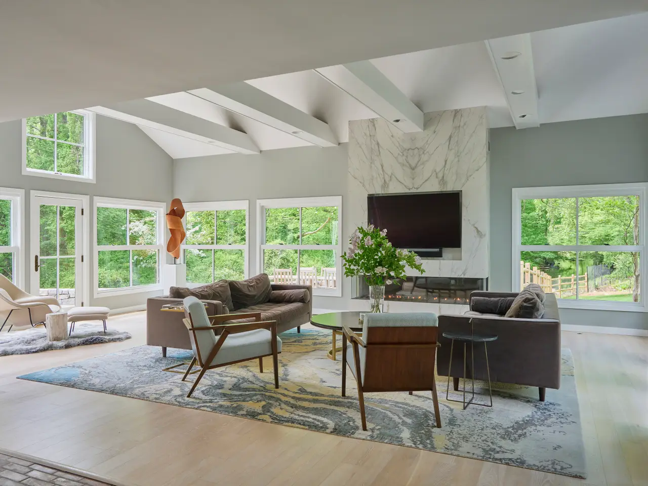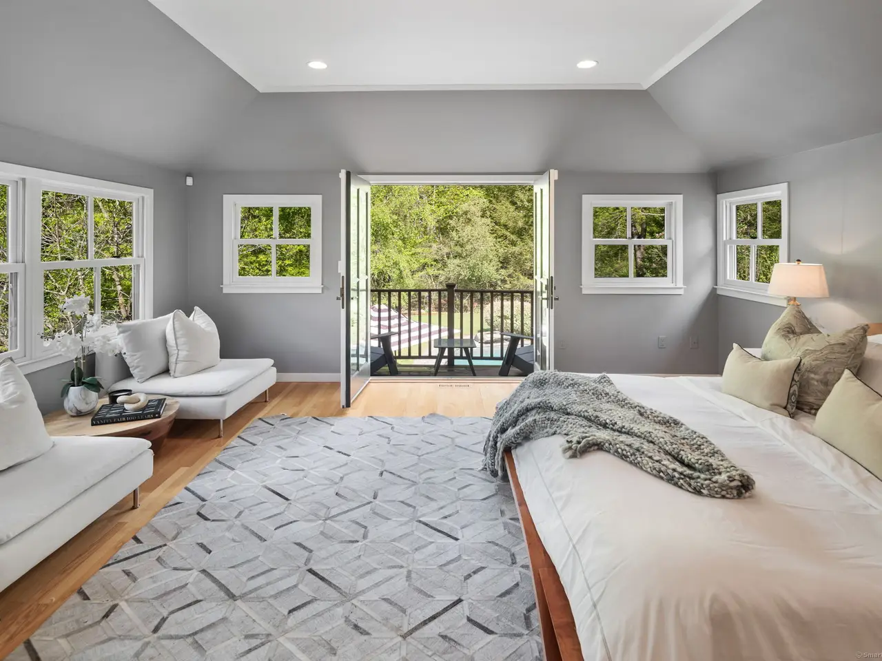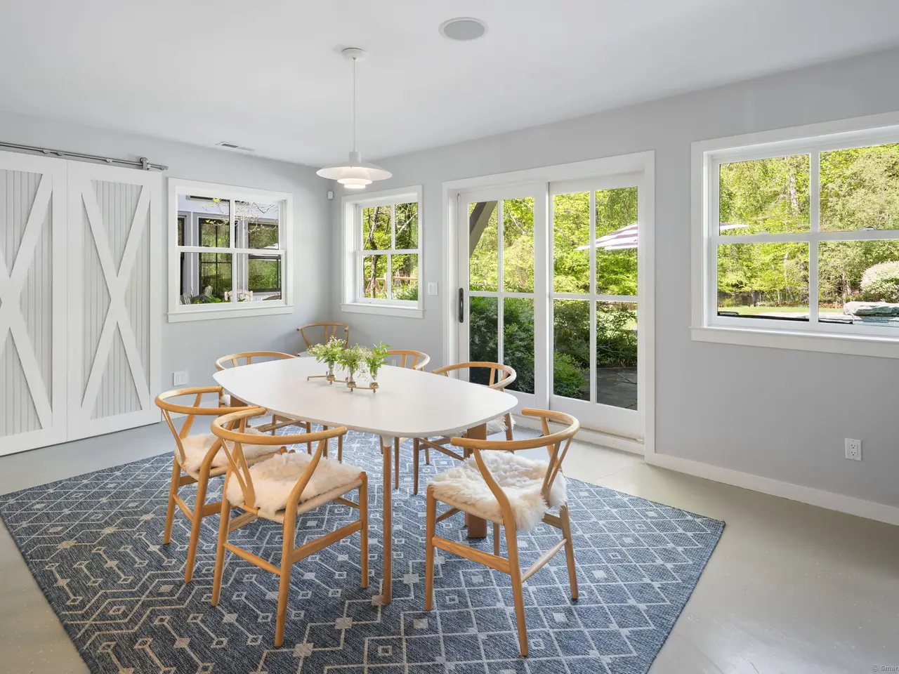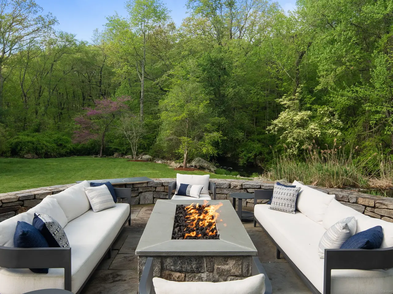 California meets New Canaan in this William Wurster inspired transitional-style masterpiece set on 2.54 private acres on New Canaan's desirable west side that's so convenient to town. This extensively renovated home has over 100 custom windows and 16 doors bringing the outside in from every room. Amazing sun-drenched living space with wonderful views from EVERYWHERE. French doors lead to expansive bluestone terraces, a beautiful gas fire pit for entertaining, meticulously manicured flower gardens, pool, spa and river. Five bedrooms, four-car garages, au pair suite and an exceptionally designed layout make this home a sensational haven with the warmth of a colonial but so fresh!