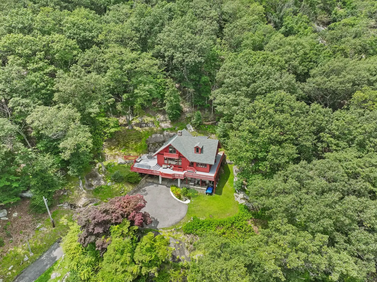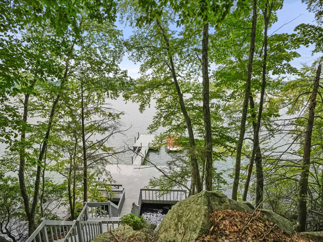 One-of-a-Kind Lakefront Retreat on Candlewood Lake - 14+ Acres of Pure Privacy & Panoramic Views. Perched high above Candlewood Lake on over 15 acres of pristine woodland, this truly exceptional lake cottage offers an unmatched combination of direct waterfront access, total privacy, & sweeping 180-degree lake views. The home is a nature lover's dream. Meander down a private wooded trail & steps to your secluded dockside oasis. Lovingly maintained by its stewards, the home exudes warmth & charm. A wraparound deck provides multiple vantage points to soak in the breathtaking scenery. Inside, the layout is thoughtfully designed to highlight the views from nearly every room. The family room features walls of windows that bring the outdoors in. The dining room boasts a stunning stone fireplace & a large picture window overlooking the lake. The Kitchen, Laundry, a bedroom & full bath complete the main level. Upstairs, you'll find a Primary with its own full bath & private balcony. A second bedroom completes the upstairs, which enjoys its own balcony with the best views in the house! Recent upgrades include a newer roof, fresh paint, & updated mechanicals-this home is move-in ready. The offering includes the main home on 4.31 acres, a neighboring 3-acre parcel, and an additional 7.11 acre lot providing endless possibilities for expansion, or simply enjoying the untouched natural beauty. This is more than just a home-it's a lifestyle. There is truly nothing else like it on the market.