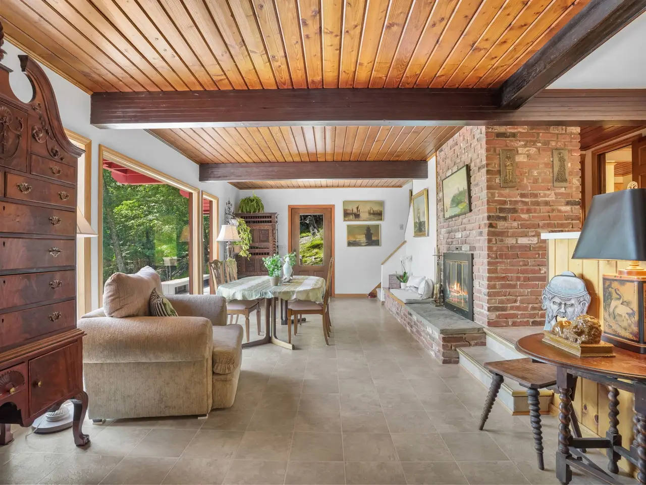 Stunning stone fireplace in dining room