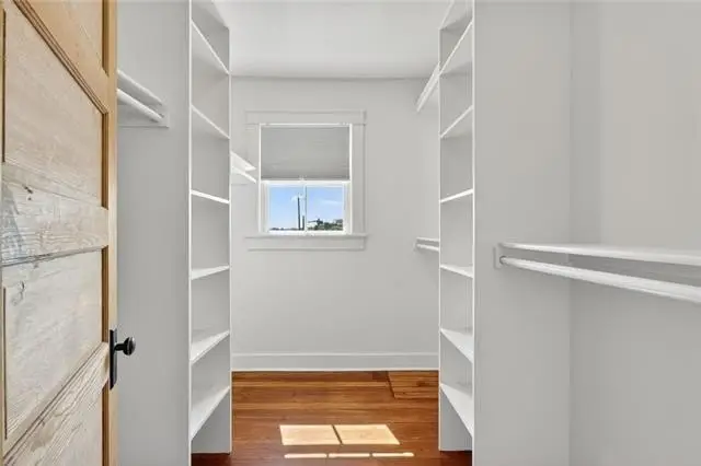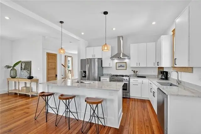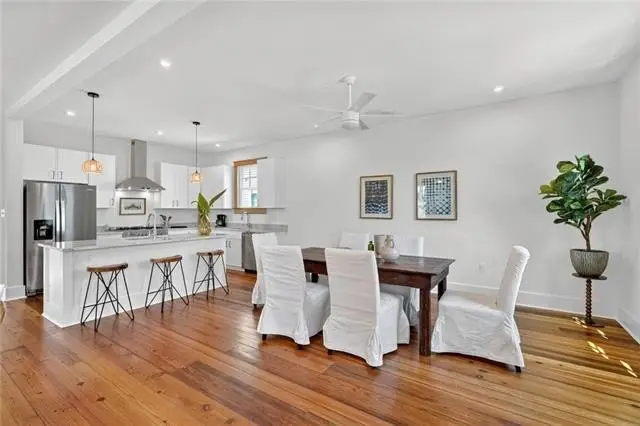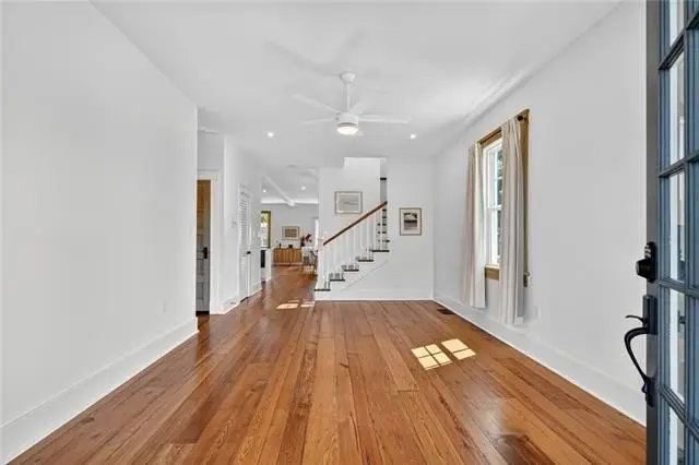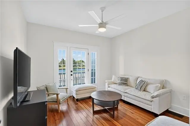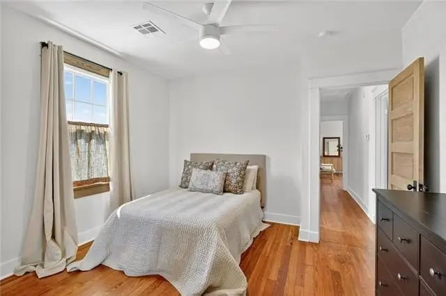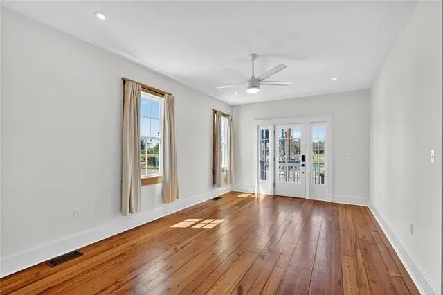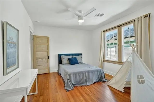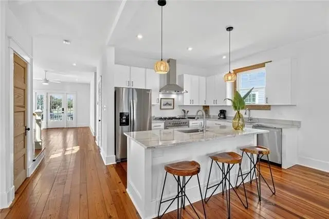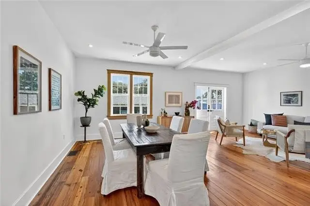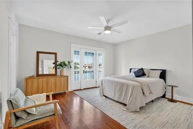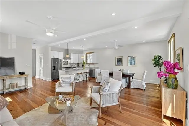 Set along the picturesque Bayou St. John, this fully restored historic two story bungalow was completely renovated and expanded in 2025, seamlessly blending classic architectural character with modern design. The open-concept first floor offers two light-filled living areas and a spacious kitchen with quartz countertops, stainless steel appliances, gas range, and a large center island with deep storage drawers. A downstairs bedroom with full bath is ideal for guests or use as a den. Upstairs, three additional bedrooms each feature en suite baths and walk-in closets. The expansive primary suite boasts two large walk-in closets, a luxurious bath with soaking tub, walk-in shower, and floating double vanity, as well as a full-width balcony with sweeping bayou views. Throughout the home, antique reclaimed wood floors, solid wood doors, and detailed millwork reflect exceptional craftsmanship. Additional features include a dedicated laundry room with custom cabinetry, rear deck, rebuilt garage that doubles as an entertaining space, fully fenced backyard, Hardie Plank siding, updated mechanicals, and a three-year-old roof. Located in coveted flood zone X with affordable insurance, this property offers a vibrant lifestyle right outside your door—with weekly yoga, volleyball, farmers markets, and festivals like Bayou Boogaloo and Jazz Fest just steps away. The nearby Lafitte Greenway provides easy access to the French Quarter and beyond. A rare opportunity to own a spacious, thoughtfully designed home in a prime bayou location at an excellent value.