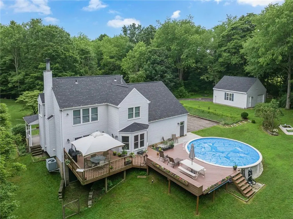 FIRST TIME OFFERED! Welcome to this stunning 4-bedroom, 3.5-bathroom home nestled on 7.48 acres with a pool and extra garages. This spacious home features numerous updates, including new windows and a new roof in 2022. Step into the beautiful eat-in kitchen filled with natural light - perfect for family gatherings and everyday meals. The finished basement includes a second kitchen, a gorgeous bathroom with heated floors, and additional living space. The upstairs boasts a huge bonus room with tons of storage that can be used as the 4th bedroom or extra living space. There is a 3-car attached garage plus a large 2-car detached garage, offering ample space for vehicles, tools, or projects. Don't miss this incredible opportunity to own a private home with room to grow both inside and out. This home blends comfort, style and functionality!