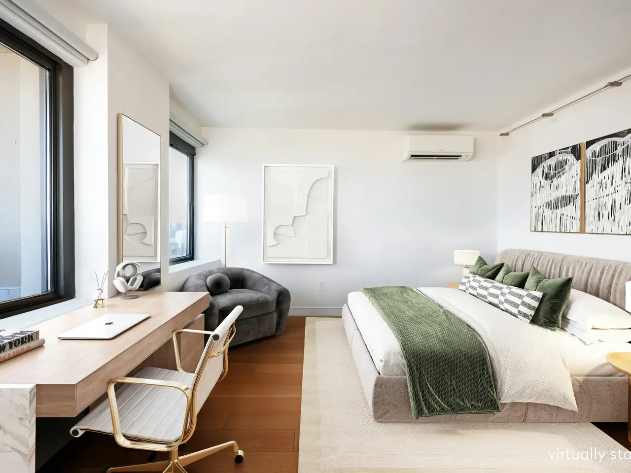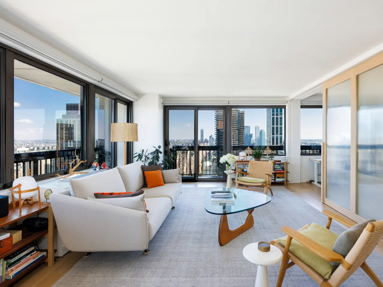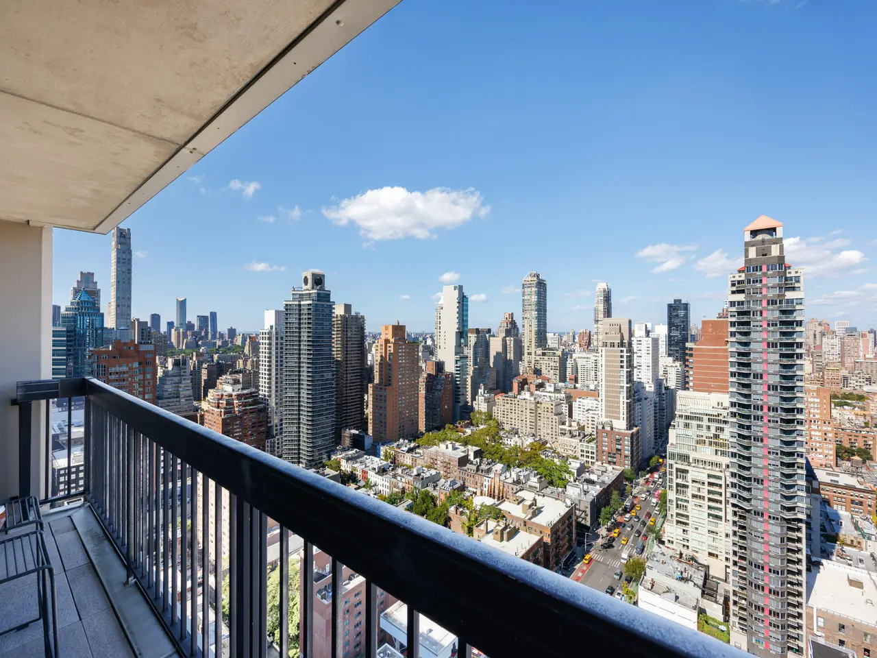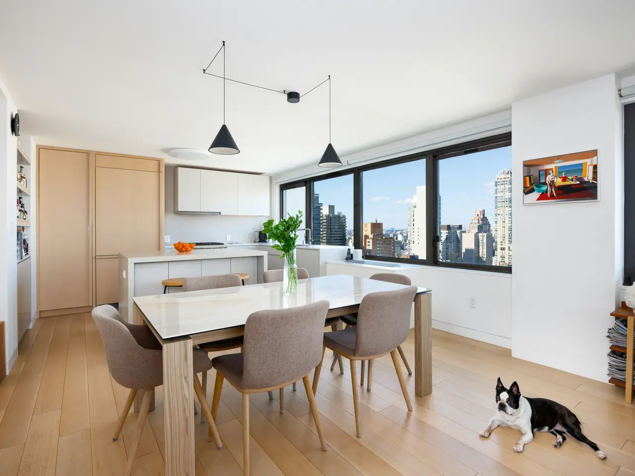 A Published Masterpiece in the Sky Perched on the coveted northeast corner of the 35th floor, this residence is offered for the first time since its masterful designer renovation by Sarah Zames & Colin Stief of General Assembly. Reimagined with a clean material palette, the home balances refined architecture with effortless livability. Walls of glass frame panoramic views across the ever-changing East Side skyline, creating a home of many moods and scenes. With balconies on both sides of the apartment, the vistas can be enjoyed from the outdoors as well. As Dezeen observed in its feature on the residence, the architects sought "a balance between the feeling of being in the air, while being grounded by the weight of the building." The custom kitchen is anchored by a concrete waterfall island with a built-in wine fridge and microwave drawer. Light wood cabinetry frames the Thermador suite, including a 6-burner gas cooktop and oven, Sapphire Glow dishwasher, and refrigerator with Open Door Assist- just a gentle touch opens the door, the ultimate luxury detail. Windows line the kitchen, filling the space with light and lively city views, turning daily routines into moments of enjoyment. Honed Caesarstone counters and a sophisticated ceramic tile backsplash complete the modern design, while built-in shelving offers a stylish home for barware, vases, and everyday essentials. The primary suite offers a serene retreat, complete with two closets plus a 14-foot walk in by California Closets. Pocket doors provide quiet separation, while custom millwork introduces floating bedside tables and subtle ledges for art or keepsakes. A unique architectural opening filters natural light between the bedroom and bath, elevating both spaces. The ensuite is finished with a travertine vanity, soaking tub, Japanese washlet, matte black fixtures, and richly hued vertical tile, a striking marriage of warmth and refinement. The second bedroom includes a generous closet and is enclosed by a sliding panel of reeded glass, a purposeful design choice that allows natural light to filter through while maintaining privacy. This thoughtful detail makes the room ideal not only as a bedroom but also as a home office or den. The other full bath features a stall shower, midnight cabinetry, travertine vanity, brass fixtures, and a Japanese washlet. Additional thoughtful details include discreet TV wall behind sliding door, built-in entry storage, motorized shades, Lutron-controlled lighting, anti-UV window films, and split AC units in the bedrooms. The Landmark is a full-service luxury building offering a modern lobby, landscaped roof deck, garage with Zipcar, and on-floor washer/dryer access. Two dogs or cats are welcome per apartment!