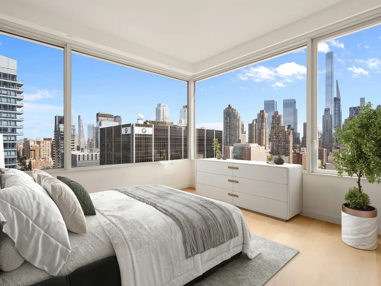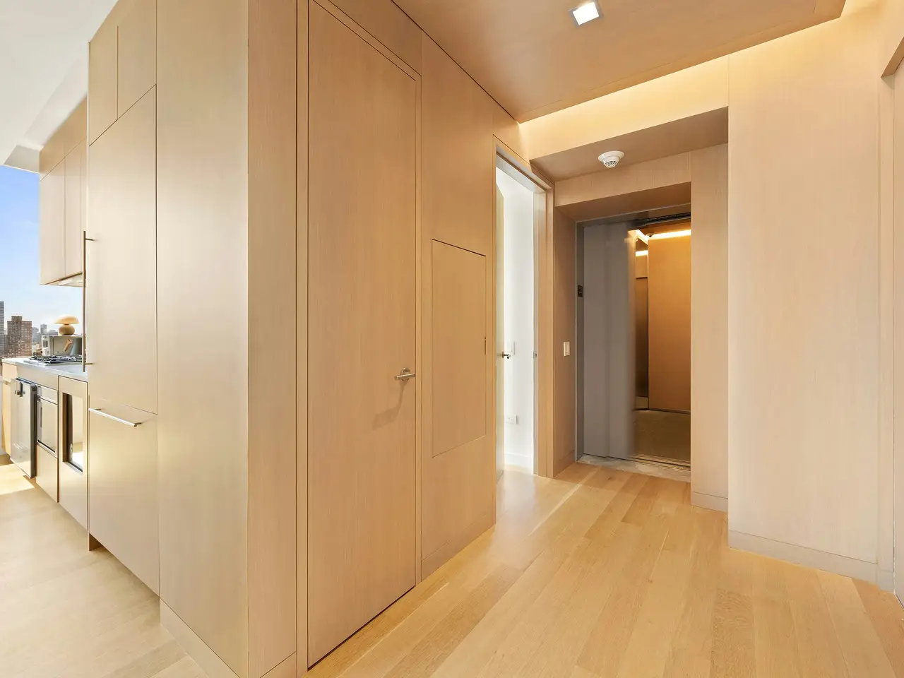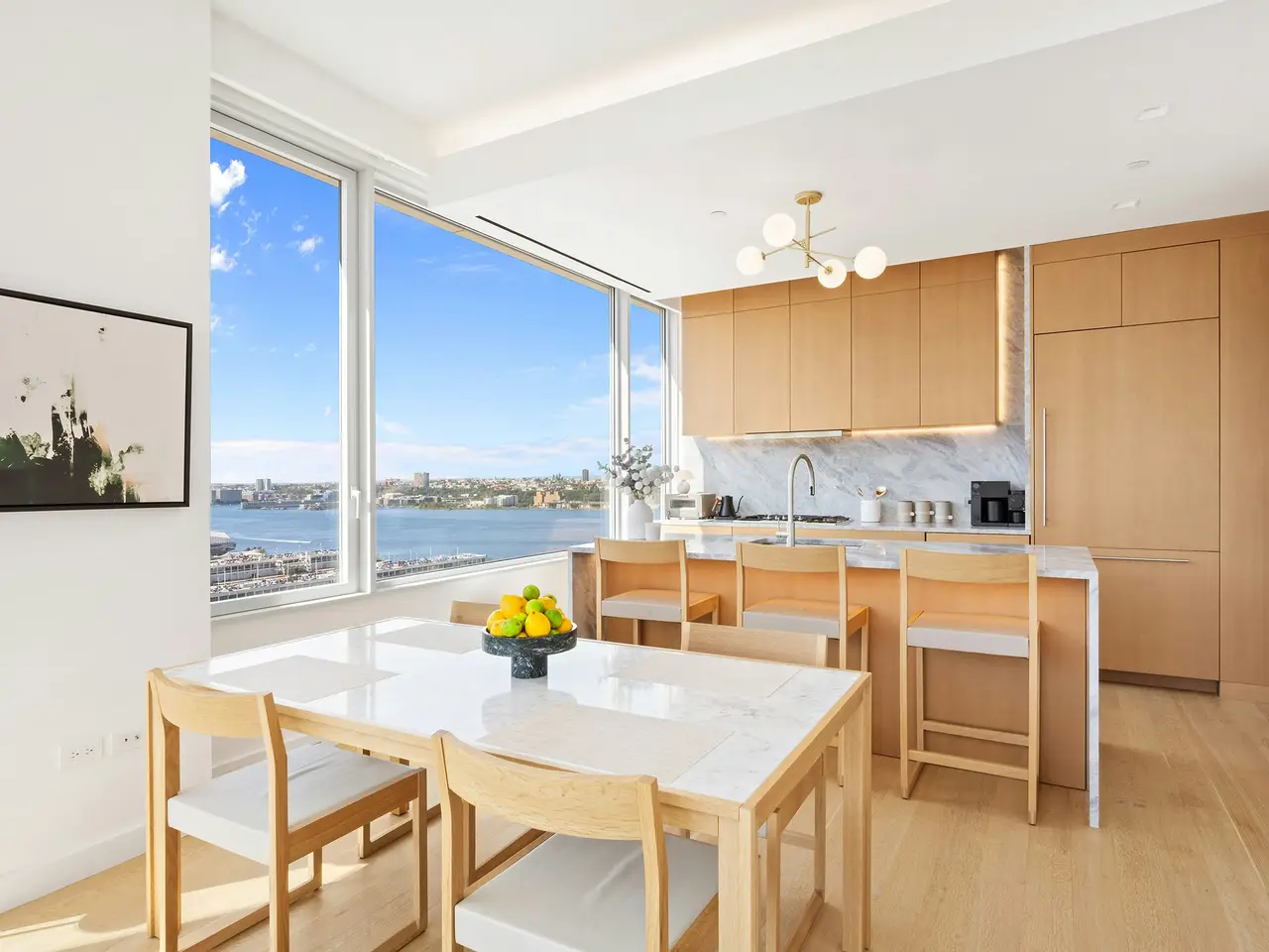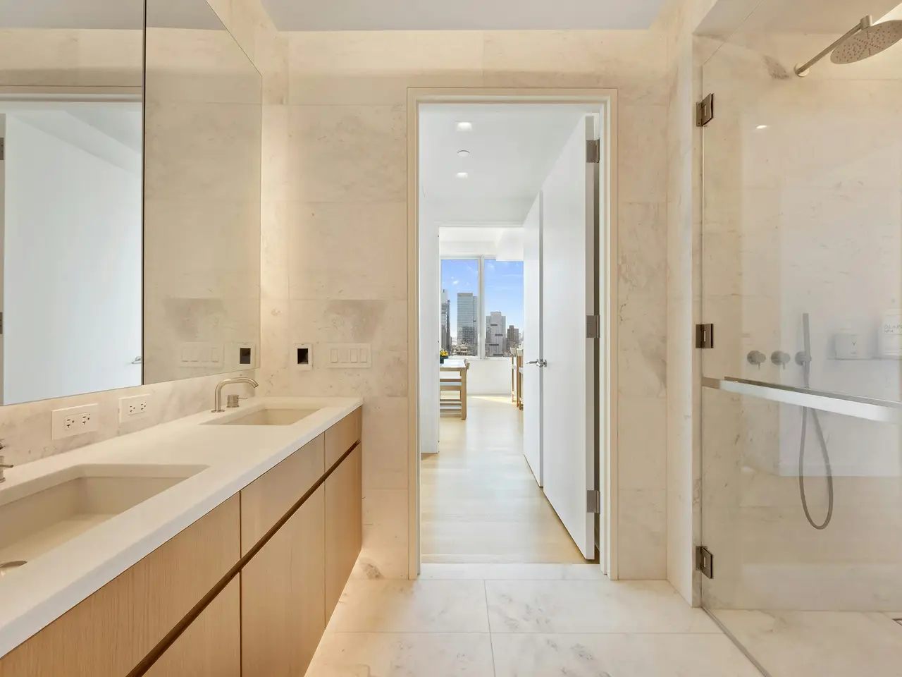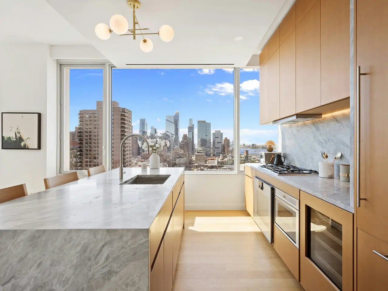 Welcome to Residence 25A at 611 West 56th Street - a sophisticated two-bedroom, two-and-a-half-bath home offering more than 1,400 square feet of thoughtfully designed living space, complete with the privacy and elegance of direct elevator access. Designed by acclaimed architect Álvaro Siza, with interiors by Gabellini Sheppard, this corner residence is bathed in natural light from oversized windows, framing sweeping views of Uptown, Midtown, and the dramatic downtown skyline to the south. Just off the entry, a well-placed powder room offers convenience and discretion for guests. The windowed chef's kitchen combines striking design with everyday functionality, featuring Italian walnut cabinetry, honed Grigio Nicola marble countertops and backsplash, and a custom waterfall-edge island. Top-of-the-line Gaggenau appliances - including a gas range, speed oven, refrigerator, freezer, and dishwasher - make the space ideal for both daily living and effortless entertaining. The expansive primary suite enjoys a dramatic corner exposure and a spa-inspired five-fixture bathroom with radiant heated floors, honed Tundra Gray marble, and custom lighting that creates a warm, inviting ambiance. A spacious secondary bedroom with its own en-suite bath ensures comfort and privacy for family or guests. Residents of 611 West 56th Street enjoy an elevated lifestyle with exclusive access to curated amenities, including a serene garden mezzanine, a state-of-the-art fitness center with yoga and training studios, steam rooms, a media lounge with billiards, a children's playroom, and a refined residents" lounge with formal dining space and a catering kitchen. The unit trades with a private storage cage and private parking is also available. Perfectly positioned at the crossroads of the Upper West Side and Midtown West - moments from Riverside Park South and Central Park - this residence is a quiet sanctuary at the heart of Manhattan's vibrant west side.