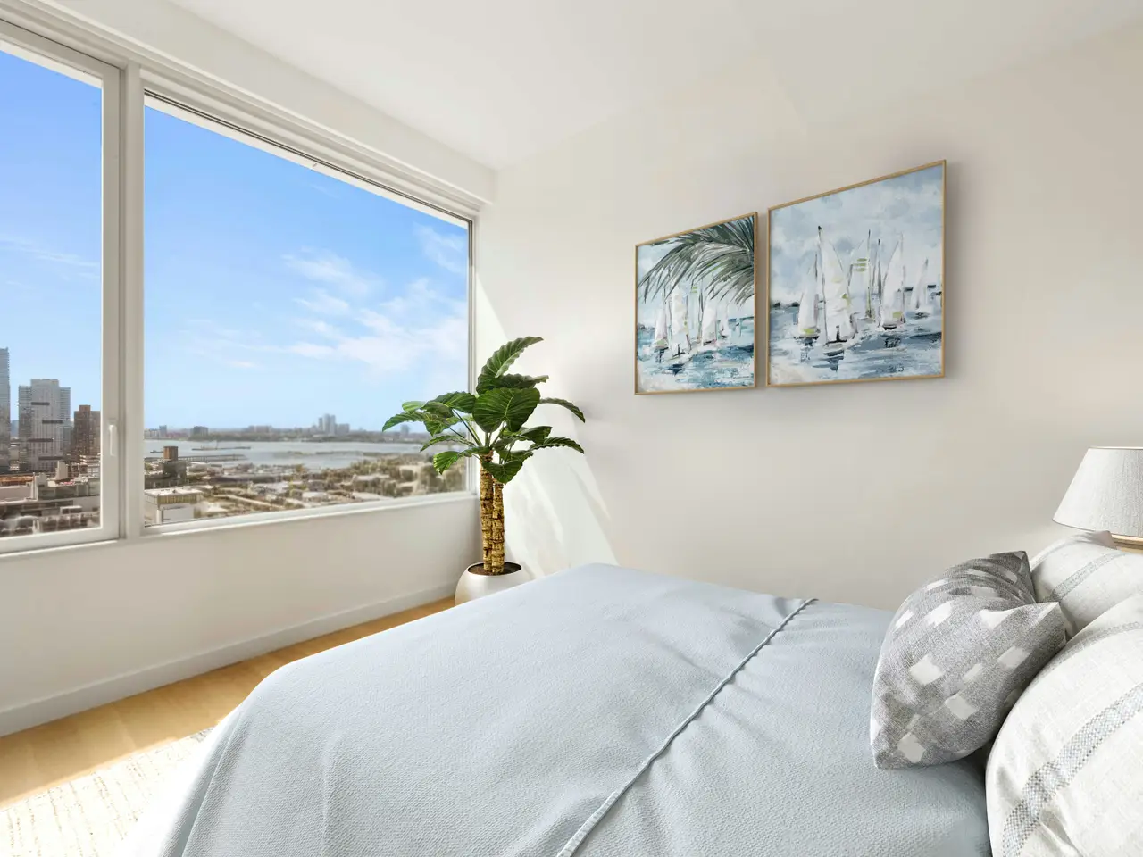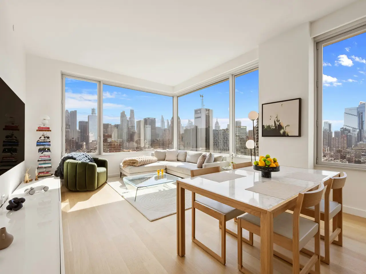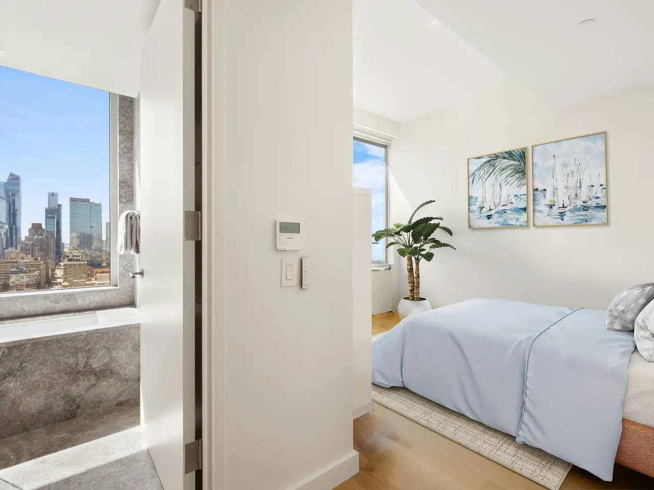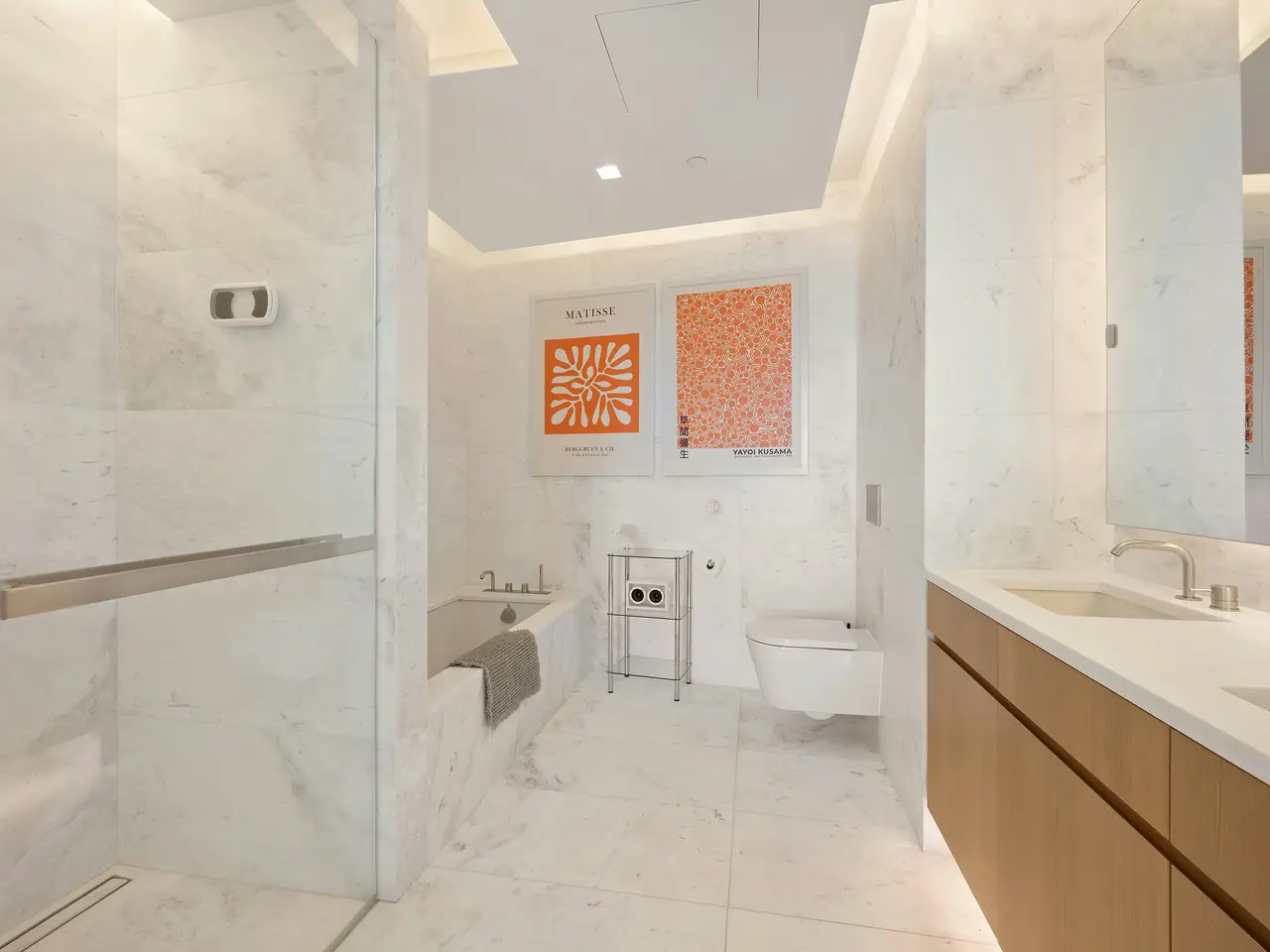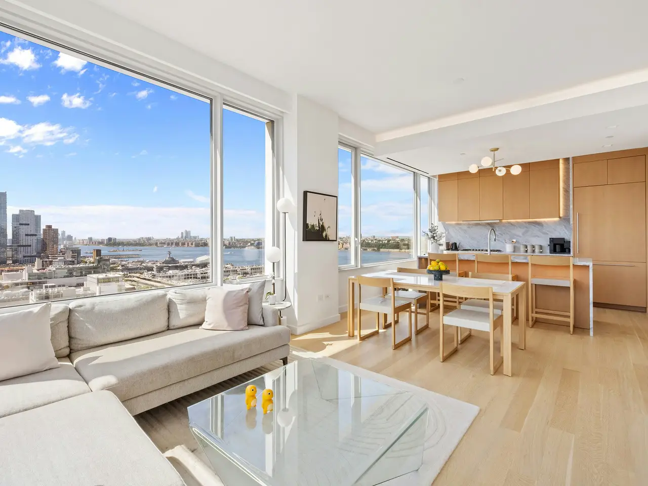 Welcome to Residence 25A at 611 West 56th Street - a sophisticated two-bedroom, two-and-a-half-bath home offering more than 1,400 square feet of thoughtfully designed living space, complete with the privacy and elegance of direct elevator access. Designed by acclaimed architect Álvaro Siza, with interiors by Gabellini Sheppard, this corner residence is bathed in natural light from oversized windows, framing sweeping views of Uptown, Midtown, and the dramatic downtown skyline to the south. Just off the entry, a well-placed powder room offers convenience and discretion for guests. The windowed chef's kitchen combines striking design with everyday functionality, featuring Italian walnut cabinetry, honed Grigio Nicola marble countertops and backsplash, and a custom waterfall-edge island. Top-of-the-line Gaggenau appliances - including a gas range, speed oven, refrigerator, freezer, and dishwasher - make the space ideal for both daily living and effortless entertaining. The expansive primary suite enjoys a dramatic corner exposure and a spa-inspired five-fixture bathroom with radiant heated floors, honed Tundra Gray marble, and custom lighting that creates a warm, inviting ambiance. A spacious secondary bedroom with its own en-suite bath ensures comfort and privacy for family or guests. Residents of 611 West 56th Street enjoy an elevated lifestyle with exclusive access to curated amenities, including a serene garden mezzanine, a state-of-the-art fitness center with yoga and training studios, steam rooms, a media lounge with billiards, a children's playroom, and a refined residents" lounge with formal dining space and a catering kitchen. The unit trades with a private storage cage and private parking is also available. Perfectly positioned at the crossroads of the Upper West Side and Midtown West - moments from Riverside Park South and Central Park - this residence is a quiet sanctuary at the heart of Manhattan's vibrant west side.