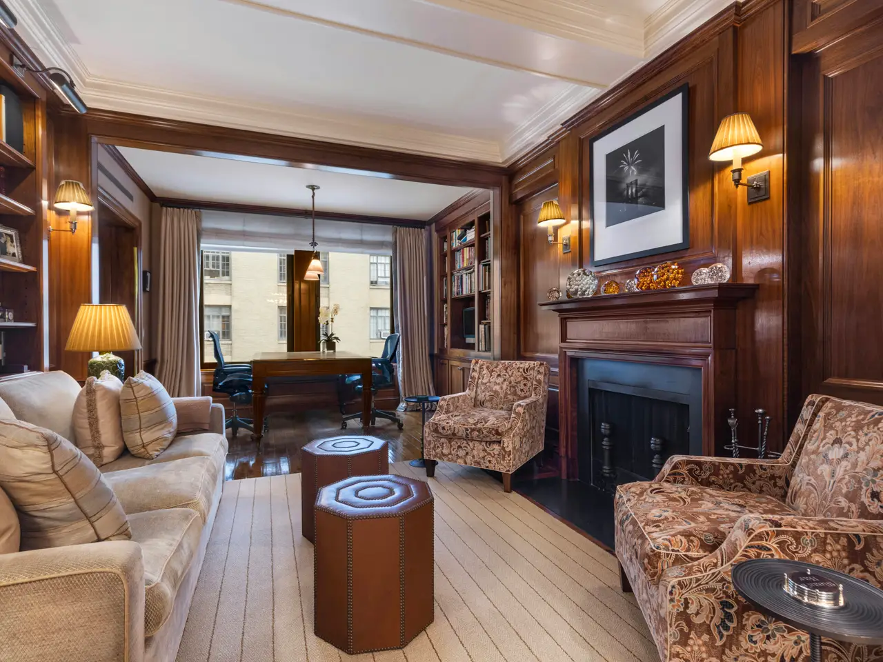 Fireside walnut paneled library