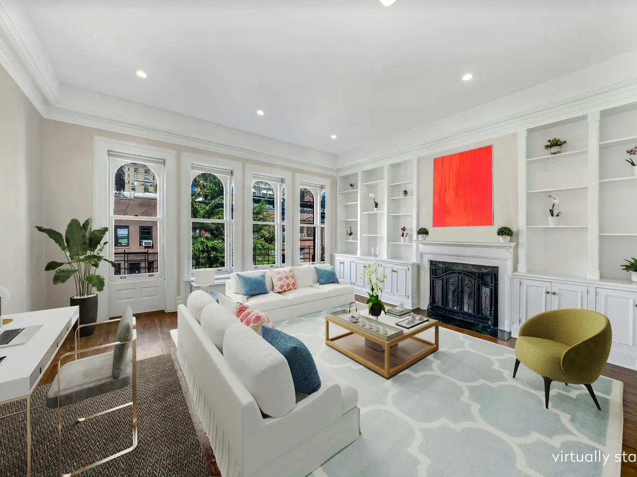 This absolutely beautiful floor-through home is located on the top floor of a classic New York City brownstone. No expense was spared to create this wonderful oasis with its own private roof top terrace.    As you enter the apartment you are drawn to the beautiful arched windows in the living room which overlook this idyllic tree-lined block just off Central Park. The generously proportioned room also boast a working wood-burning fireplace, high ceiling custom shelving and cabinetry, a cleverly disguised large closet and stairs to your private rooftop oasis. The lovely kitchen has a Viking range and stainless steel appliances including two separate dishwashing drawers, marble countertops, a lovely island with seating, abundant storage and high ceilings is simply perfect for cooking and entertaining. The beautiful bathroom is adorned with high-end finishes throughout. .This lovely abode also boasts a washer/dryer and abundant storage. The primary bedroom overlooks the beautiful townhouse gardens of the townhouses on West 69th Street. The impressive bedroom has been outfitted with gorgeous custom closets including one that has two separate entrances. The final gem on this gorgeous home is the private rooftop terrace that is large enough to allow for separate eating sunbathing and lounging areas, while also offering custom lighting and storage areas.