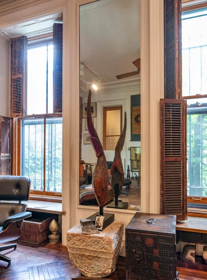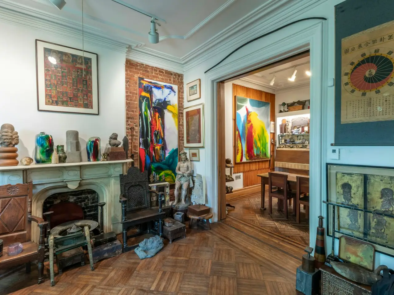 Welcome to 169 East 94th Street, a 4-story Neo-Grec townhouse located on a quiet tree-lined block in historic Carnegie Hill. Built circa 1899 and retaining much of its original detail, the house is part of a unique enclave of 24 uninterrupted row houses positioned between 94th and 95th Streets, each with unusually deep gardens offering a bucolic retreat from the hustle and bustle of city life. Bathed in sunlight and adorned with period details, this approximately 19-foot wide home is built on a 100-foot lot and features grand-scaled rooms with high ceilings, intricate plaster moldings, 6 wood-burning fireplaces with marble mantles, original parquet floors and a flexible 6-7 bedroom layout. Previously owned and occupied by a world renowned abstract impressionist artist, the house is a living museum with many of the walls, doors and cabinetry covered and collaged with Japanese prints, calligraphy on rice paper, placards and other quirky drawings and objects found in the shops and streets of Paris. A permanent part of the house, these thought provoking images provide a glimpse into the mind of an artistic genius and can either be preserved by the new owner, or donated to the artist's foundation. Beyond its artistic provenance, this unique property is primed for restoration and offers an additional 4,222 square feet of FAR allowing one to expand for a total of 7,678 square feet! A truly rare opportunity to create a legacy property in one of Manhattan's most peaceful neighborhoods with great restaurants, shopping, Central Park and some of New York's finest private schools right at your doorstep. Layout: Garden Floor: Under the stoop entrance with storage leads to a front office, separate kitchenette, rear bedroom with full bathroom and access to an expansive private garden. Parlor Floor: Tall stoop with double entrance doors leads to a front kitchen with original mahogany details and pier mirror, powder room, separate dining area and pocket doors opening onto a large Living room with wood-burning fireplace overlooking the garden. Third Floor: Original stairs and rails lead up to three light-filled bedrooms (one with fireplace), a large dressing room and a full bathroom. Fourth Floor: Three bright bedrooms (two with fireplaces) and a utility bathroom. Cellar: Storage, Washer-dryer, mechanicals