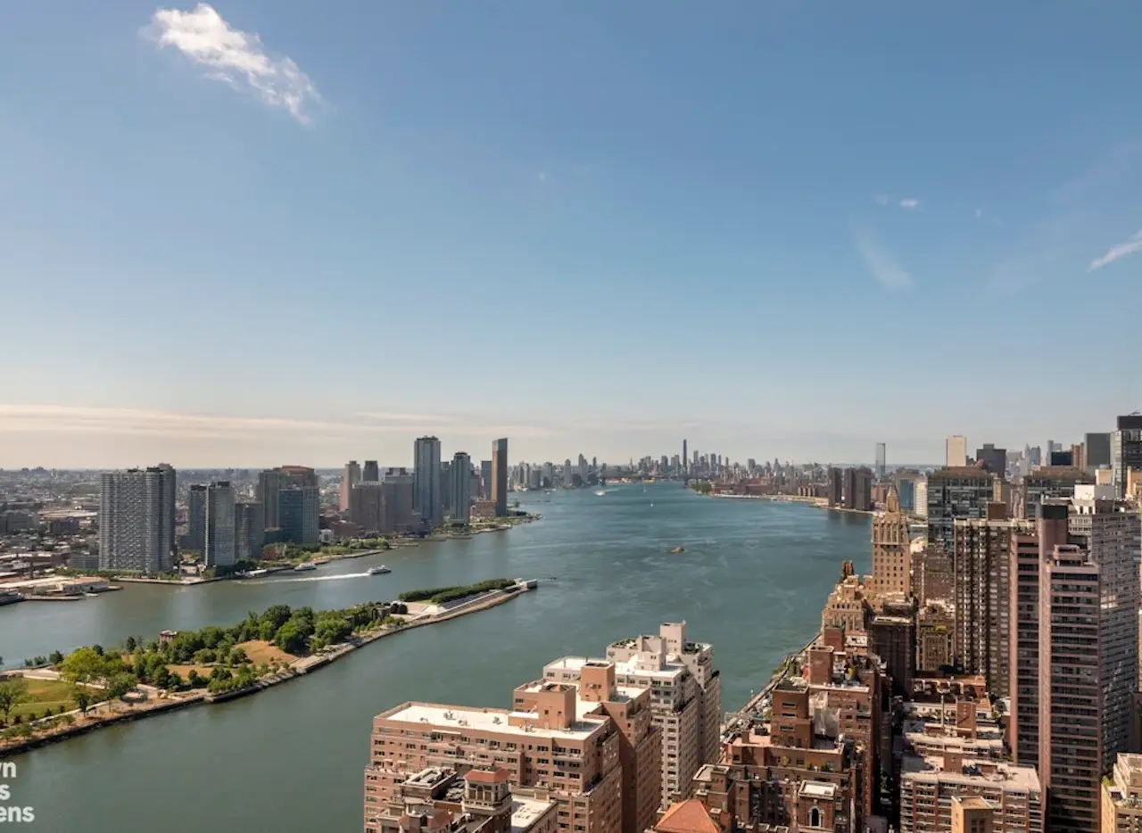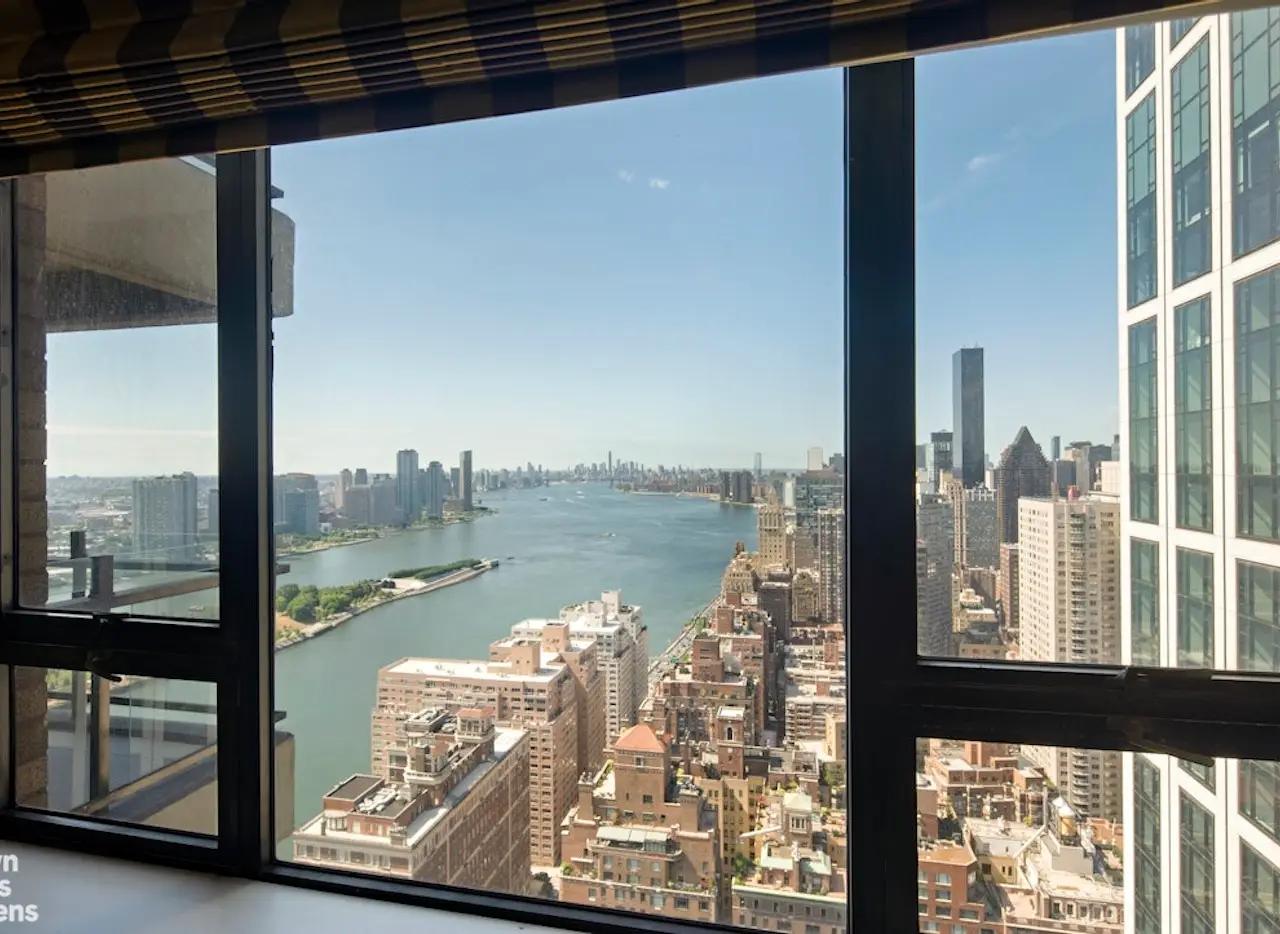 Spectacular views dominate every room of this spacious 42nd floor luxury home. Walls of windows capture the mesmerizing activity of all varieties of water going vessels on the East River as well as beautiful city skyline views south and west. At approximately 1800 sq. ft. with nine ft. ceilings there is a grandeur to this 2 bedroom 2.5 bath home in The Sovereign. The gracious entry opens to a large south facing living room with a south and west facing dining area. Adjacent to the living room is the second bedroom which currently has French Doors opening to the room. The primary bedroom has abundant closet space. There are two ensuite marble baths plus a powder room. The large windowed kitchen has a separate laundry area and service entrance for deliveries from a manned elevator. The Sovereign is a full service luxury building with a lobby level gym, valet parking garage with Tesla charges, and year round heat and a/c available. The building is surrounded by well-maintained park like gardens. The lobby is furnished with midcentury classics such as Venini chandeliers and curated modern art. "When The Sovereign was built in 1974, Paul Goldberger of The New York Times noted, "The Sovereign is in the super luxury category." The Emery Roth designed building has a lobby that "extends under the entire building, and there are four semiprivate halls per floor - a welcome (and expensive) alternative to the long, double loaded corridor. Such an arrangement has probably not been used in any New York building since the nineteen-thirties." Then as now, with only two apartments per floor, the residents are treated to impeccable world class service is provided by the staff that includes sentry, doorman, concierge,on-site management, valet parking in the 24 hr. garage equipped with Tesla charges. This mid-century building has an elegant lobby distinguished by Carlo Scarpa designed Venini chandeliers and rosewood paneling." Amenities include a state-of-the-art windowed gym, and manicured gardens surrounding the building.