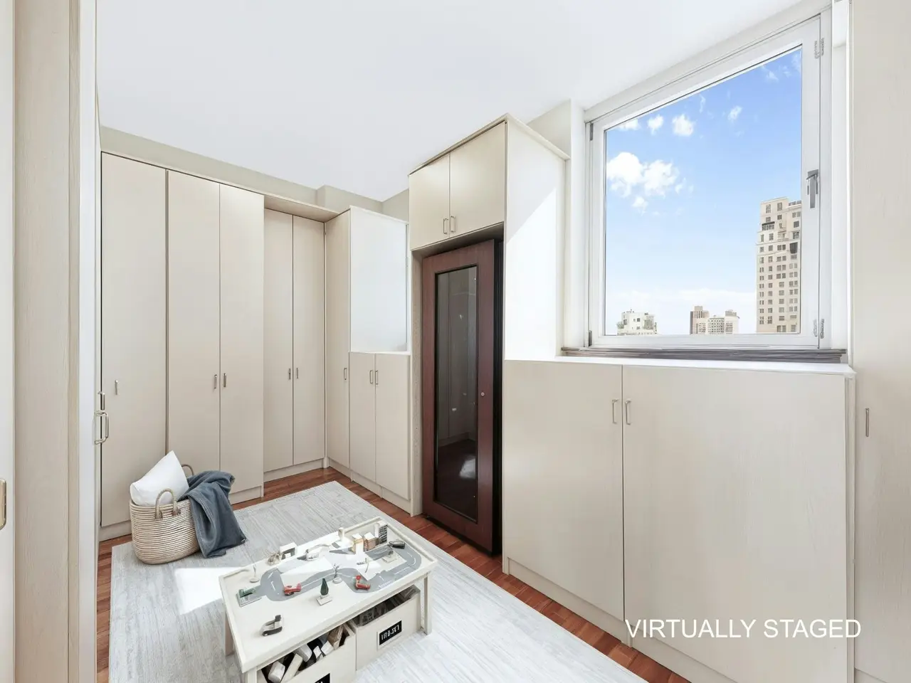 AN EXPANSIVE FULL-FLOOR HOME, FOUR-BEDROOMS, FIVE-BATHROOMS + DEN WITH VIEWS FOREVER... THE PROPERTY: Welcome to a full-floor Upper East Side dream home that offers panoramic skyline views from every room and the opportunity for custom design in every direction. The 19th floor at 201 East 80th Street is an expansive residence of approximately 3,500 square feet (interior), featuring five bedrooms, five bathrooms, remarkable storage, high ceilings, beautiful wood floors, and walls of windows throughout, as well as a stunning layout comparable to that of a private home. Exit the elevator onto a private landing. As you enter the apartment, you are welcomed home by an elegant, sunlit gallery with floor-to-ceiling windows that flows into a gracious foyer, with a closet for guests. The sprawling living room, framed by floor-to-ceiling windows with stunning views in every direction, seamlessly opens into a formal dining room with direct access to a private balcony—ideal for entertaining with a view. Adjacent to this space, double pocket doors lead to a handsome library that serves as an inviting retreat with flexible functionality. The library also opens onto a second private terrace, providing moments of quiet luxury, and can be efficiently converted into a fifth bedroom if desired. The windowed kitchen features custom cabinetry, a full suite of stainless steel appliances, a banquette, and a table that allows for morning coffee and informal dining. There is an option to open the kitchen into the formal dining room for those who prefer an open-plan layout. This wing of the apartment also features a remarkable storage room, which can serve as a play area, an au pair room, or be transformed into a fabulous laundry/mudroom. There is an expansive, light-filled primary suite with a sitting room. It features three exposures with sweeping city views, two separate, en-suite bathrooms, and five substantial closets. On the opposite wing, there are three additional bedrooms, a sun-soaked home office/bedroom with an adjacent guest bathroom, and two additional and beautifully proportioned bedrooms with en-suite bathrooms. Each room boasts remarkable city views, excellent light, ample closet space, and privacy from the primary suite and main rooms. Additionally, this wing features a Washer/Dryer and storage closet. THE BUILDING: The Richmond Condominium offers residents a full-service experience, featuring a 24-hour door attendant, concierge, bike room, and a beautifully landscaped roof terrace equipped with grills. Ideally situated in the heart of the Upper East Side, the residence is only moments away from Central Park, Carl Schurz Park, The Met, Neue Galerie, 92nd Street Y, and some of the city’s most sought-after dining destinations, providing endless inspiration and entertainment. Transportation is convenient, with easy access to the Q, and six trains are just a short walk away. THE BUILDING AMENITIES: Full-Time Doorman Concierge Service Common Outdoor Roof Deck Barbecue Area Bike Storage Common Storage Central Cooling Laundry Features: In-Unit BUILDING POLICIES: Pied-A-Terre Allowed 90% Financing Allowed Pets Allowed **SOME PHOTOGRAPHS ARE VIRTUALLY STAGED OR ACCESSORIZED.