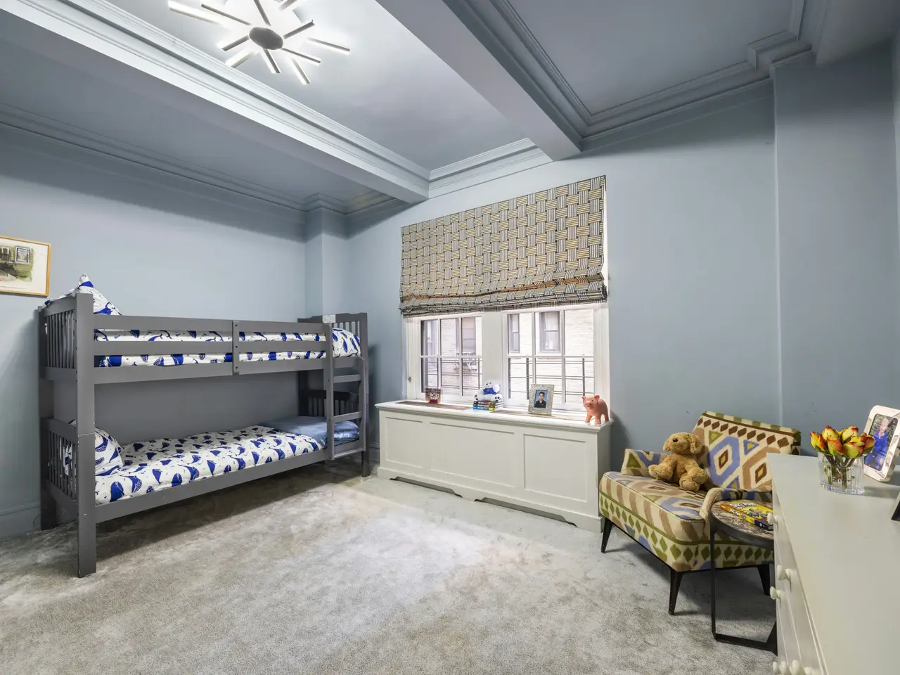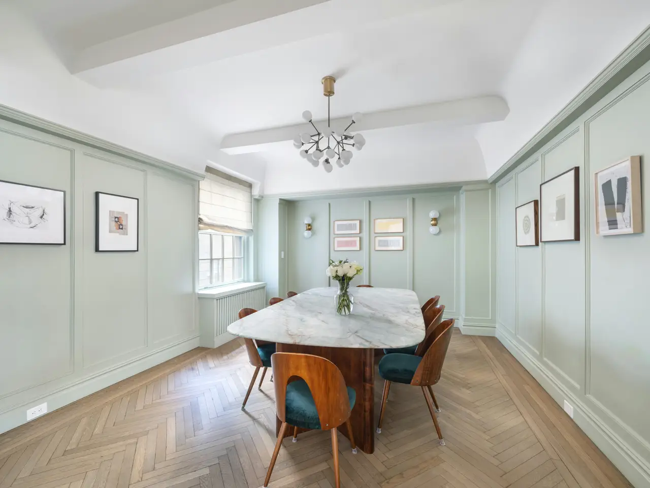 Move right into this glamorous prewar "Classic 7" recently renovated and designed by award-winning, AD100 designer, Giancarlo Valle. This spacious and sunny, south-facing home has approximately 9'5" ceilings, pretty treetop views and is in one of the most convenient Upper East Side locations just off Park Avenue. The layout of this elegant residence is thoughtful and timeless. A gracious entry foyer opens into a large living room with oversized mullioned windows that let in lots of light and the formal dining room is adjacent making the space perfect for both elegant entertaining and easy everyday living. An attractive hallway gracefully separates the entertaining spaces from the bedroom wing. All 3 bedrooms are bigger and brighter than typically found in this size of a home and the marble windowed bathrooms are sophisticated and functional. The eat-in kitchen boasts white macauba quartzite slab counters, a custom stainless steel backsplash, a bounty of cabinets and top-shelf appliances by Wolf (gas stove, oven and vented hood), Bosch (dishwasher) and Subzero (refrigerator.) Nearby is the staff room - a bonus space ideal as an office or nursery with a new electric washer and vented dryer. Other details include thru wall air conditioning, classic moldings, herringbone hardwood floors and a decorative plaster fireplace. Built in 1927, this full-service doorman building is pet friendly and offers a planted roof deck, live-in resident manager, central laundry, bike room and a large private storage space that transfers with the home.