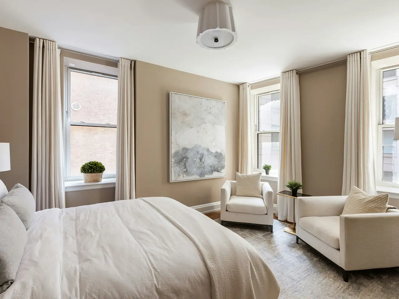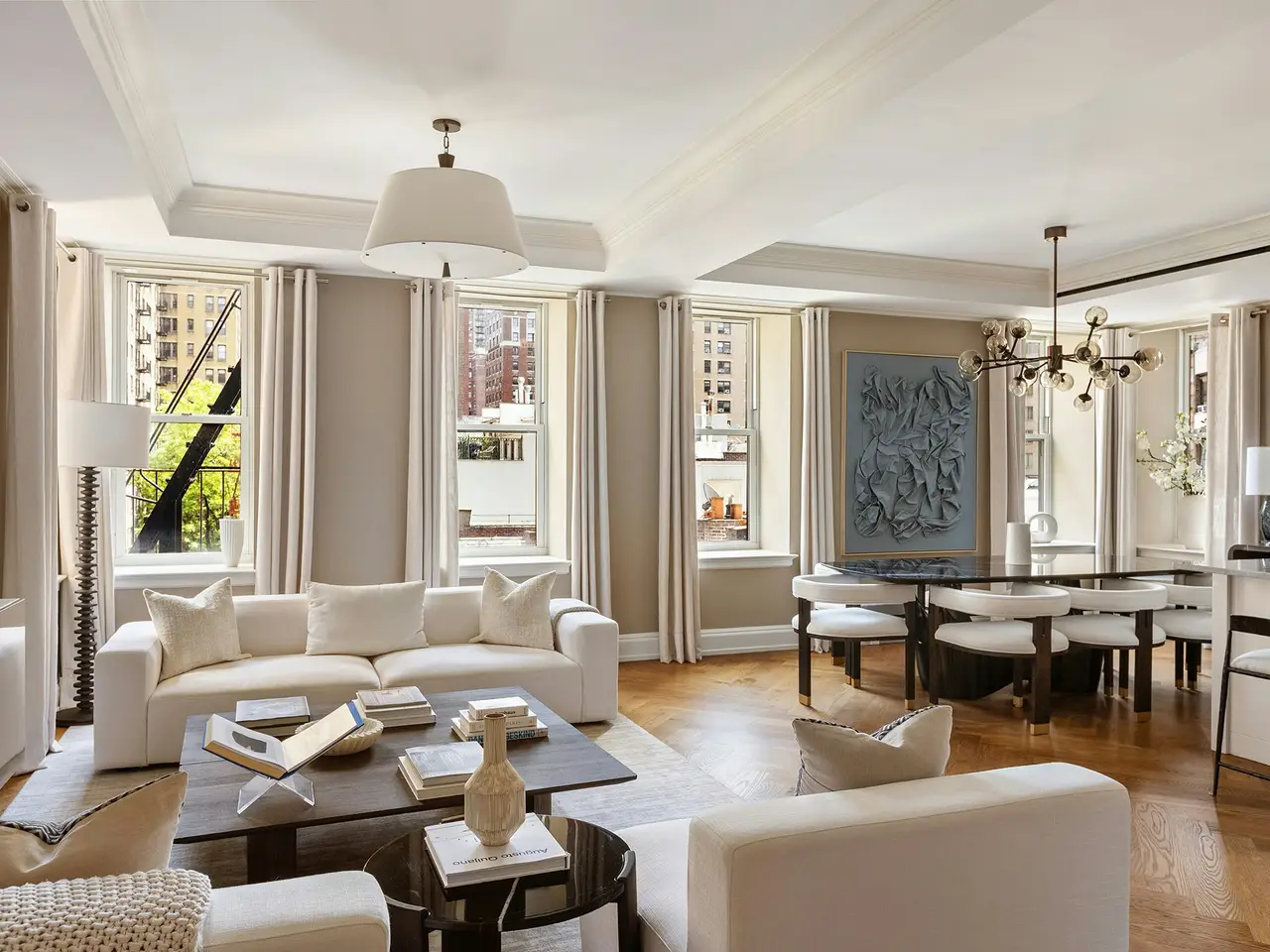 No board approval required for this purchase. This a grand pre-war co-op (with condo like rules when selling or subletting- just a waiver of right of first refusal!) sprawling 2,931 sq. feet (per Offering Plan) offering 4 Bedrooms, 4.5 Bathrooms, sunlight streaming in all day, with windows facing East, West, North and South (all directions)! Brilliantly sunny and facing East from the living room, the primary view is both colorful and serene. Oversized windows look out over green trees and assorted building backyards of varying shapes and sizes, nestled between West 71st-West 72nd, with a peek of high-rise buildings and blue skies in the distance. Servicing the square 25-Foot Wide "Great Room", with regal beamed ceilings and paneling, is the open eat-in-kitchen that would inspire the most discerning chef. Barstools line up along the expansive overhang of the quartzite island, while custom-built, lacquered kitchen cabinets provide an abundance of storage. The Verona induction range vents externally, and an added Miele Convection/Microwave wall oven provides additional high-speed cooking/heating options. The Miele Dishwasher is disguised with beautiful cabinet paneling, and a side-by-side Gaggenau Refrigerator/Freezer offers very spacious storage, and there is also a separate wine fridge. This luxurious kitchen is part of an open, loft-like space (nearly 600 sq. feet) that includes the formal dining area and living room. Additional bells and whistles of the residence include: Solid 5" white oak hardwood floors laid in a handsome herringbone pattern, central air conditioning, and a separate windowed laundry/"Mud" room with a Bosch washer and dryer (a welcome and rare bonus!) Bedroom exposures primarily face West and are flooded with afternoon sun. Peering over a private landscaped courtyard that belongs to the neighboring "Heritage" Condo building, is a peaceful green space, ensuring a quiet setting outside of your primary bedroom windows. While each bedroom is complete with an en suite bathroom, huge closets, oversized windows and ample privacy, the Primary Bedroom Suite enjoys an exquisite fireplace mantle, huge walk-in-closet and an additional windowed "bonus room". The bonus room can serve as a home office, nursery, dressing room, or even a second walk-in closet! The spa-like bathroom has generous proportions with an oversized soaking tub, double sinks and vanities, a huge windowed shower stall, separate toilet booth, and Italianate mosaic marble tile surfaces. Finished in a soothing color palate of light blues, greys, and white, the primary bathroom offers a serene oasis. Offering over 17,000 sq. feet of pristine, newly built amenities, this luxurious co-op welcomes you home with a full staff with concierge, elegant lobby, double library, private screening room, full fitness center, game room, party room/lounge with kitchen, and a spacious children's playroom. Pets are welcome at the Chatsworth, which is located just across from the Upper West Side's most popular Dog Run. Take a stroll through the lush Riverside Park and you'll find this location has easy access to all transportation (including the express subway station at West 72nd, just two blocks away). Enjoy the best of the Upper West Side, from any vantage point, in every direction!