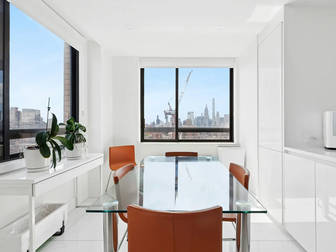 Perched on the 32nd floor, this stunning Upper East Side condominium offers every imaginable highest-end finish, private balcony and sweeping south and east postcard skyline views, filling every room with brilliant natural light. Spanning 1,254 square feet, this 2-bedroom, 2.5-bath residence has been meticulously gut-renovated in collaboration with a renowned architect, blending European sophistication with modern convenience. The open-concept living space is framed by Porcelanosa Carrera porcelain flooring, chosen for both durability and refined style. Expansive low-E double-pane windows enhance the panoramic views while reducing noise and UV rays, ensuring a serene atmosphere throughout the day. At the heart of the home lies a fully customized Poggenpohl kitchen, imported from Germany in glossy white, anchored by a central island and topped with Silestone Eternal Statuaria Quartz, the kitchen is outfitted with a complete suite of top-tier Miele appliances: two large refrigerators, two ovens (including a steam combo), cooktop, hood, dishwasher, and in-unit washer/dryer. King-sized bedrooms, both with elegant en-suite full baths, feature light-colored 8-inch Carlisle wide-plank wood floors, brilliant light and generous storage, including a walk-in California closet in the primary suite. The bathrooms are true sanctuaries, clad floor-to-ceiling in Porcelanosa Carrera porcelain. Every fixture has been carefully selected from the finest European brands. Dornbracht faucets and showers provide precision craftsmanship, while Hansgrohe fixtures add both design and performance. Wall-mounted Duravit vanities and toilets, paired with sleek Geberit systems, maximize space and modern appeal. Robern LED medicine cabinets introduce functional elegance with soft, flattering light, and custom glass shower doors complete the spa-like environment. There is an additional half bath for your guests! Each detail-from the flush finishes to the subtle textures-creates a retreat where luxury meets tranquility. Additional upgrades include all-new electrical wiring and plumbing, wireless Lutron smart lighting controls, and individually controlled LG PTAC units with heating and cooling. Residents of Evans Tower enjoy a full suite of amenities: 24-hour doorman, concierge, rooftop indoor/outdoor swimming pool, sauna, rooftop health club and lounge with skyline views, two expansive sundecks, and private storage options. Fantastic location just a couple blocks from the 4,5,6 and Q trains, Whole Foods, Fairway and endless food and dining options. Pet-friendly. This home has it all!