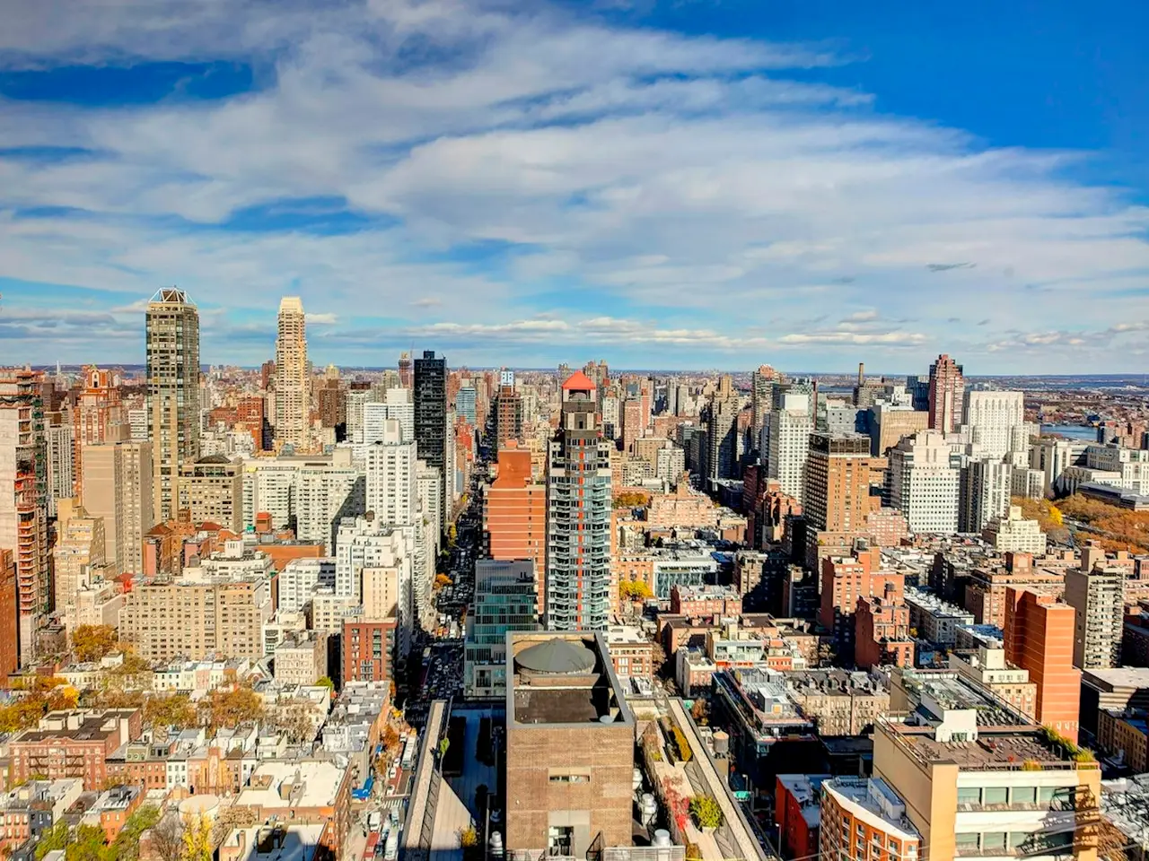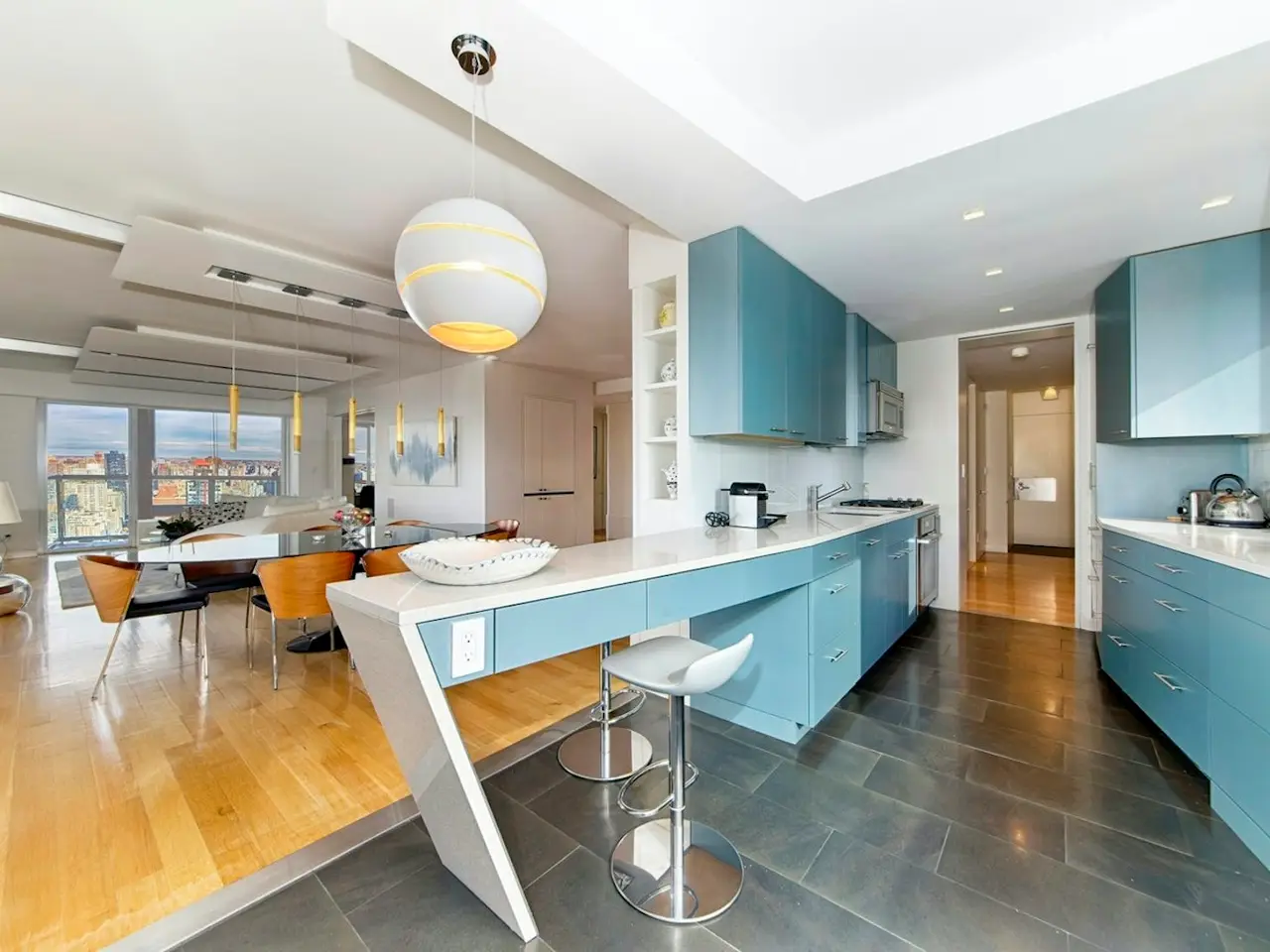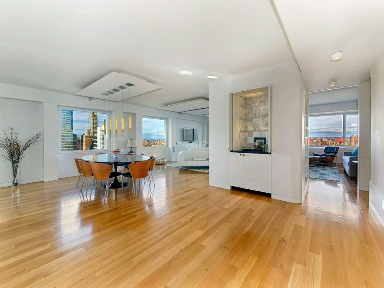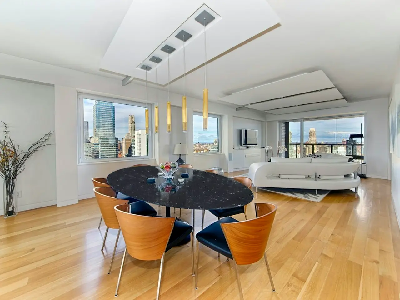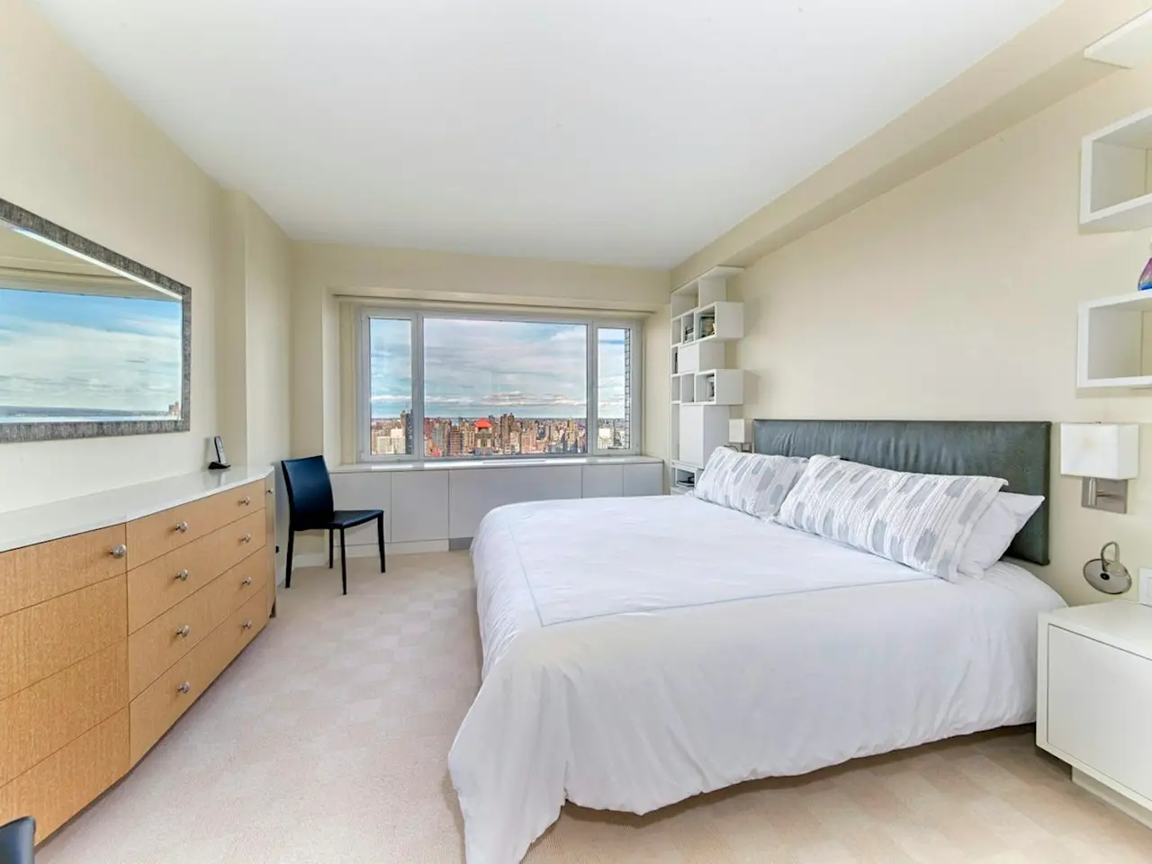 Perfection is the only way to describe this apartment! It is absolutely gorgeous and combines magnificent design with practical utility. It overlooks all of New York City from the 46th floor. One sees North past the George Washington Bridge, West over all of Central Park, East over the East River, Park and South toward the Chrysler Building and the Freedom Tower. The apartment was designed by a well known architect who created walls and woodwork to resemble the skyscrapers of New York City. When the lights are on, the glass within the wood portrays windows and one feels as if they are peering into the hidden life of the City. The beautiful plank floors and sparkling counter tops are a joy to observe. The apartment consists of a huge Living Room, Dining Room, Primary Bedroom and Den with sliding doors. When they are closed a large 2nd Bedroom is created. There are 2.5 gorgeous Bathrooms, a huge open Kitchen, a Washer/Dryer and new soundproof picture windows. The Central A/C is hidden within beautifully designed cabinets. The large Terrace faces Northeast and is quite usable. It is located on Billionaire''s Row, public transportation, wonderful shopping and luxury living. The building has 24 hour concierges and doormen. There is a 20,000 square foot Spa with classes, trainers and an indoor/outdoor salt water Pool and a 24 hour Garage. Pets and pied a terres are allowed.