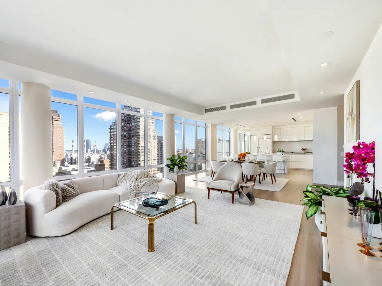 Introducing the magnificent 26th Floor Residence at The Charles Condominium, a soaring full-floor home of exceptional sophistication. Encompassing 3,595 square feet, this Upper East Side four-bedroom, four bathroom sanctuary with separate den offers tremendous volume of light and space, creating a rare and modern experience of a townhouse in the sky. From the private elevator landing, one enters a dramatic expanse where 10-foot ceilings and floor-to-ceiling glass frame open city views in every direction. Bathed in natural light from sunrise to sunset, the residence offers sweeping panoramas of Manhattan's skyline, a dynamic backdrop for both refined entertaining and serene daily living. The great room, stretching more 30-feet wide with almost 50-feet of glass windows, is a statement of scale and elegance, seamlessly merging living and dining areas into a loft-like configuration. A modern kitchen anchors the space with an expansive center island/breakfast bar, complemented by top-tier Miele and Sub-Zero appliances. Throughout the residence, high-end, bespoke millwork and finishes elevate each moment. The den, ideally located off the kitchen, is perfectly proportioned, offering flexibility as a media lounge, home office, or intimate library, extending the versatility of the home. The primary suite is a serene private retreat, capturing endless skyline vistas through walls of glass. The exquisite windowed spa bathroom, clad in Bianco Dolomiti marble, features dual vanities, a soaking tub, and a glass-enclosed stall shower. Storage is abundant, featuring a custom walk-in closet alongside a meticulously outfitted hallway suite to meet the most exacting standards. Three additional bedrooms, each with en suite marble baths and generous proportions, offer both privacy and elegance. Hardwood floors run throughout, enriched by radiant heat in select rooms and bathrooms and a dedicated laundry room with premium Electrolux appliances adds convenience. The Charles itself exemplifies boutique luxury, with white-glove services, a fully equipped fitness center, a playroom, and private storage for every residence. Perched high on the 26th floor with breathtaking, unobstructed city views, this full-floor residence at The Charles is a rarefied offering and an unparalleled combination of scale, design, and sophistication.
