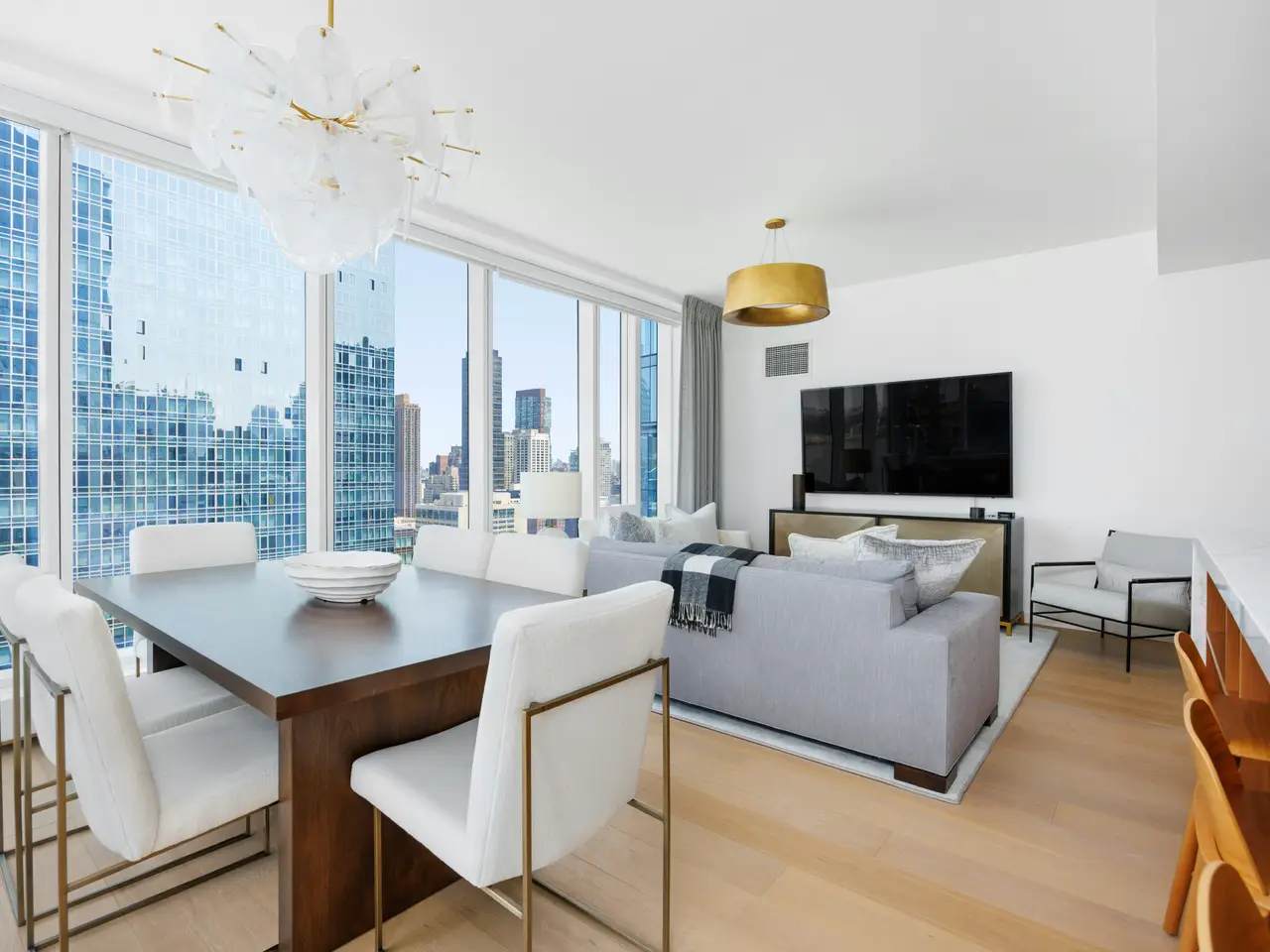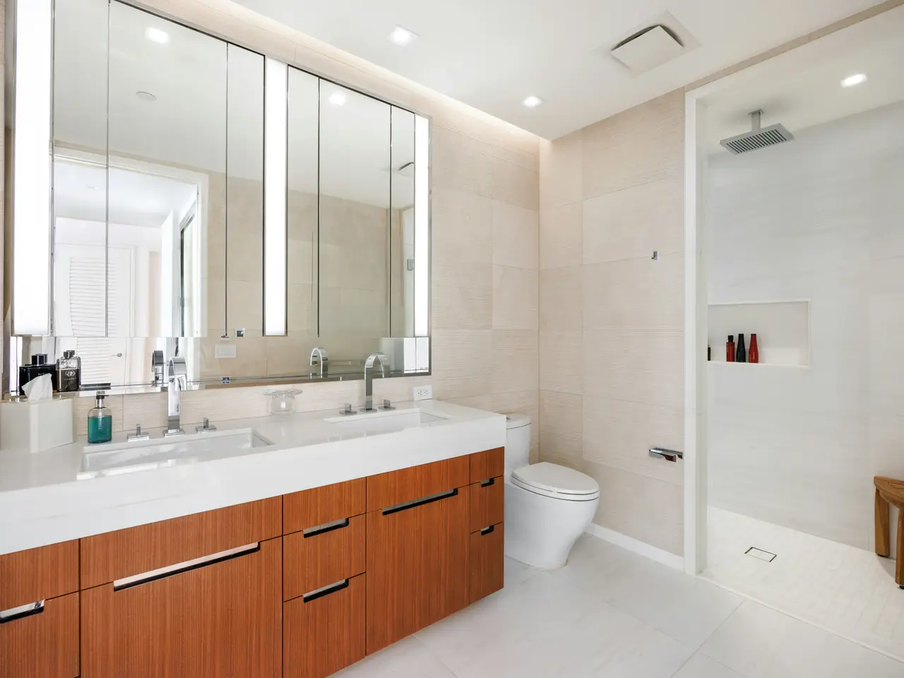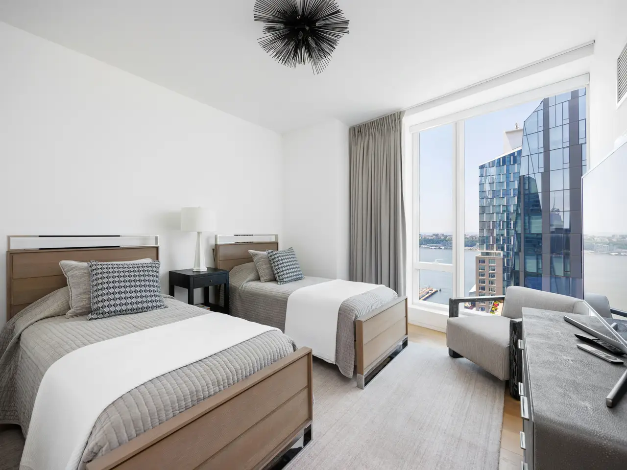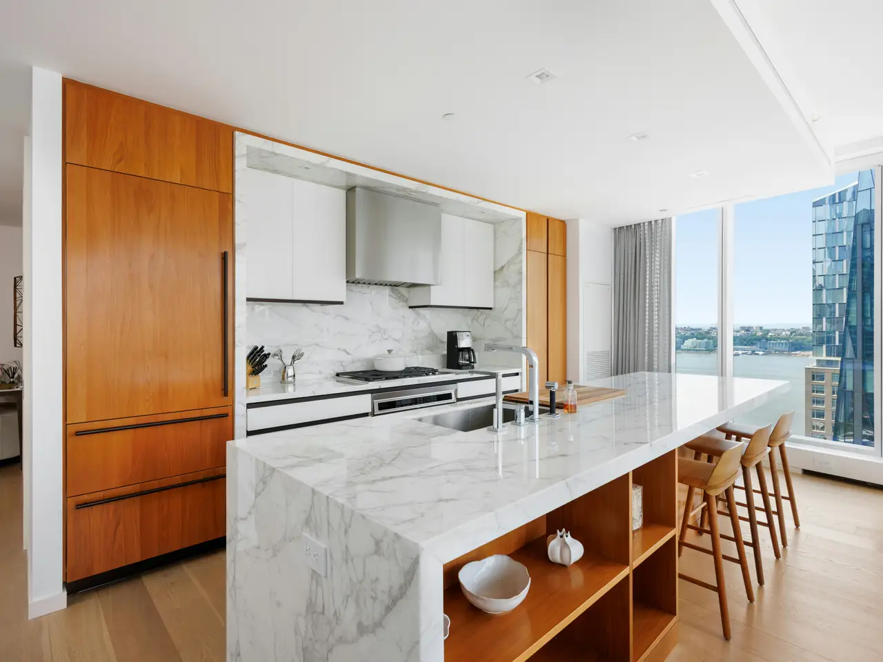 NEW Corner 2 Bedroom/2.5 Bath home with Panoramic Hudson River Views and a Full Suite of Amenities! Step into this impeccably designed and stunning home via an elegant walnut door into a generously sized entry foyer. Off the foyer is a jewel box powder room featuring a floating Calacatta Fabricotti custom stone vanity with a carved stone sink and luxurious Eramosa marble floors. Conveniently located off the powder room is a deep coat closet and an in-unit washer/dryer. The expansive corner living and dining area boast floor-to-ceiling windows, showcasing sweeping Hudson River and George Washington Bridge views and beautiful Northern and Western light. The open custom Scavolini chef's kitchen, designed by Jeffrey Beers, features abundant white oak finished walnut cabinets, Vagli Fine Vein marble countertops treated with tuffskin for extra protection, marble backsplash, soft-close drawers, a large sink with Dornbracht fixtures, built-in water filtration system, and top of the line appliances including a 5-burner Wolf gas range stove and oven, Sub-Zero refrigerator and freezer, Gaggenau wine fridge, Wolf microwave, and a Miele dishwasher. The luxurious primary bedroom suite offers River views and features a private entry foyer, a fully outfitted walk-in closet, a supplemental deep closet, and a gorgeous, spa-like en-suite bathroom. The 5-fixture primary bathroom is complete with Nuheat heated Bianco Dolomiti marble floors, brushed limestone walls, marble slab countertops, deep Zuma soaking tub, recessed medicine cabinets with LED lighting, glass-enclosed rain shower, and Dornbracht fixtures. The adjacent second bedroom is equally luxurious, featuring a double closet and an en-suite bathroom clad in Opal white marble floors and walls. It also boasts a floating custom-stained oak vanity with a Lacava countertop, a glass-enclosed tub/shower with a full seamless shower door, and Dornbracht fixtures throughout. Other features of this exceptional home include white oak wide-plank floors that flow seamlessly throughout, central air conditioning, and custom automatic shades, including blackout shades in the living room and primary bedroom suite. One West End is a striking 42-story glass condominium tower crafted by the renowned architectural firm Pelli Clarke Pelli. This exceptional residence offers an unparalleled suite of resort like amenities, including a 24-hour doormen, concierge services, a 75-foot swimming pool, a state-of-the-art fitness center and spa, and a sprawling 12,000-square-foot terrace complete with cabanas, lush landscaping, grilling stations, and private outdoor entertaining areas. Residents also enjoy a grand living room, media and game rooms, a billiards lounge, and a children's playroom that opens onto a private garden terrace, and dining room with a fully equipped chef's kitchen. 1 WEA currently benefits from a 20-year 421-a real estate tax exemption expiring 2038/39. Custom designed by renowned Martha O'Hara Interiors, this home is being offered fully furnished.