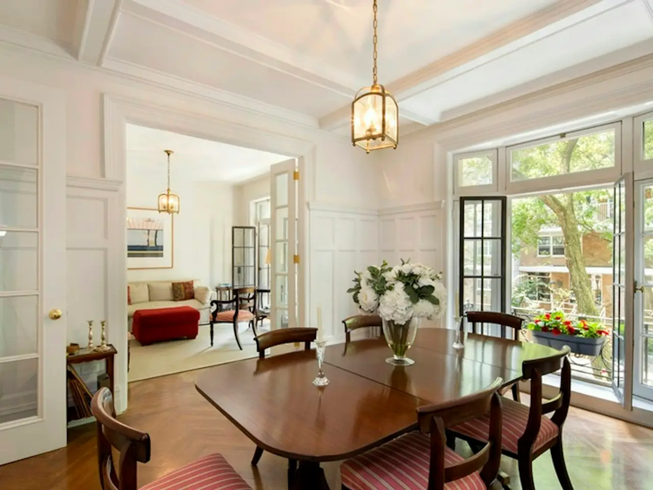Classic French doors separating living and dining rooms