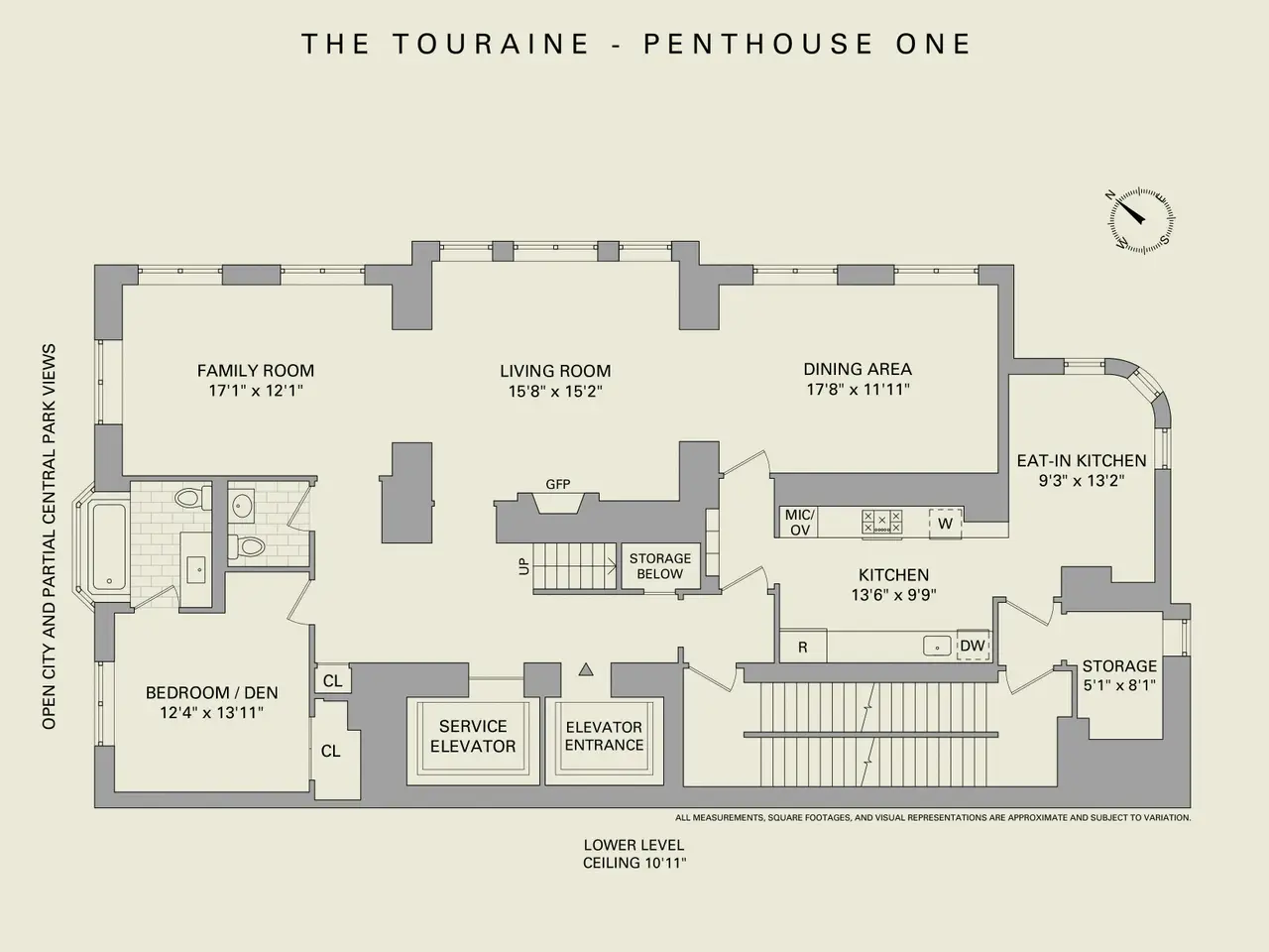 A breathtaking duplex that unfolds magnificently over a 4,346 square foot configuration, The Penthouse at The Touraine has been designed for the finest in both living and entertaining. Set atop a prominently located boutique Upper East Side condominium, this is a stunning, mint condition, one-of-a-kind home. Featuring 50 linear feet across the den, living, and dining rooms, coupled with a ceiling height of nearly 11 feet, the main floor enjoys stunning views to the north, east, as well as west toward Central Park. A gourmet kitchen features honed Italian Calacatta marble, several Gaggenau appliances, and a beautiful windowed eat-in, breakfast area. The refrigerator and wine fridge are by Subzero. The main floor also boasts a den, which can serve as a guest room, complete with an ensuite windowed bathroom, and a fantastic powder room. On the upper floor, a sun-soaked primary bedroom occupies the prime corner and includes one of the most attractive and thoughtful, custom walk-in closets imaginable, naturally with a window of its own. A luxurious and windowed primary bathroom is outfitted with Waterworks fixtures, Italian Calacatta and Arctic gray marble, and a freestanding soaking tub, as well as a ribbed-glass enclosed shower and separate enclosed Toto toilet. Additional closets and storage were added throughout this suite. The windows face north and west towards Central Park and the Central Park West skyline. Two of the three additional bedrooms, each with an ensuite marble and Waterworks bathroom, face north, while the fourth bedroom nestles at the opposite corner and benefits from north and east exposure. The upper floor is further accented by the 11-foot ceilings. The Penthouse has its own private roof deck with stunning views of Manhattan, a private wine locker for over 100 bottles in the wine cellar, and an oversized private storage unit. This magnificent home is prewired for a smart home system of your choosing with full audio-visual control, including the in-wall speakers, electric shades, lighting, and full command of the multizone HVAC. There is also a Lutron system to independently control the lighting and shades. The floors are 5" plank ash wood, the windows are oversized, there is a spacious laundry room with washer/dryer, and there is a convenient storage room just off the kitchen. The Touraine features the amenities and luxury of a new development while maintaining a discreet, boutique feel. A gorgeous marble lobby, staffed by 24-hour concierge, and a residents library are stylized and sophisticated. Owners avail themselves of a beautiful barrel-vaulted wine cellar with fireplace, a well-equipped and conceptualized fitness center, plus a landscaped roof-top terrace. The Penthouse at the Touraine is a property that must land on the short list for the serious buyer.