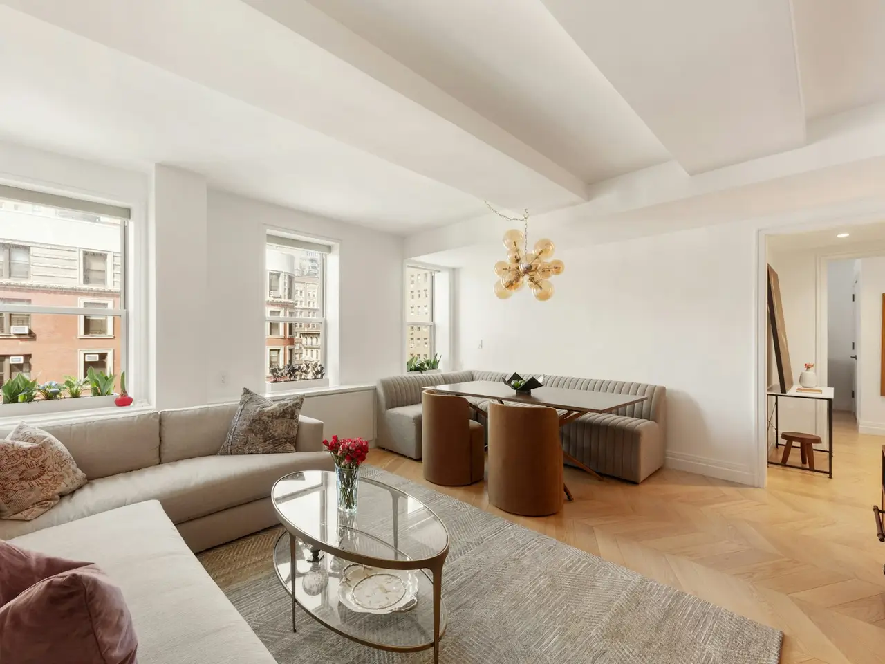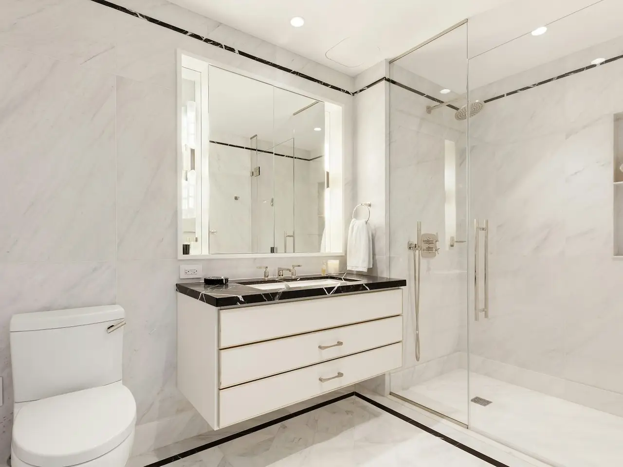Welcome to Residence 9B at 393 West End Avenue showcasing a triple-mint one-bedroom, one-and-a-half-bathroom home offering 866 sq ft of refined prewar elegance and alluring modern conveniences. Soaked in natural light from its northern exposure, this residence features a spacious living and dining area and a serene king-size bedroom with a windowed, spa-like en-suite bath. Interior highlights include white oak chevron floors, restored tray ceilings, and bespoke millwork that pay tribute to the building's original 1920s character. The chef's kitchen is outfitted with Naica Quartzite countertops, American walnut cabinetry with fluted glass accents, and a full Miele appliance suite, impeccably curated by renowned designer Nancy Ruddy. The primary bathroom is finished in honed Pacific White Marble with Calacatta Black marble countertops, a glass-enclosed walk-in shower, and radiant heated floors. The powder room makes a distinct statement with Breccia Capraia marble walls and custom bronze details. Smart home features include LG multi-zone climate control with Nest thermostats, energy-efficient lighting, and an in-unit Miele or Whirlpool washer and heat-pump dryer. Located at the corner of 79th Street and West End Avenue, 393 is a full-service building within a landmarked district. Reimagined by CetraRuddy, the property combines 1920s architecture with contemporary comfort. Amenities include a Great Room with private seating areas, a Club Room for dining, a fitness center with movement studio, a Cottage Playroom with porch and garden, a lounge with gaming station, and a beautifully landscaped secret garden with southern light.