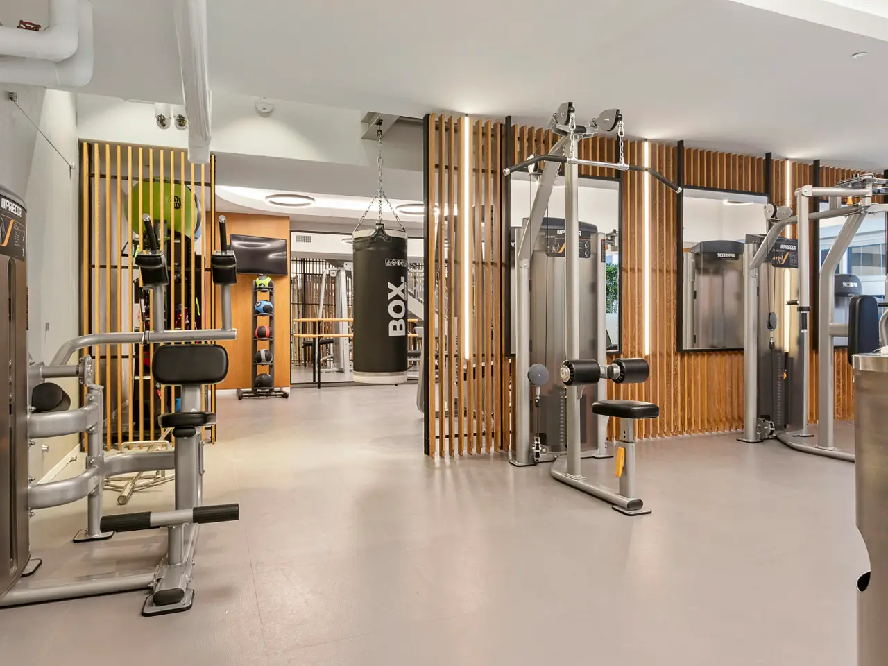 Well-equipped fitness center with sauna