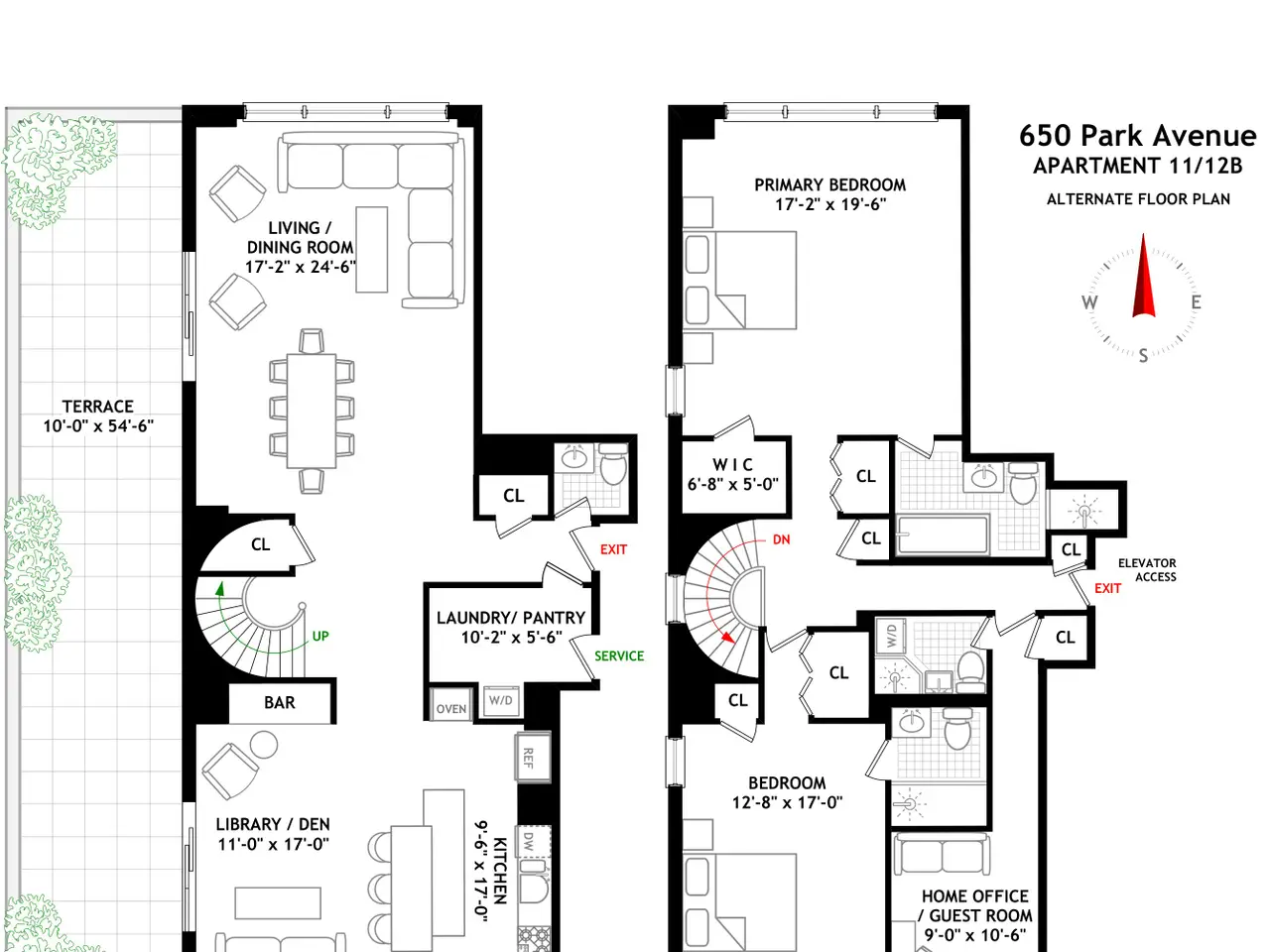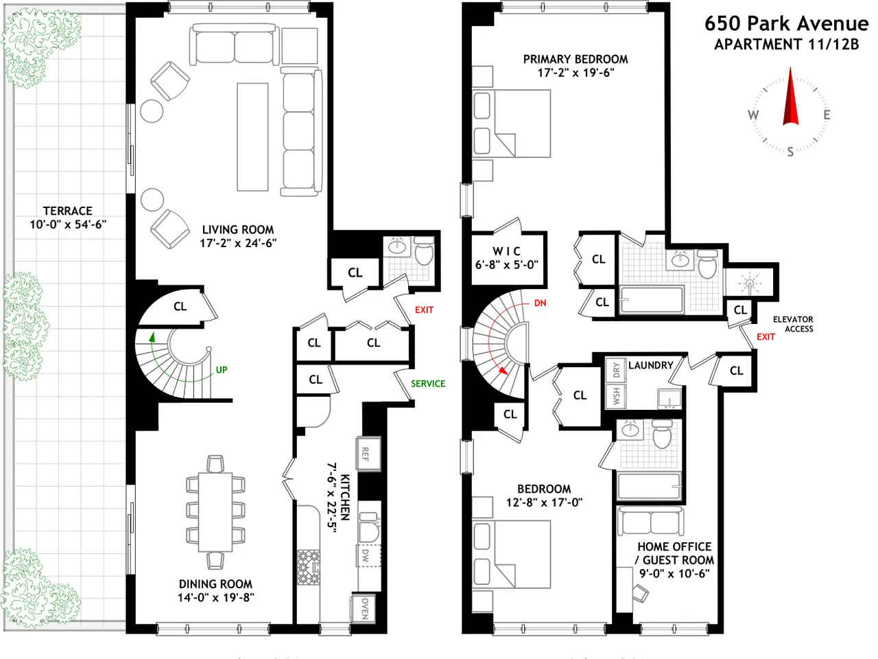 Sprawling Park Avenue Duplex with Private Terrace & Iconic Skyline Views Welcome to Apartment 11/12B, an impeccably maintained, one-of-a-kind terraced duplex at 650 Park Avenue. This expansive 2-bedroom apartment plus home office or guest room, spans approximately 2,500 square feet and features breathtaking northern and southern skyline views. The pièce de résistance is a 550 square foot irrigated terrace- ideal for indoor-outdoor living and effortless entertaining. The open-concept first floor is designed to impress. Upon entry, you are greeted by a generous foyer with multiple closets and a chic powder room. The living and dining areas, both with direct terrace access, are anchored by a stunning windowed, double-height curved staircase. The windowed kitchen is both stylish and functional. Upstairs, two spacious bedrooms with en suite bathrooms each including a soaking tub, provide serene retreats basking in natural sunlight. The home office easily doubles as a guest space and the en suite laundry room can be readily reconfigured into a full bathroom as originally built. Ample closet space throughout ensures practicality matches the home's beauty. Both floors are elevator accessible. Ideally located on the Southwest corner of 67th Street and Park Avenue, 650 Park Avenue is within a stones throw from Central Park and the best restaurants, museums and shopping that New York City has to offer. The epitome of a full-service building, the best-in-class amenities include a fabulous gardened roof deck with magnificent views, full-time doorman and concierge, live-in resident manager, parking garage (discounted shareholder rate), renovated gym, laundry room and the use of a storage bin. Buyer is responsible for the 2% flip tax and the building allows up to 50% financing. Pets and pied-a-terres are permitted with board approval. Please note there is a capital assessment of $939.40/month and maintenance includes all utilities. This home offers a blend of classic elegance, modern functionality and elevated lifestyle in a high-touch, amenity-rich building on one of the city's most prestigious avenues. Move right in and enjoy the best of indoor luxury and outdoor splendor in one extraordinary home.