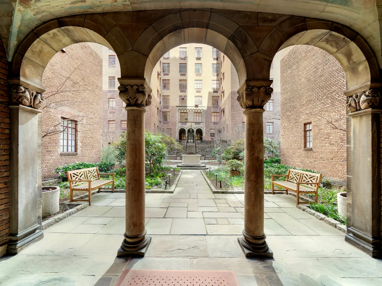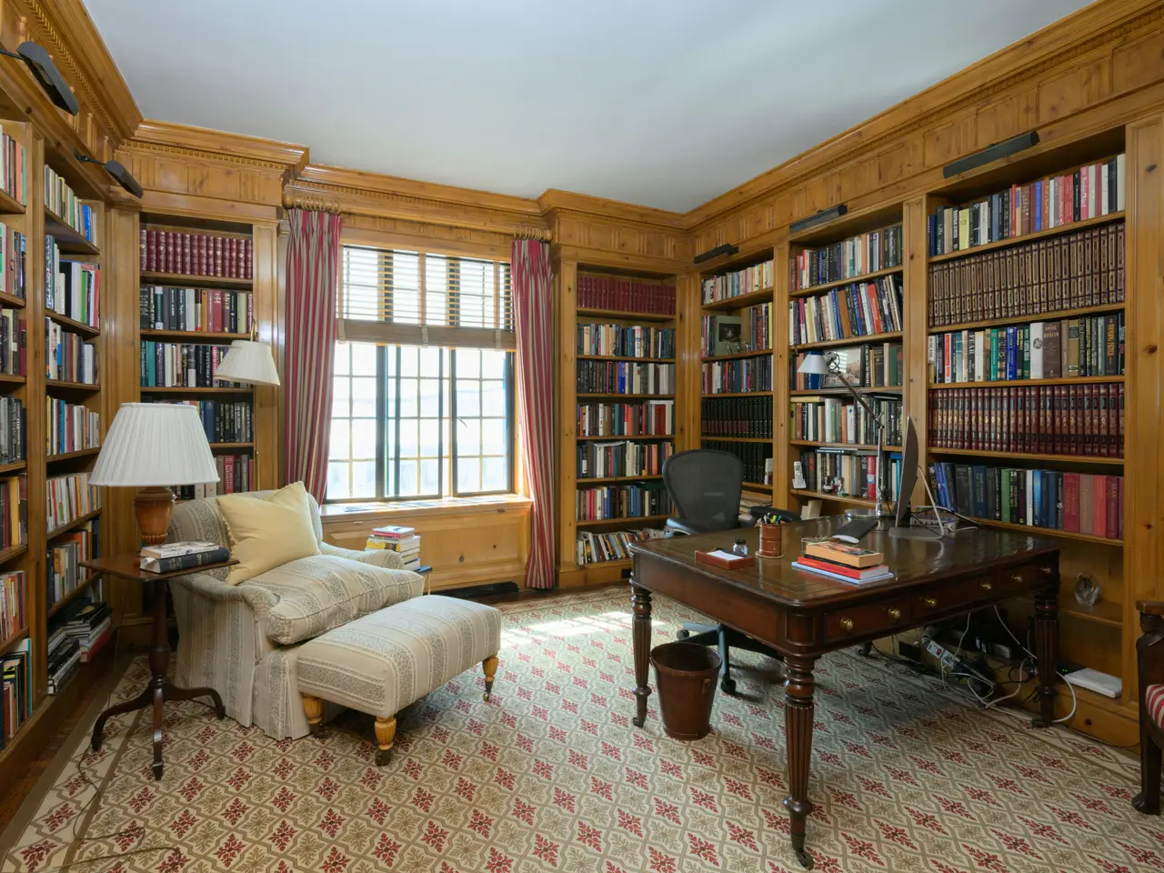 Newly renovated, glamorous duplex at Millan House. A foyer with a sweeping curved staircase provides the point of arrival for this elegant apartment. A step-down living room is entered through an archway, and has a wood burning fireplace, ten foot ceilings, and original casement windows, with sunny southern exposure over the roof of the landmarked Park Avenue Armory. A gorgeously pine-paneled library is adjoining, an ideal spot for cozy evenings or intimate gatherings. There is a huge cloak and powder room with a mahogany and marble vanity. A large and gracious formal dining room with parquet de Versailles floors and china closet faces north to Millan House's famed garden. All of the doors are figured mahogany with custom brass hardware. Beyond the dining room is a pantry with marble counters, ample storage, an under counter subzero wine fridge, two SubZero refrigerator drawers, and a sink and a bar. The pantry leads to a gourmet eat-in kitchen with a SubZero refrigerator, Miele dishwasher and brand new six-burner Bertazzoni vented chef's range. In the rear of the apartment is a full bath, a large and private guest bedroom and a wonderful laundry room with tons of storage. Ascending the staircase one arrives on the upstairs floor, also accessed by the passenger elevator. A large primary bedroom suite has a south-facing bedroom with lovely views over the Armory and the midtown skyline. The middle bedroom has been artfully transformed into a jaw-dropping dressing room with elegant mahogany built ins worthy of Saville Row. Beyond is a bathroom that transports one to the most elegant of London hotels, with a free-standing soaking tub, a large limestone shower with rainfall head, a separate water closet, a marble and mahogany vanity, and custom mahogany moldings and millwork throughout. A hallway leads to a very private and spacious guest suite, with a custom marble bathroom, eastern exposure over the garden, and ample closet space. The apartment is fully centrally air conditioned. Built by John D. Rockefeller in 1931, Millan House consists of two separate buildings connected by a two-level Italianate interior private garden courtyard, with a wonderful fountain and seating areas. Designed by architect Andrew J. Thomas with 57 apartments, the buildings have Romanesque details such as carved animal capitals and arched loggias. Pied-a-terres and pets are welcome. 3% flip tax by purchaser. Special assessment for Local Law 11 through 7/25 of $1897 a month.