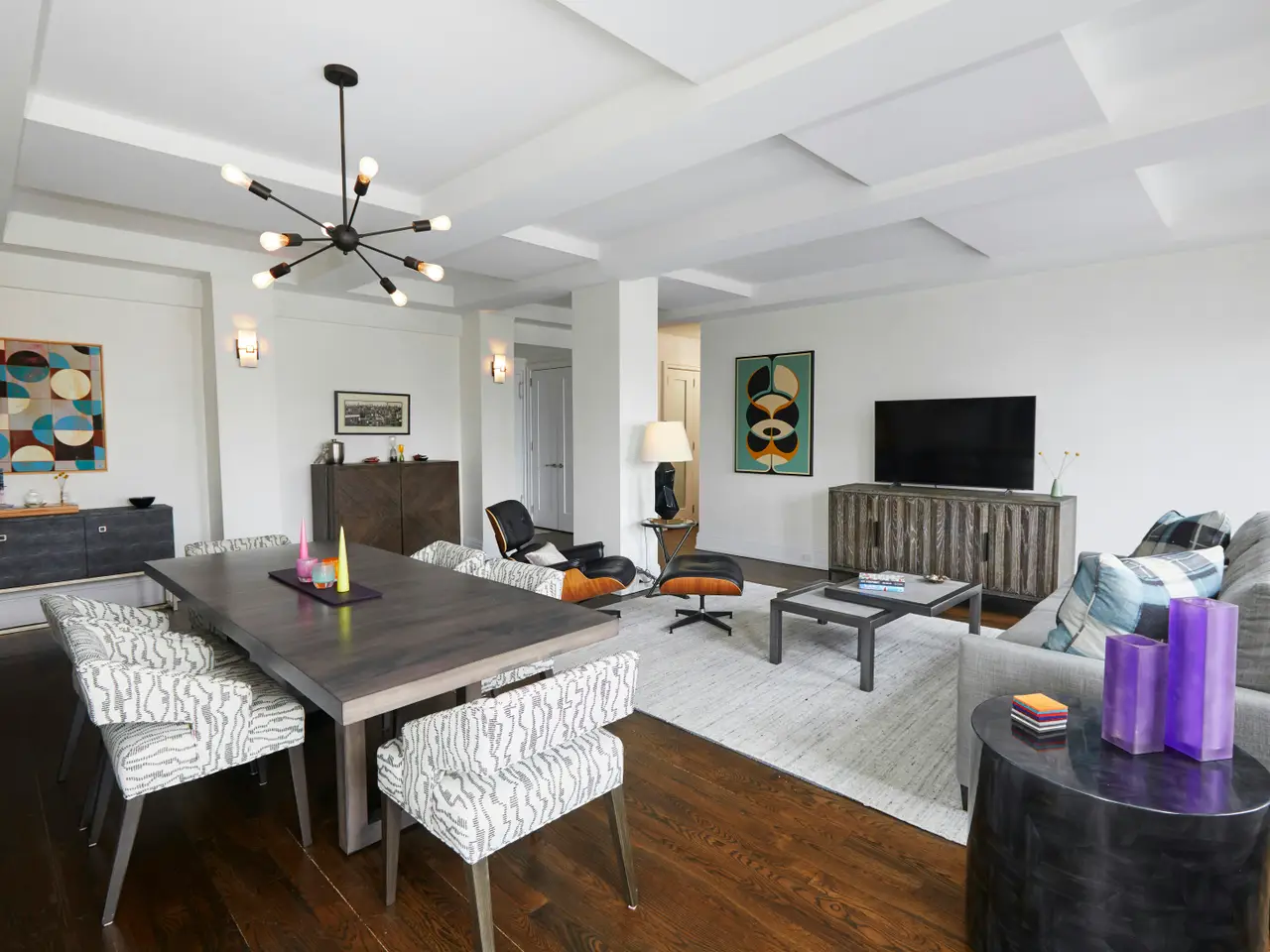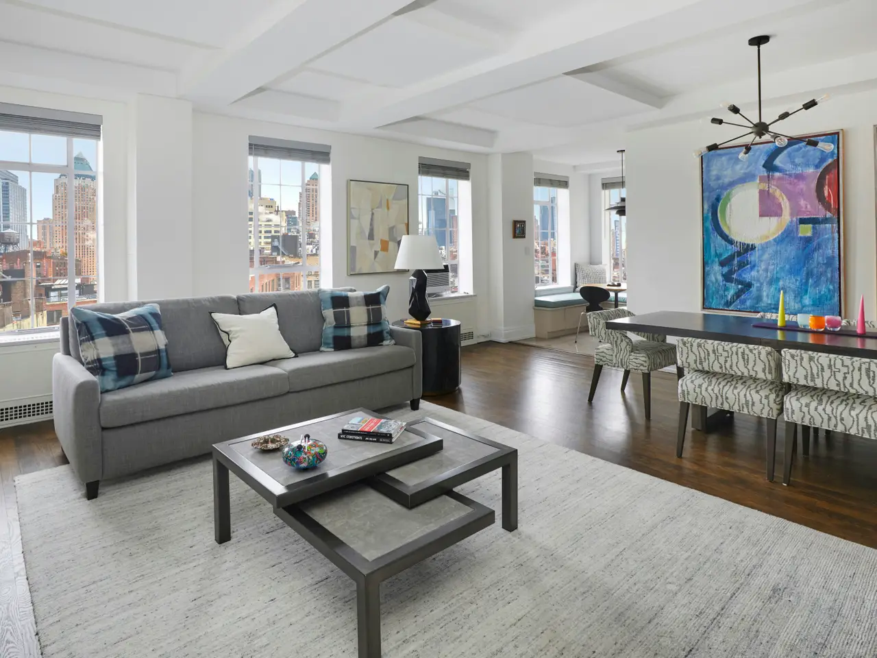 SUNNY PREWAR GEM Located in the prestigious Parc Vendome, this spacious residence offers approximately 1,645 square feet of elegant living space with open skyline views. THE APARTMENT - A grand, 19' x' 23' Great Room with open south and east exposures looking over the Clinton/Hell's Kitchen and Hudson Yards neighborhoods. - Tremendous sunlight from 11 elegant casement windows throughout. - Gorgeous hardwood floors and high beamed ceilings. -Gourmet kitchen with marble countertops, limestone floors, Subzero refrigeration, Viking gas range, Wolf warming drawer, and Miele dishwasher. - Over 235 square feet of storage between two primary bedroom closets, 2nd bedroom closet, a deep pantry with wine fridge and foyer storage with enough room to accommodate bikes, luggage and strollers. - Wonderful winged bedroom layout for privacy - Gracious primary suite featuring a windowed master bath with radiant heated marble floors, oversized shower, and double-sink vanity. - Split second bedroom with alcove study area and adjacent second bath. - Home office area with a 9' long built in desk and extensive file and book storage - In-Unit Stacked Miele washer dryer and adjacent linen closet. THE BUILDING - Built in 1931, the Park Vendome is a luxury complex of four buildings with separate entrances. - Full-time doorman and live-in Resident Manager. - Access to beautifully maintained formal gardens with a fountain. - Seasonal rooftop sun decks with breathtaking views. - Amenities include a Billiards Room, Music Room, Library, Card/Game Room, rentable banquet room, dining room, and kitchen for events - 24-hour laundry, storage bins, and bicycle storage available for a fee (pending availability). THE NEIGHBORHOOD - Moments from Columbus Circle, Whole Foods, Equinox, and the Jazz Center at Time Warner. - Close to the renowned dining and nightlife of Hell's Kitchen and the Upper West Side. - Near cultural landmarks such as Carnegie Hall and Broadway theaters.