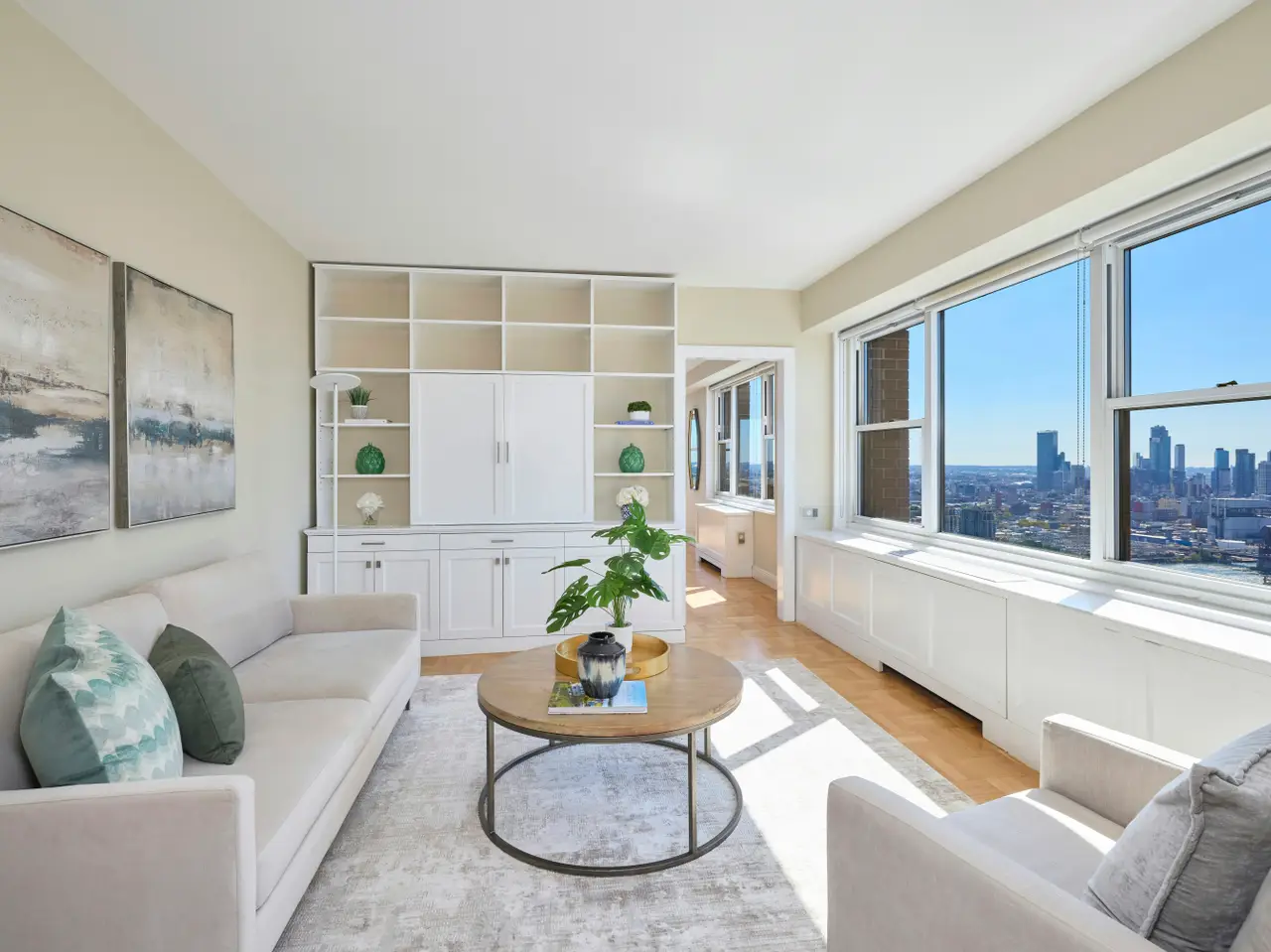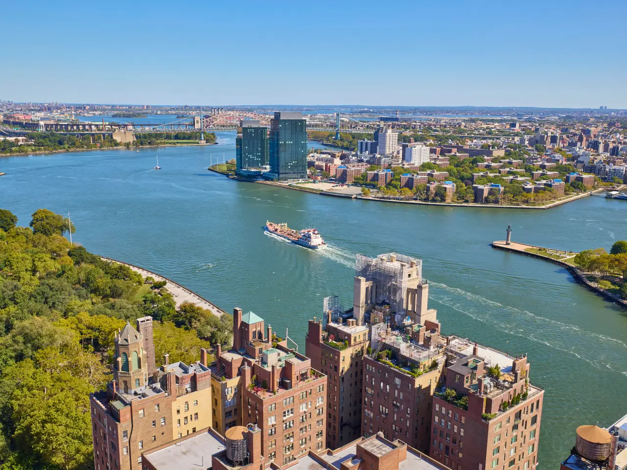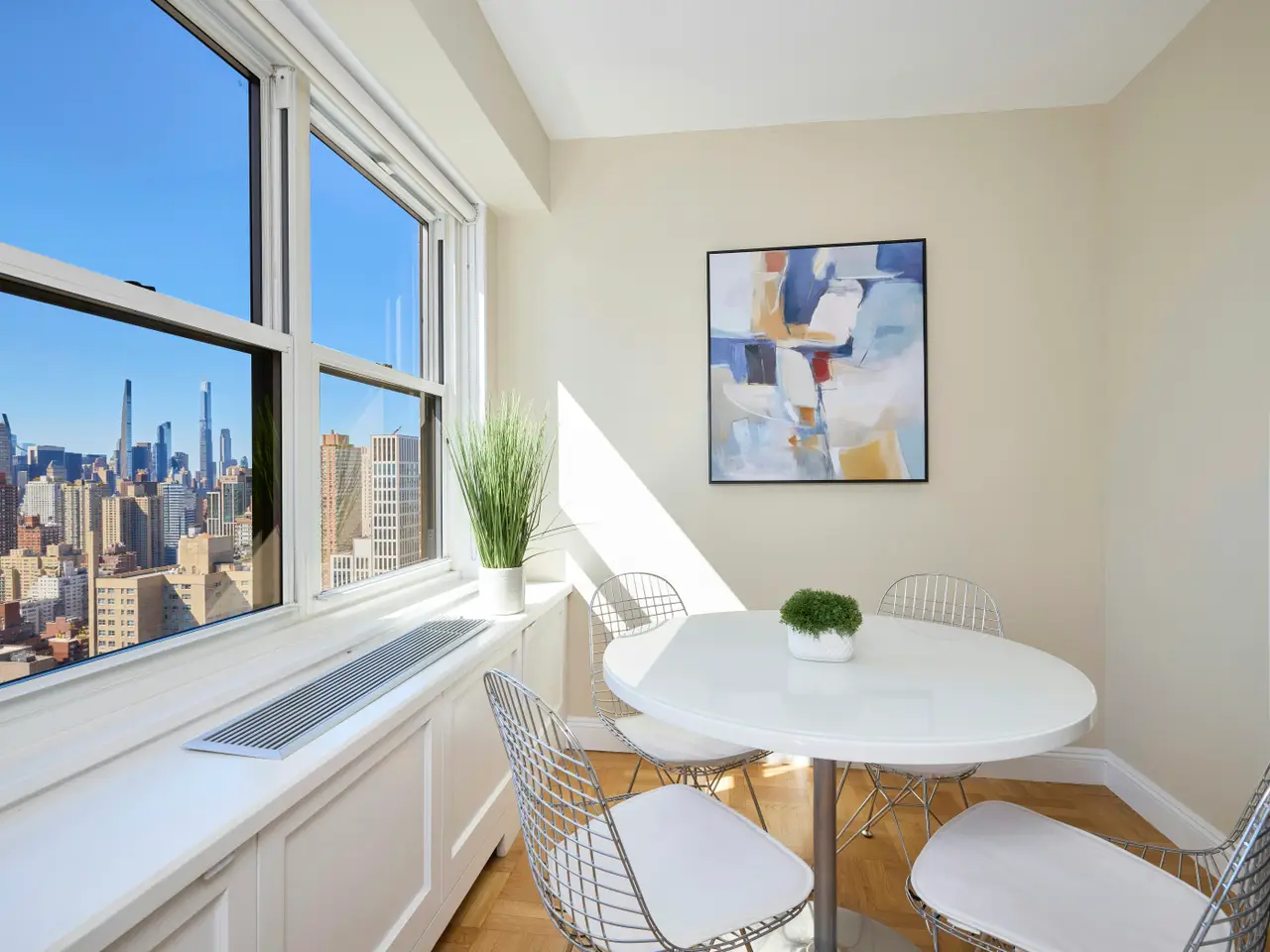 Prepared to be wowed! Perched on the forty-first floor, this two bedroom two and a half bathroom home has sweeping River and City views. The oversized living room and den/dining room provide ample space for entertaining as well as quiet enjoyment. A separate spacious breakfast room facing south adjoins a renovated cook's kitchen with top of the line appliances. Both bedrooms enjoy river views. The primary bedroom has a an en-suite bath and several large closets. There is a generously sized second bedroom and bath. Additionally, there is a powder room and washer/dryer. Sixty East End is a full service building with a gym, storage and a garage with low rates for tenant/shareholders. There is a newly renovated lobby and gracious circular driveway for easy access and only three apartments per floor. The building is located across from the East River Promenade, near Carl Schurz Park and close to many modes of public transportation.
