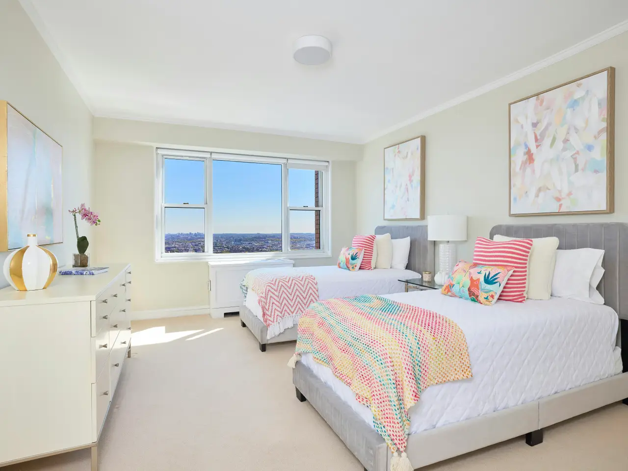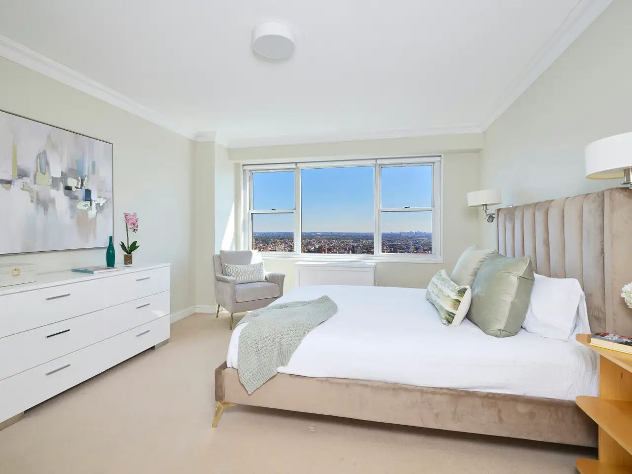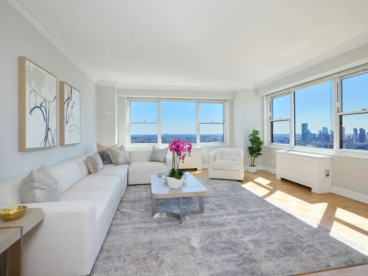 Prepared to be wowed! Perched on the forty-first floor, this two bedroom two and a half bathroom home has sweeping River and City views. The oversized living room and den/dining room provide ample space for entertaining as well as quiet enjoyment. A separate spacious breakfast room facing south adjoins a renovated cook's kitchen with top of the line appliances. Both bedrooms enjoy river views. The primary bedroom has a an en-suite bath and several large closets. There is a generously sized second bedroom and bath. Additionally, there is a powder room and washer/dryer. Sixty East End is a full service building with a gym, storage and a garage with low rates for tenant/shareholders. There is a newly renovated lobby and gracious circular driveway for easy access and only three apartments per floor. The building is located across from the East River Promenade, near Carl Schurz Park and close to many modes of public transportation.