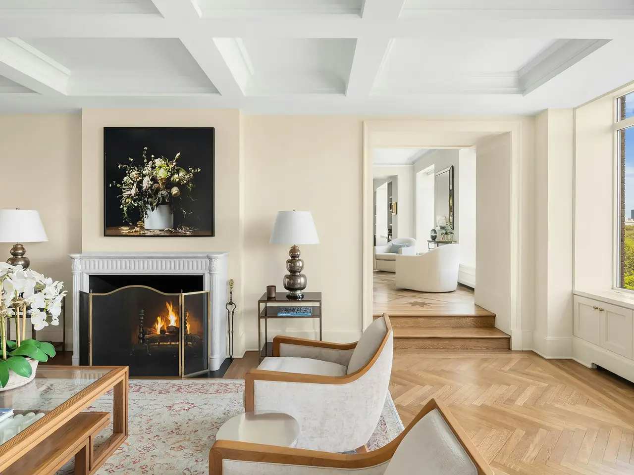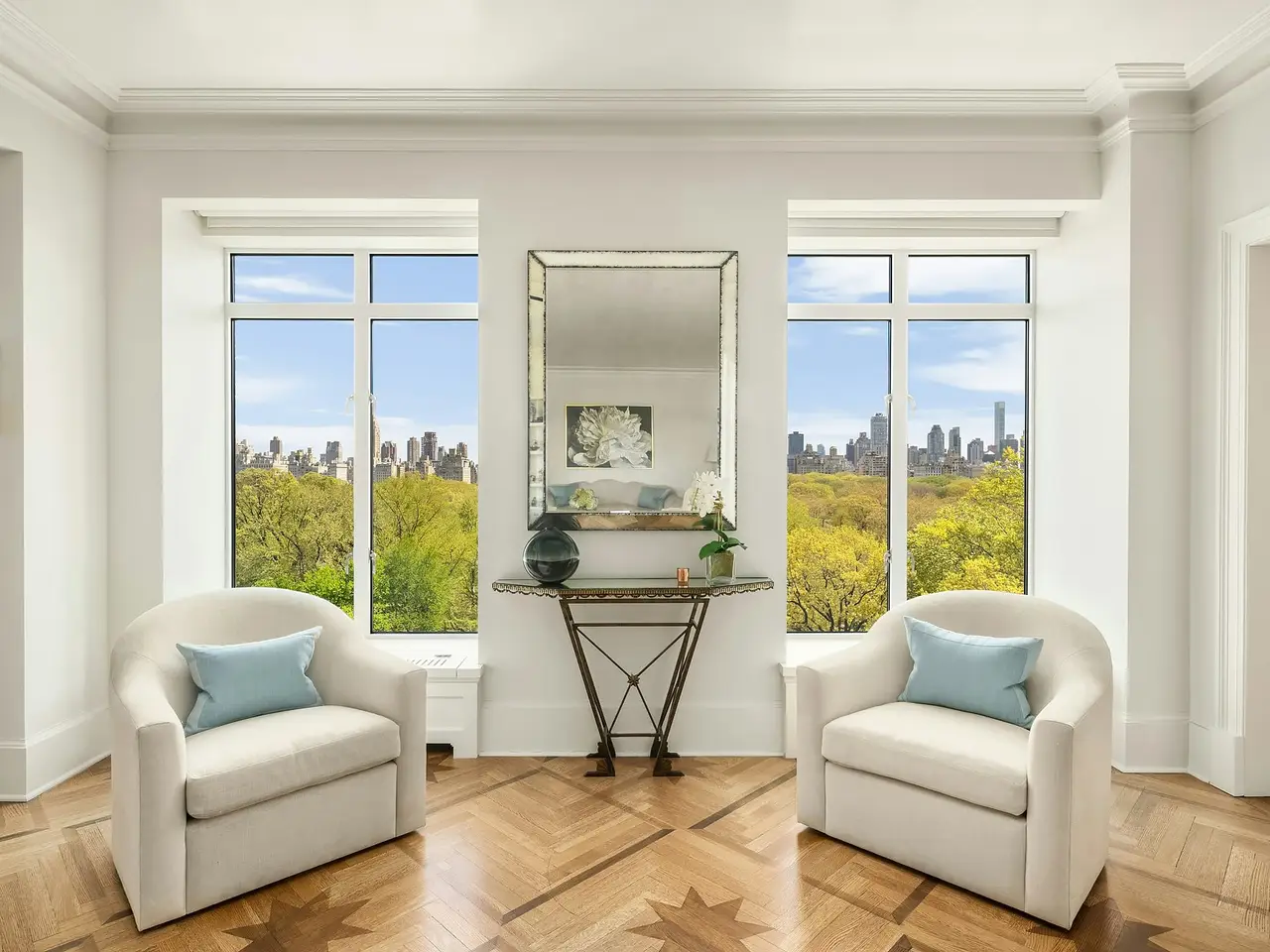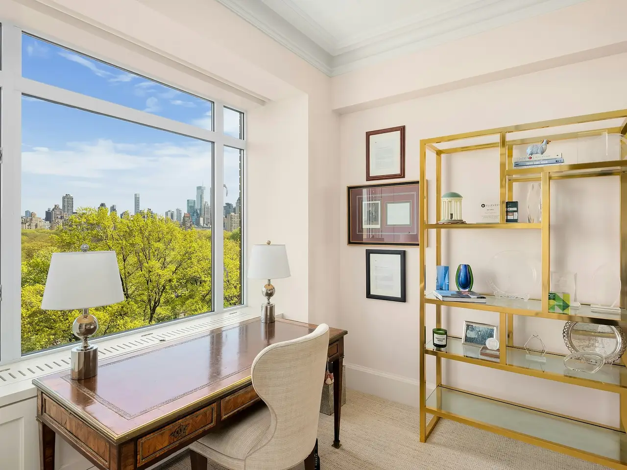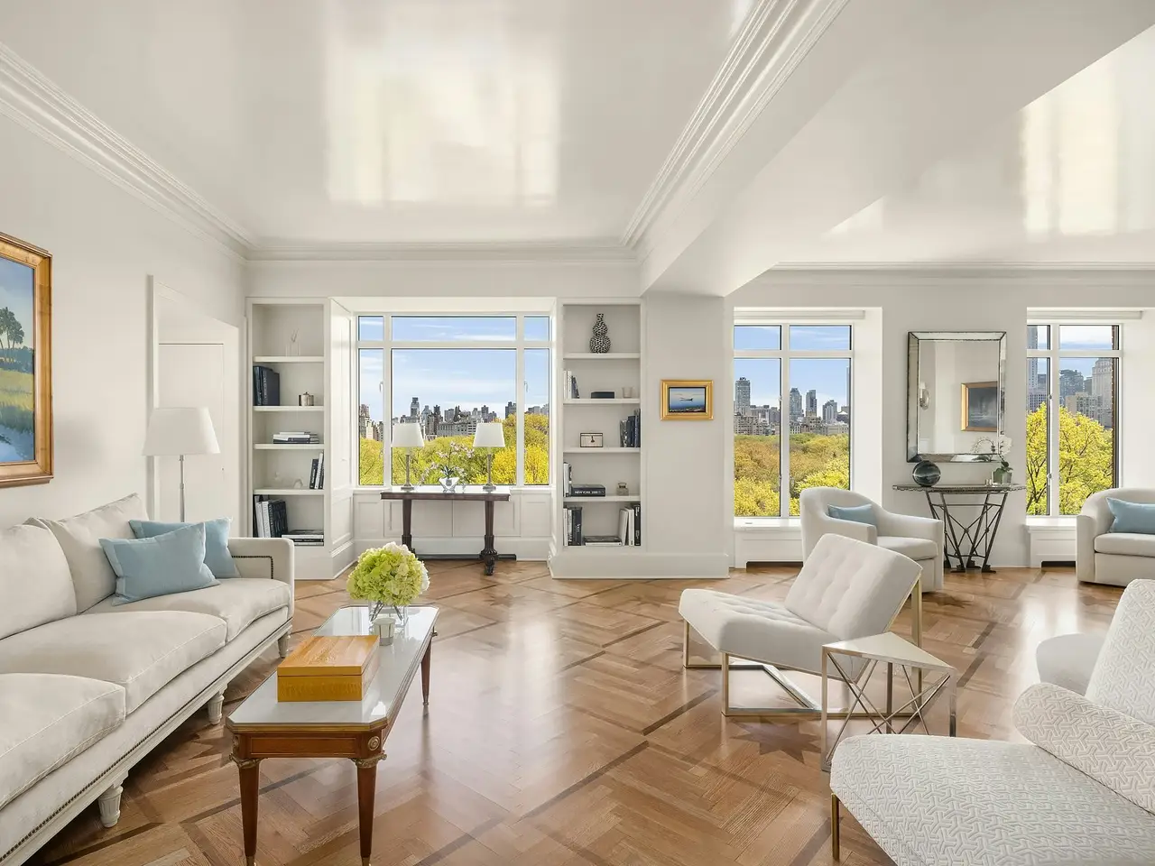 Triple Mint 5 Bedrooms Overlooking Central Park A once-in-a-lifetime opportunity awaits! Now offered: a 6000 SF rare combination of two Central Park-facing apartments, meticulously renovated with 100 running feet of windowed exposure on Central Park in The Majestic, one of the most desirable Central Park West co-ops. Originally 15, now 14 rooms, this townhouse-sized above-the-trees dreamy home has unmatched entertaining space balanced with 5 bedrooms (4 en suite) creating the perfect space for serene private living. Featuring breathtaking, unobscured views of Central Park, the City skyline and open exposures east and north and a south-side angle, this spectacularly renovated space has walls of monumental picture windows-rare among CPW cooperatives-flooding the interiors with dazzling natural light all day long. Perfect for entertaining, Thanksgiving Day parade viewing, fireworks and simply enjoying the changing seasons in Central Park, 9EF is without equal. There is truly nothing else like it on the market-a rare combination of scale, pre-war pedigree and move-in ready condition, saving you the cost, time and psychic energy of a renovation. Public Rooms - Unmatched Entertaining Space Park-facing double living room with wood-burning fireplace Park-facing library with coffered ceilings and wood-burning fireplace Park-facing study-a serene retreat for work or relaxation Formal square dining room with east-facing exposures and bespoke built-ins Plush media room with surround sound Full bar with liquor storage and refrigerator/freezer drawers Bedroom Suites Two spectacular primary suites, each with direct Central Park views: Corner "Solarium" Primary Suite: Flooded with light, featuring a glass-corner solarium, extensive built-ins, cedar-lined closets, walk-in closet, and luxurious en suite bathroom with cast-iron soaking tub and separate stall shower Second Primary Suite: A quiet haven with a park-facing picture window, Bain Ultra tub overlooking Central Park, a Jacuzzi Clearlight Sanctuary 2 sauna, and radiant-heated floors Additional Bedrooms Two additional bedrooms, each with en suite baths (one with steam shower), walk-in closets, and custom cabinetry A fifth flexible bedroom or study with en suite bath and tailored storage Chef's Kitchen - A Culinary Masterpiece Spanning three rooms, the chef's kitchen was designed to delight culinary enthusiasts: Gourmet kitchen with two Sub-Zero refrigerators, three Bosch dishwashers, Wolf 6-burner vented gas range with grill and dual ovens, Blue Star French door electric oven, Wolf warming drawer & microwave, plus a dedicated baking station Breakfast area with coffee bar and refrigerator/freezer drawers Bread drawers Walk-in pantry Built-in wine bar with 60-bottle Sub-Zero wine fridge Exceptional Details & Amenities Powder room, washer/dryer Extensive automation and audio-visual systems All closets cedar-lined with built-in outlets Central air conditioning with four-zone humidifiers All-new double-insulated windows & cast-iron radiators Extensive millwork, custom moldings, and hidden storage The Majestic 24/7 doormen and concierge Newly renovated gym with state-of-the-art equipment Rooftop solarium with all-weather teak furniture and dining table Remote work space Newly renovated children's playroom On-site Managing Agent & Live-in Resident Manager Attended elevators Mail delivered to the door Cold storage available Storage rooms (monthly fee) and bike room Laundry room with commercial-size machines Co-Exclusive