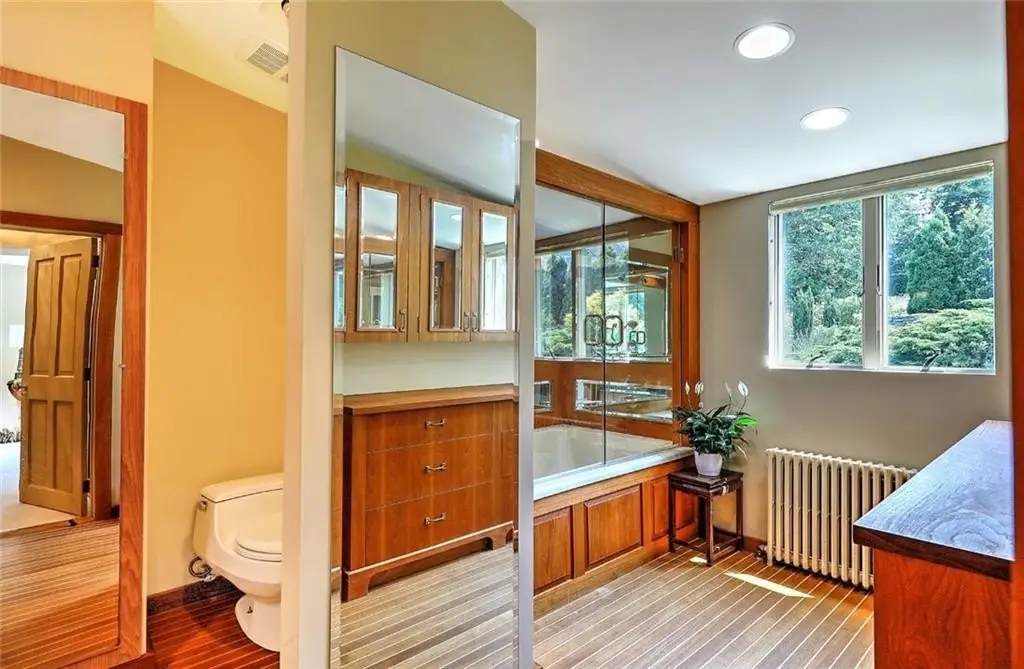 Teak and holly flooring in primary bathroom