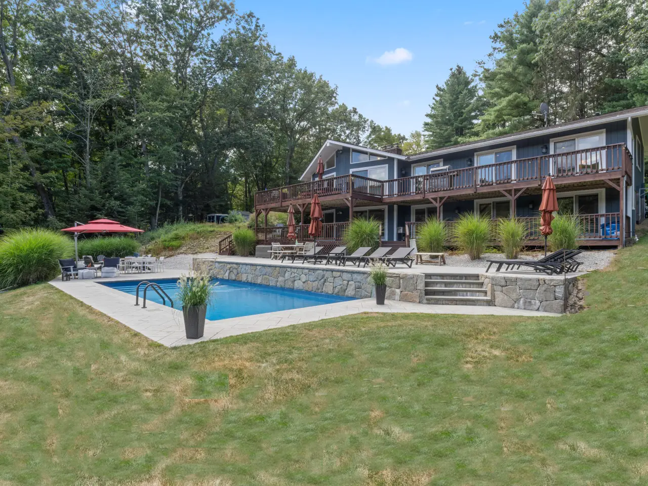 Live your Best Life at the Lake & make very day a count! Talk about multiple rooms with views from all vantage points. Experience lakeside at this beautiful contemporary ranch privately set on 2+ level acres boasting captivating views & lake frontage on Lake Lillinonah. A rare opportunity to own a direct waterfront retreat, this property features its own private 400 sqft dock-perfect for fishing/boating/jet skiing/kayaking or simply soaking in the sunshine & surrounding natural beauty. Whether making this a permanent residence or city escape, every day will feel like a vacation! The inviting main level boasts a sun filled Vaulted Great Room/frplc with walls of multiple sliders allowing natural light to cascade throughout bringing the outdoors in & opens to a mahogany deck for captivating sky, pool & lake views. The home is an entertainers dream with an easy open flr plan-the Great Rm flows into the dining area & white bright kitchen. The home lives like a 5 Bdrm with 3 Bdrms/2 trendy baths on the main level where the Primary Bdrm suite is located. The walk-out lower level showcases phenomenal additional living space consisting of 4 flexible rooms encompassing the Rec/Billiard/Media Rm & lounge area plus 2 additional rooms currently serve as Bdrms w 3rd full bath. Each living room on this level has its own sliders & views leading to an expansive 2nd mahogany deck. A private Den can also be the perfect home office. The possibilities are endless whether hosting guests or in-laws. The multi-level decks and their panoramic views is what will captivate you. As you step outside, you will feel transported to resort-like living as you appreciate this backyard oasis-enjoy the newly built heated salt water inground pool (2021) surrounded by expansive multi-level patios, stone walls & inviting fire-pit. Elevate your outdoor dining and lounging experience whether on deck, at the patio or poolside. An enormous front yard offers additional playing and lounging areas with an offside area for multiple parking. Whether you're searching for a year-round residence or the ultimate weekend get-away, this home offers the perfect blend of privacy, comfort & resort-style amenities to enhance one's best life in a highly coveted lakefront community nestled amongst other fine waterfront homes all within Newtown yet minutes to Brookfield center and neighboring Bridgewater. Enjoy Newtown's Main Street including the Rec Center at Fairfield Hills, Newtown Arts festival, Halloween on Main & the Christmas Holiday Walk, numerous dining options & recreational activities. Easy commuting to Interstate 84/Routes 684. Check out the Video for a sneak peak of what life could be like here!