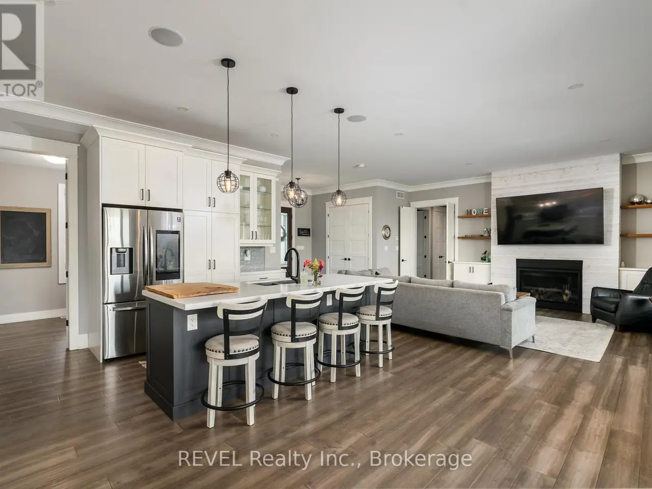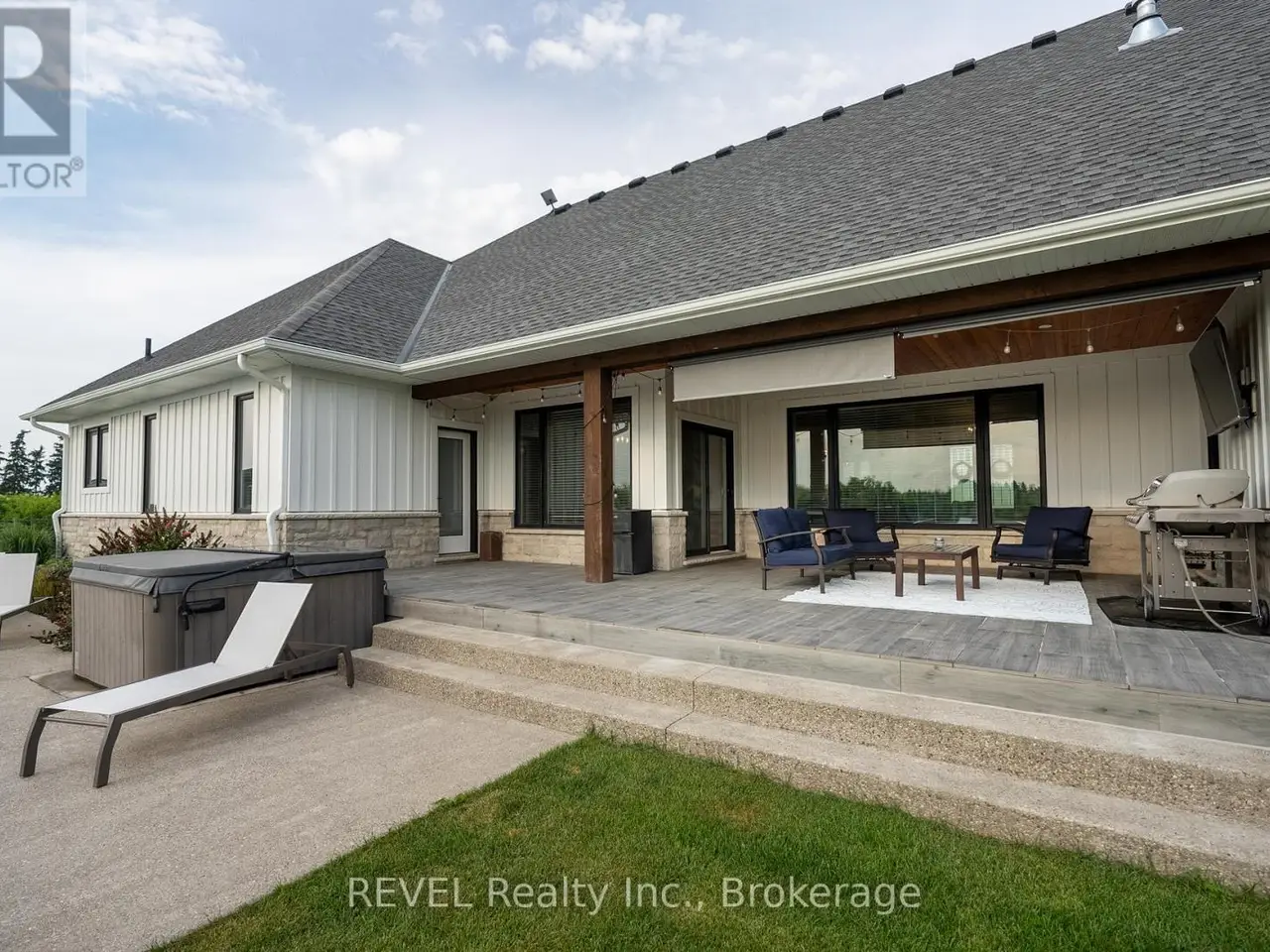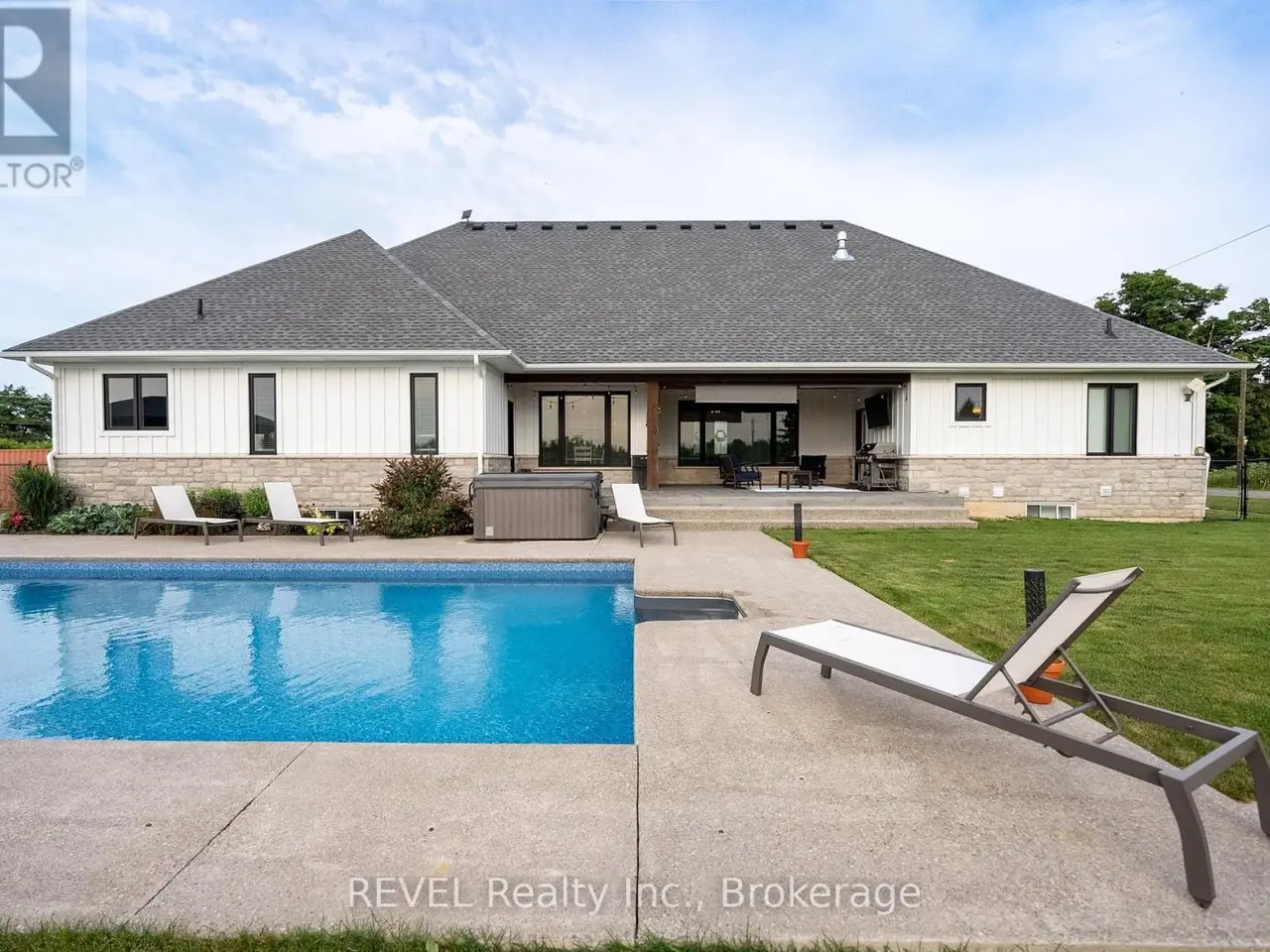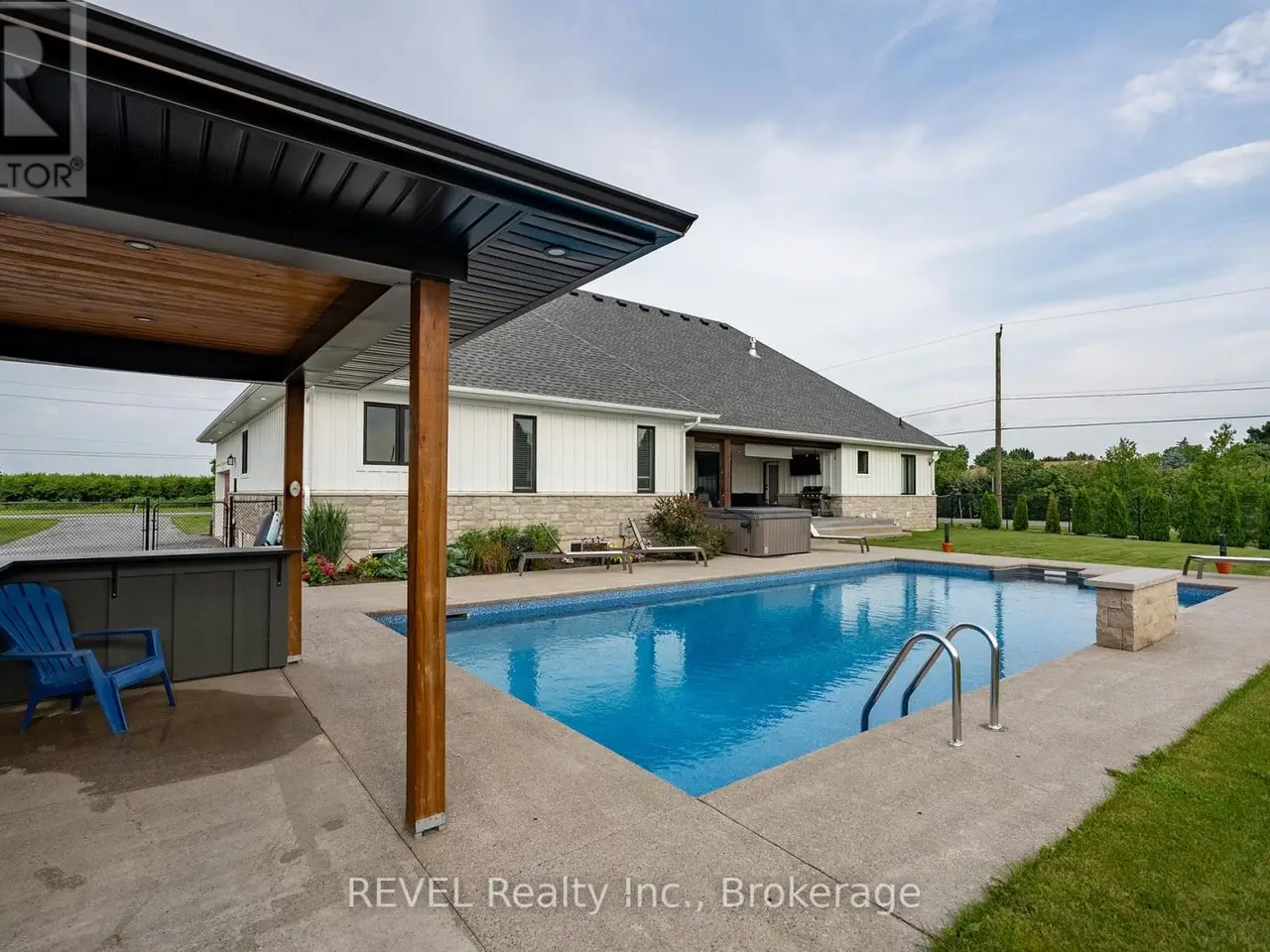Welcome to this stunning 2,945 sq. ft. bungalow, expertly crafted with a blend of stone and Hardie board exterior. From the moment you step inside, you'll be greeted by the expansive open concept living area, featuring soaring 10-ft ceilings and no carpets. The heart of the home is the gourmet kitchen, boasting Quartz countertops throughout, a large island with bar stool seating, stainless steel appliances, abundant counter and cupboard space, and a spacious pantry. The main floor master bedroom wing is a true retreat, complete with a coffered ceiling, a generous walk-in closet, and a luxurious 5-piece ensuite. Enjoy private access to the rear yard from your master bedroom. The main floor also offers a versatile office (or potential fourth bedroom), two additional bedrooms with walk-in closetsone with a private 4-piece ensuite and the other with ensuite privilege and a 2-piece powder room off the foyer. The mudroom off the garage features a laundry area and barn-style roller door. The fully finished basement includes a large rec room with a kitchenette, an additional bedroom, and a 3-piece bathroom with a spacious glass shower. With 9-ft ceilings and a heated slab, the basement is as comfortable as it is functional. Outdoor living is equally impressive, with a covered rear patio complete with TV hookup, BBQ line, and pull-down privacy screens. Relax in the inground heated saltwater pool, unwind in the hot tub, or enjoy the fully fenced, landscaped yard with a stone wall surround. The property, just under an acre, is surrounded by picturesque vineyards and fruit farms. Additional features include an insulated 2-car garage with hot water hookup, city water, an interior and exterior wired-in speaker system, a security system, and central vac. This exquisite home offers the perfect blend of luxury, comfort, and tranquility. (id:7434)